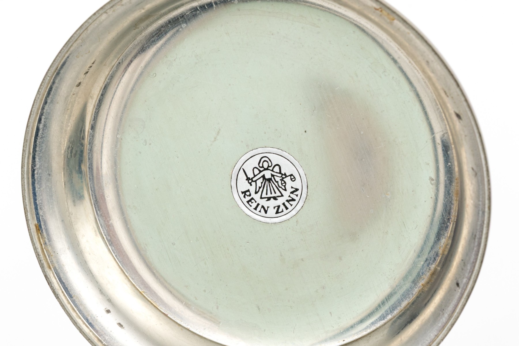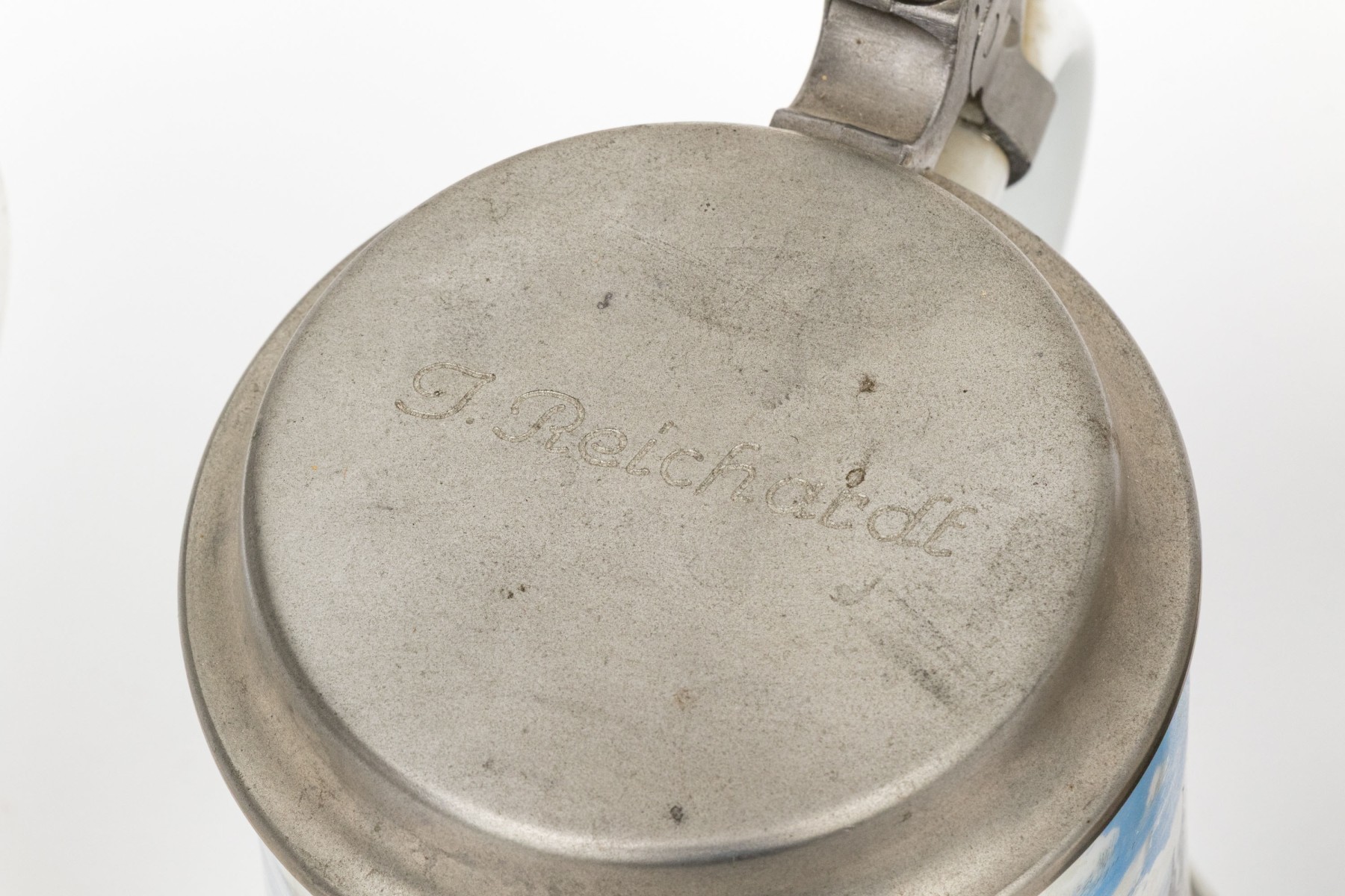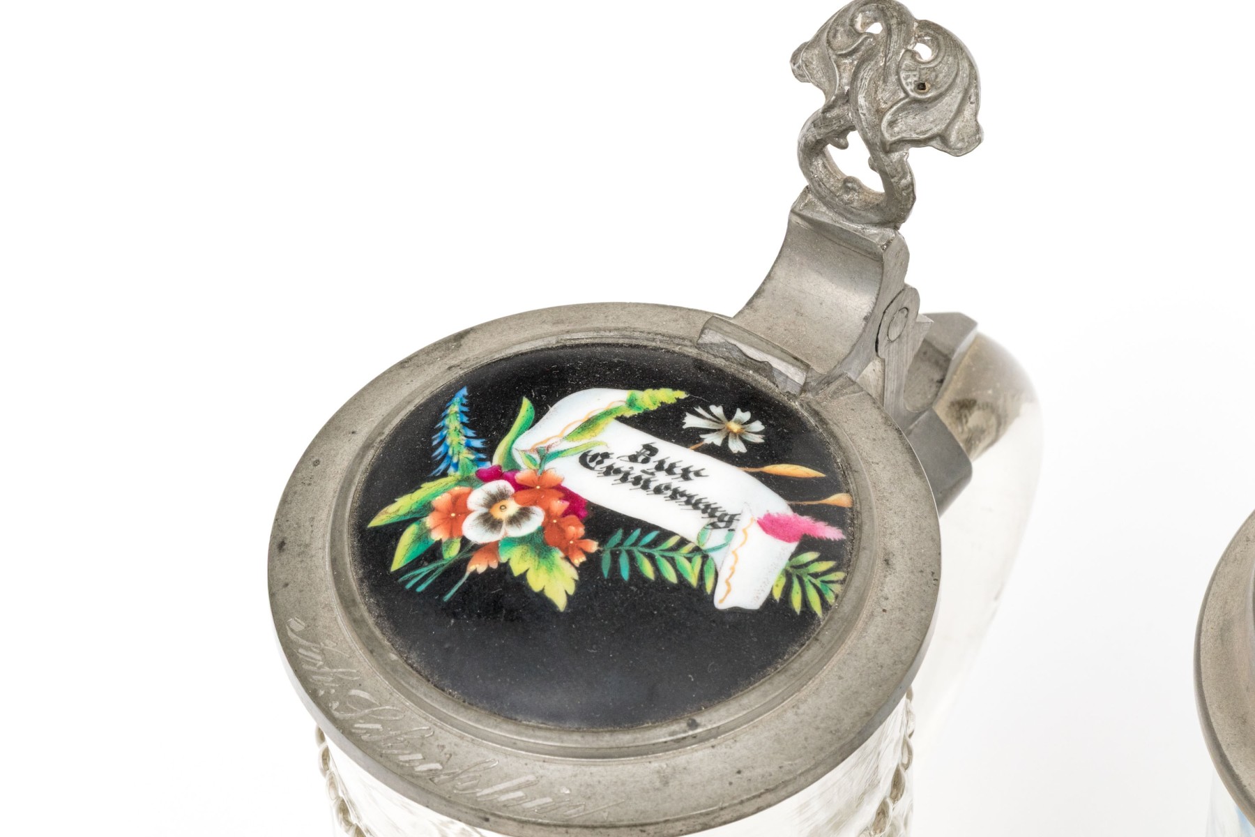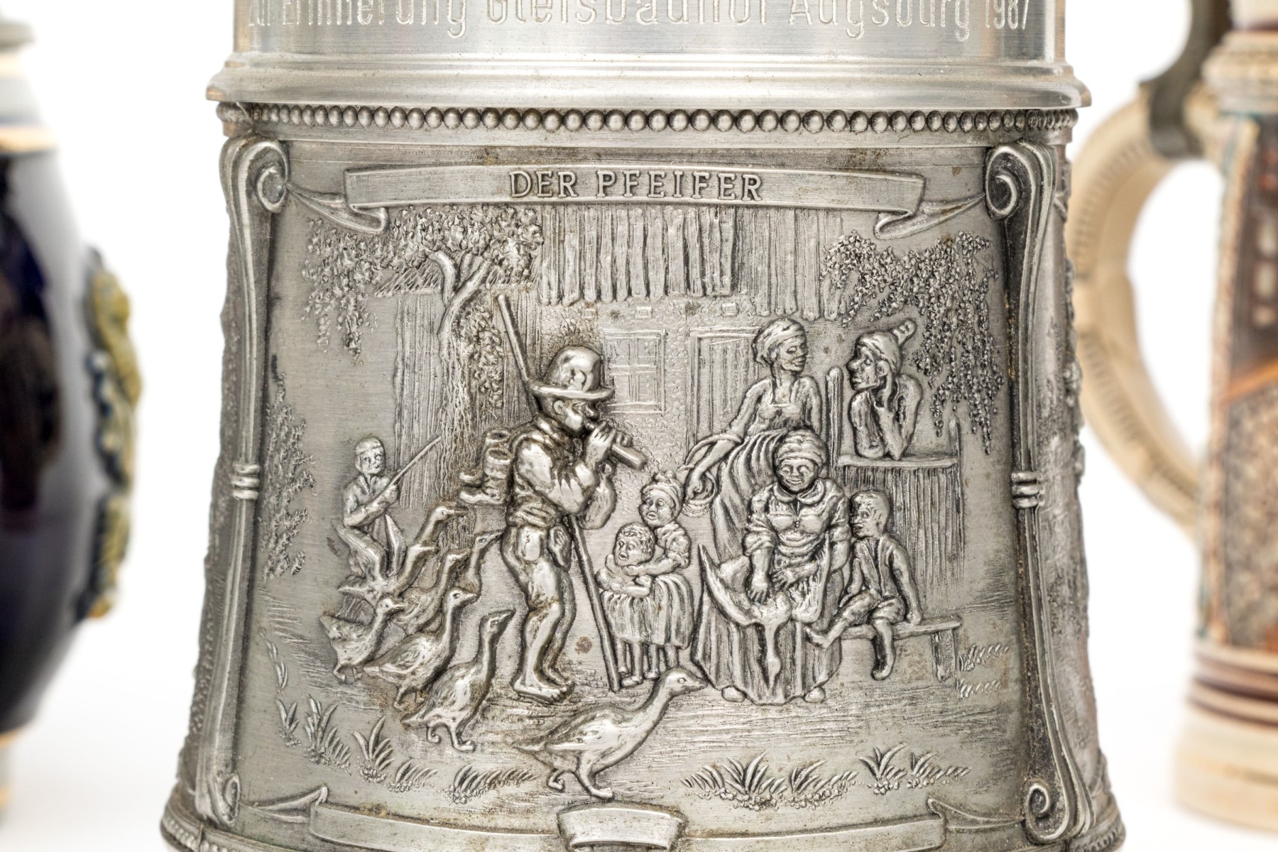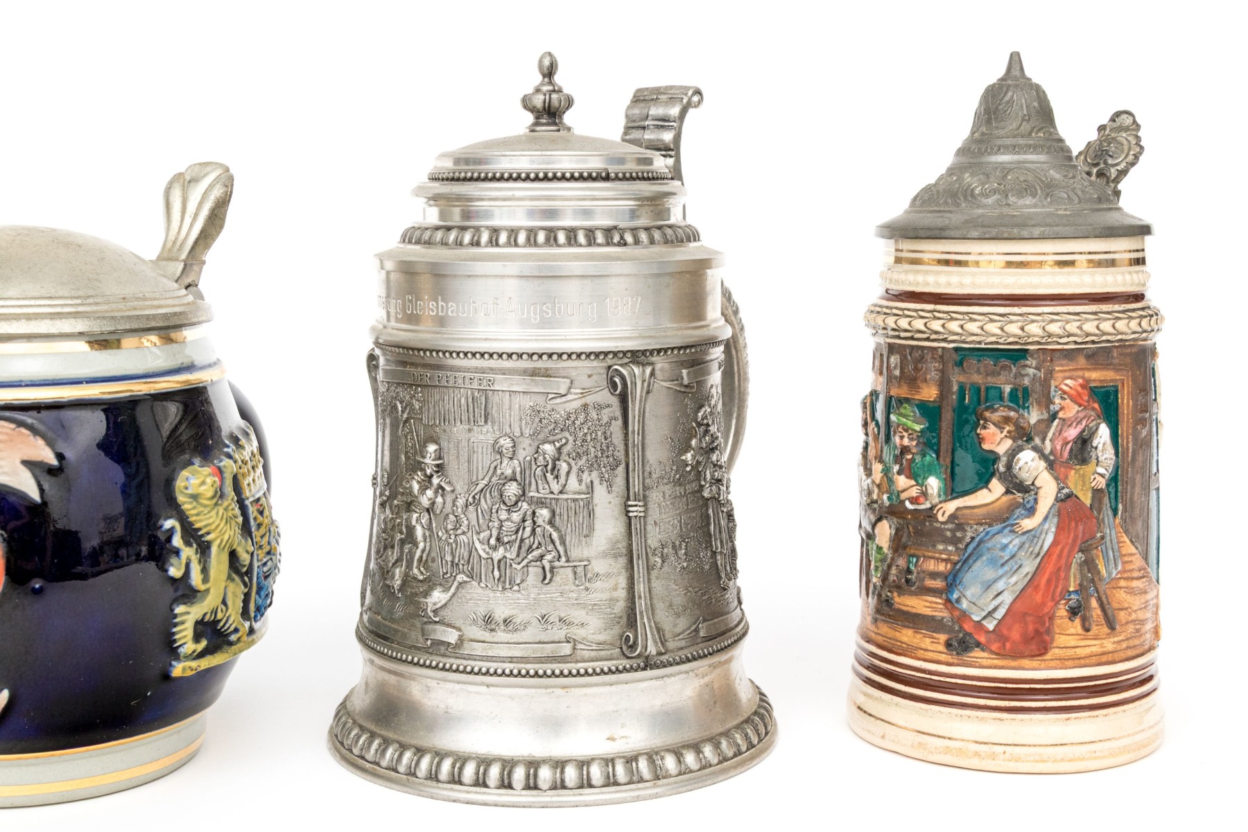 A metal one and a ceramic one with tavern scenes.