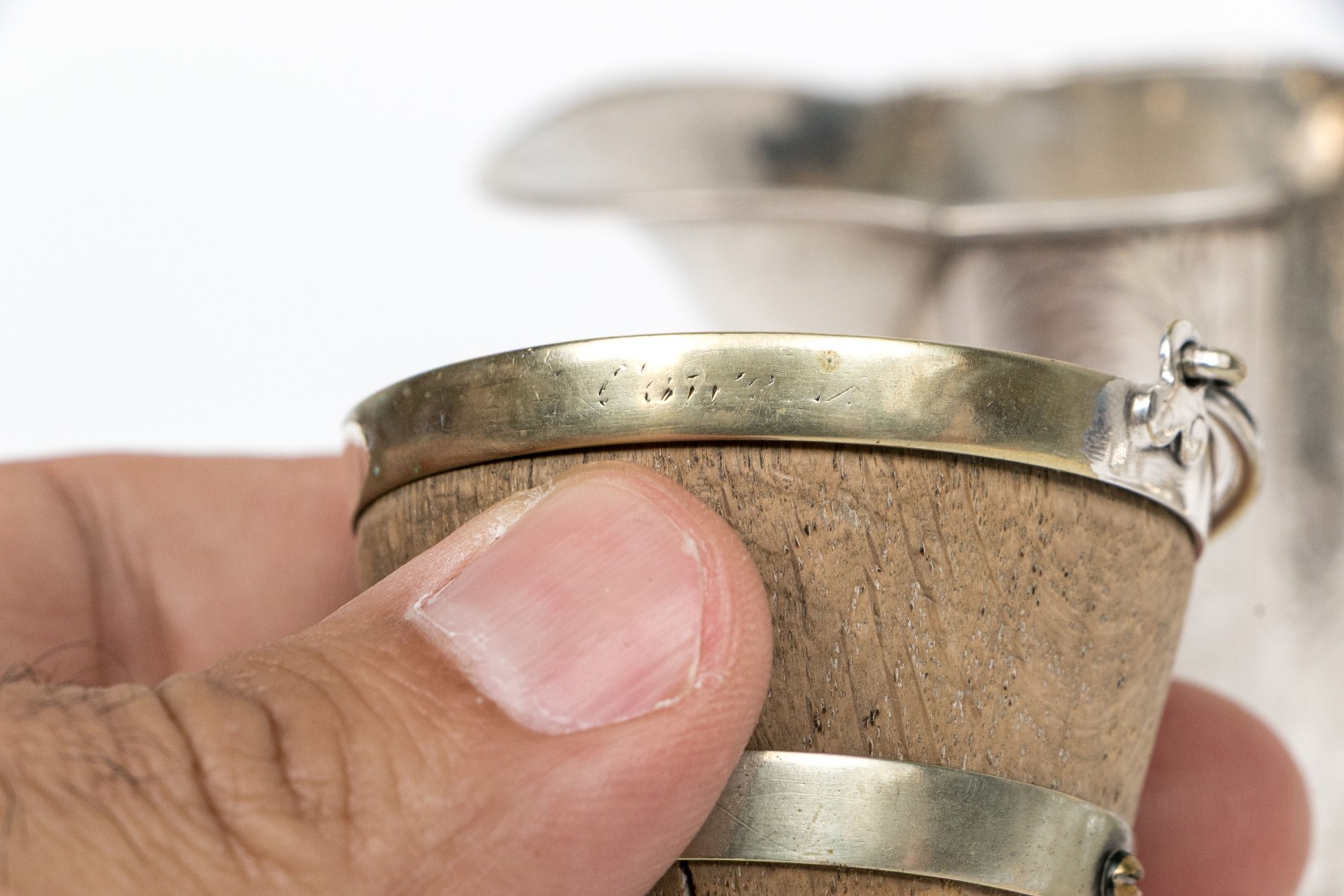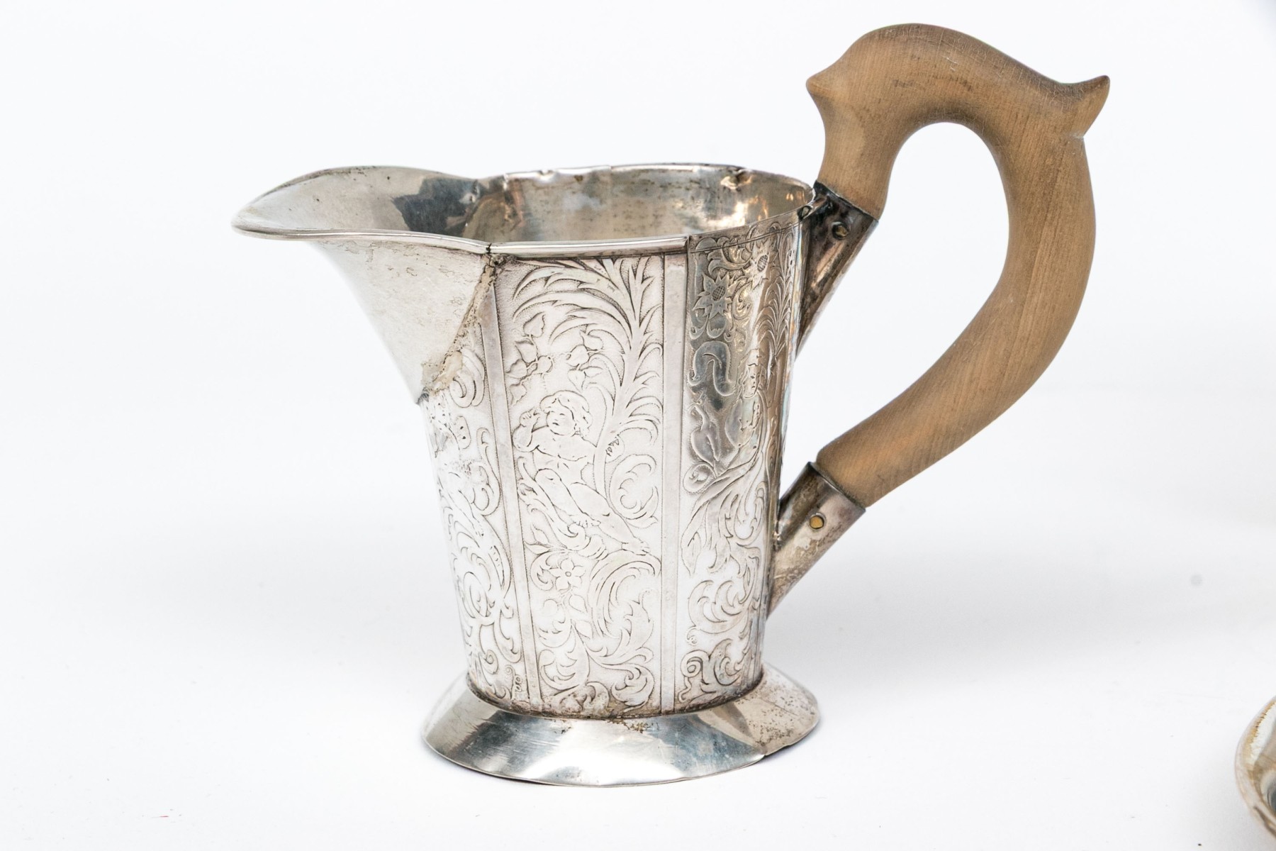 a coin silver wood handled creamer with chased foliate decoration with putti