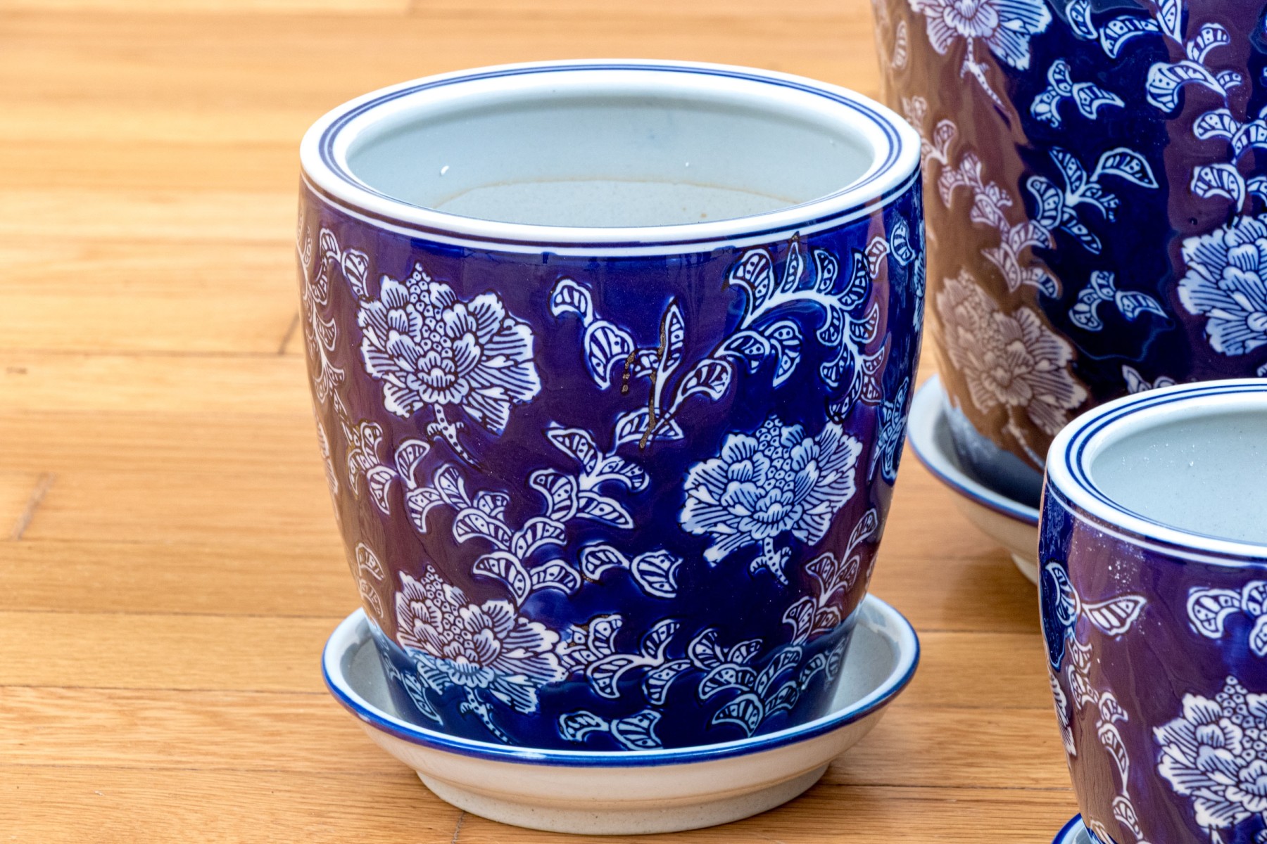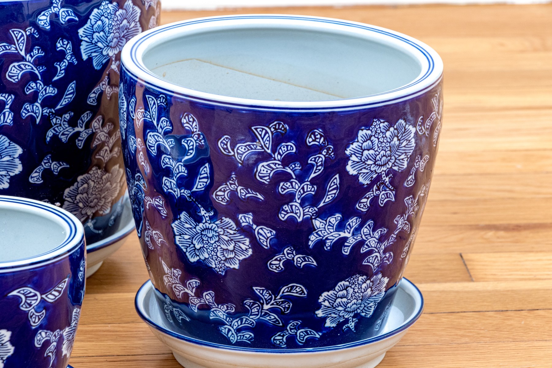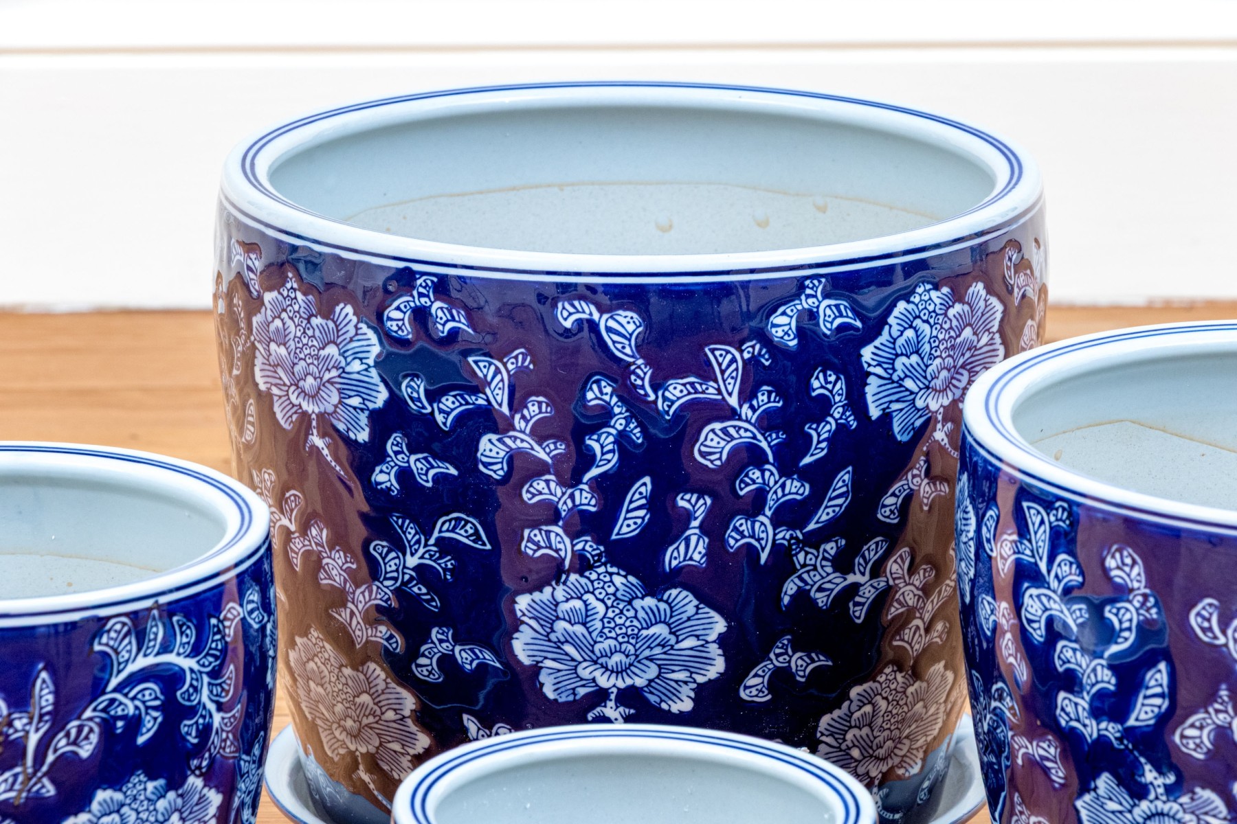 A delightful set of four ceramic jardinieres with rich cobalt blue chinoiserie designs of flowers on vining foliage across the exteriors, finished with simple white interiors. The jardinieres come in graduating sizes and includes undertrays.
