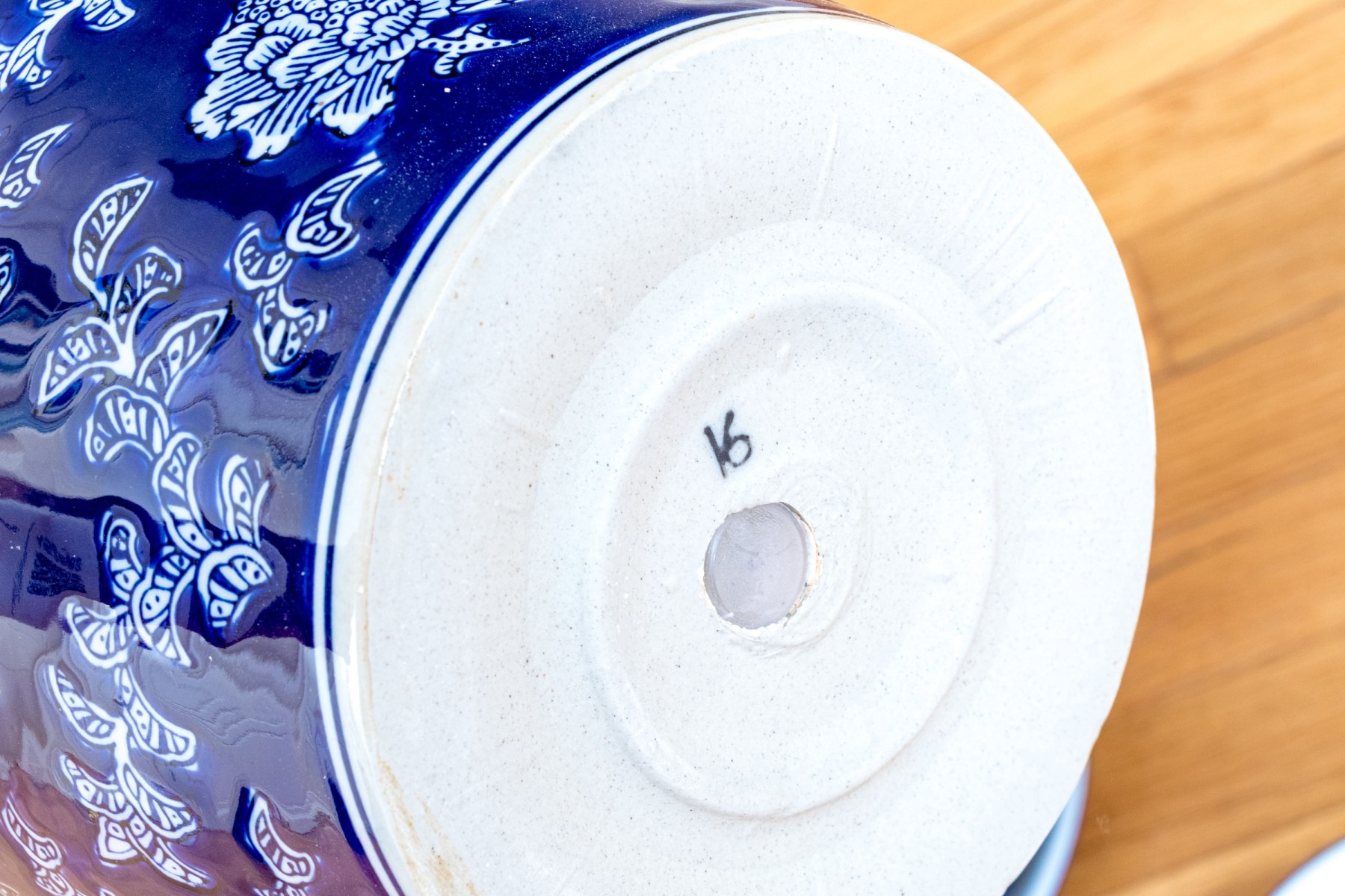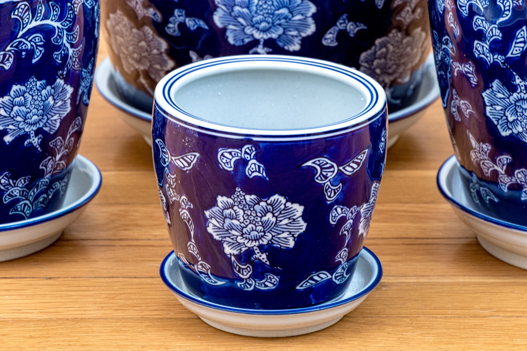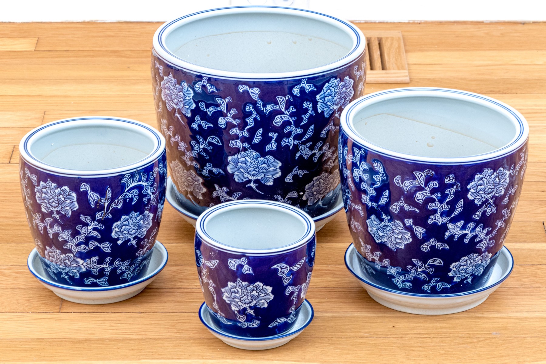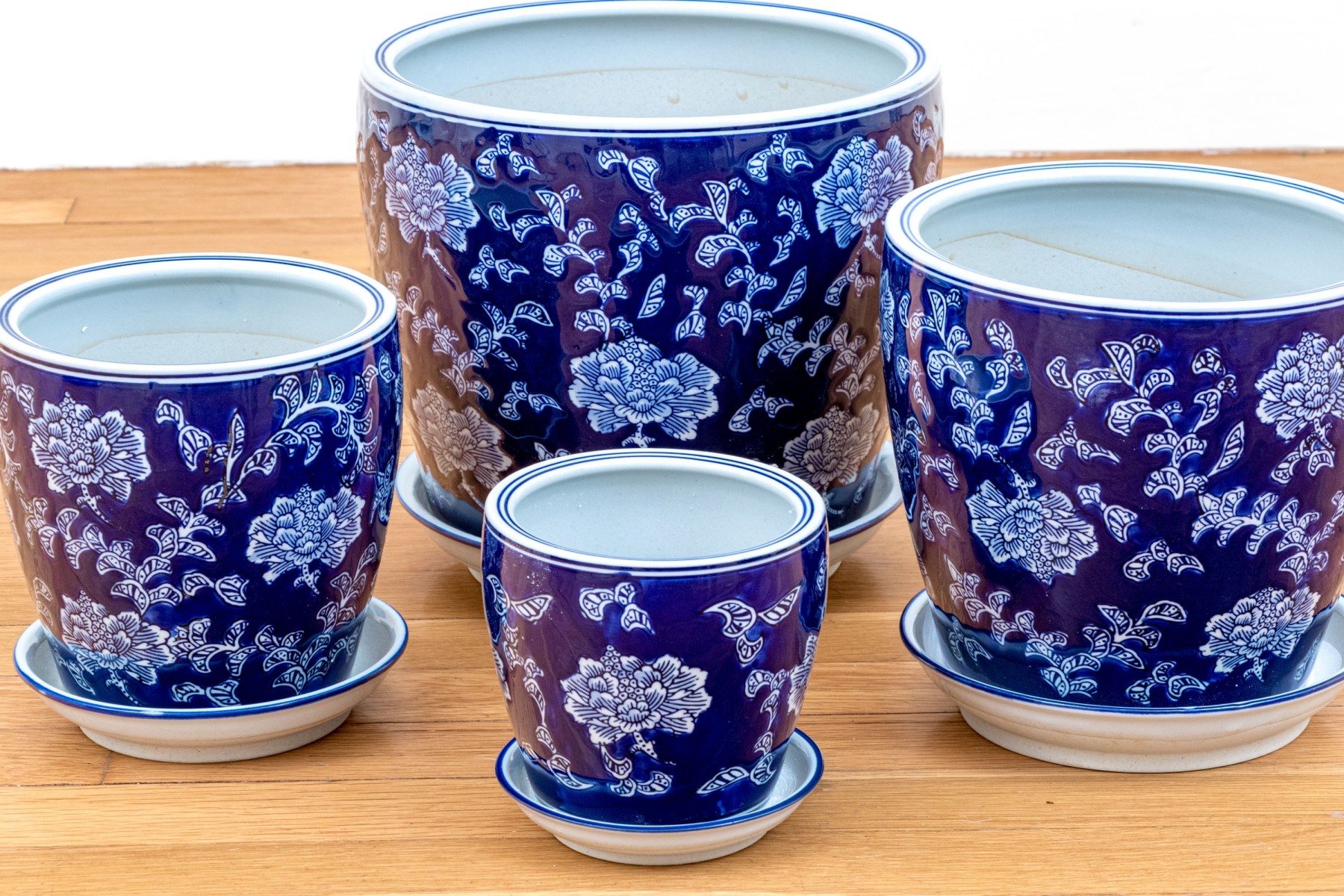 A delightful set of four ceramic jardinieres with rich cobalt blue chinoiserie designs of flowers on vining foliage across the exteriors, finished with simple white interiors. The jardinieres come in graduating sizes and includes undertrays.