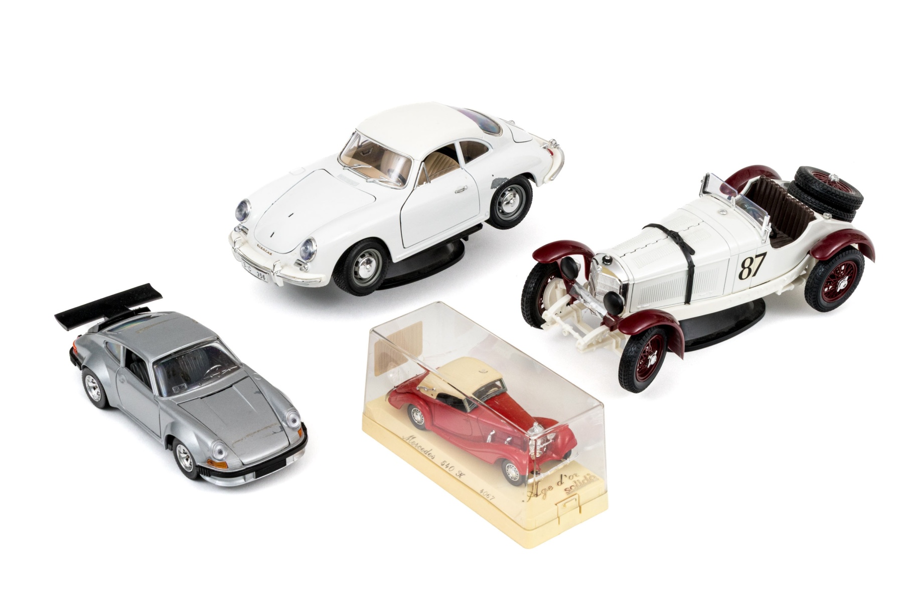 Of varied size, including a Porsche 911 model in white, a Porsche 911 in grey with a black spoiler, a red Mercedes 540 K 4067 in case marked Age d'or Solido, and an antique Bugatti.