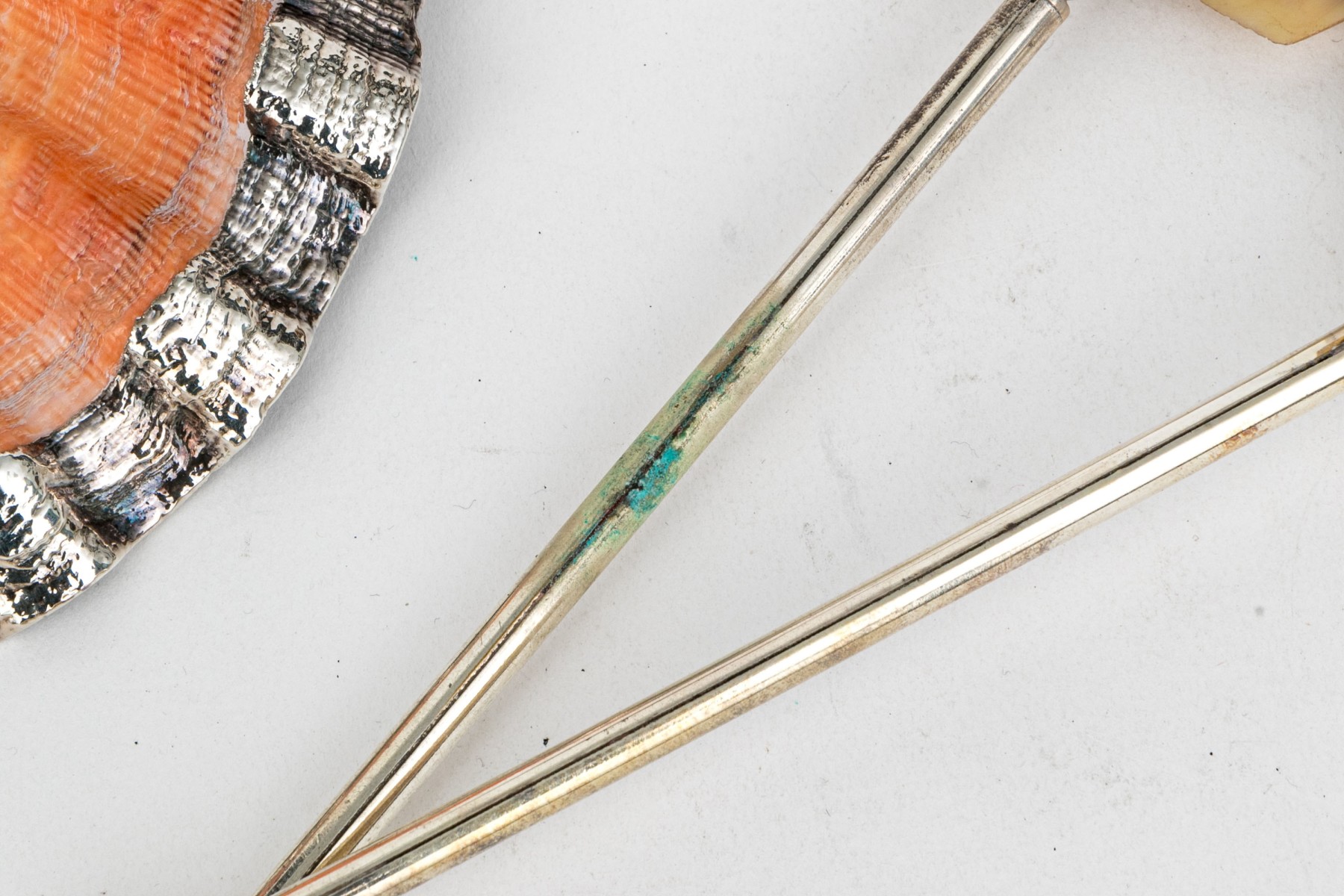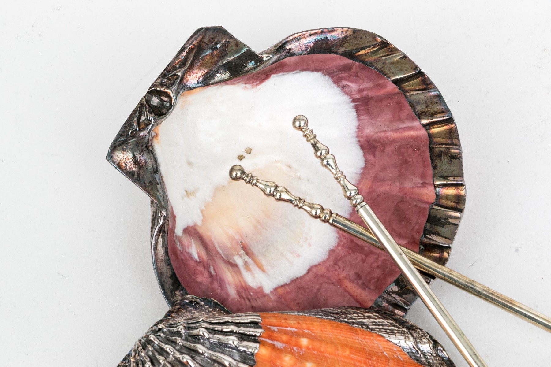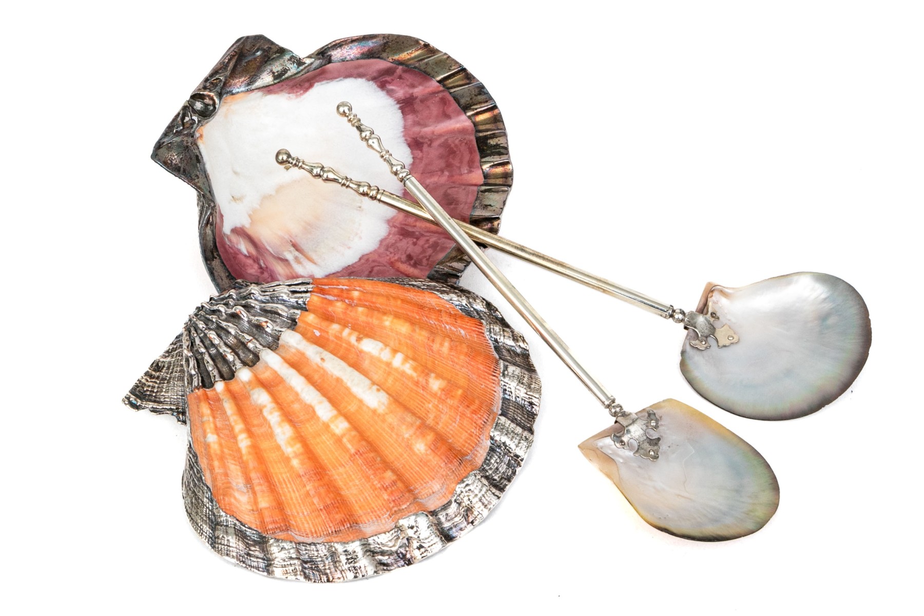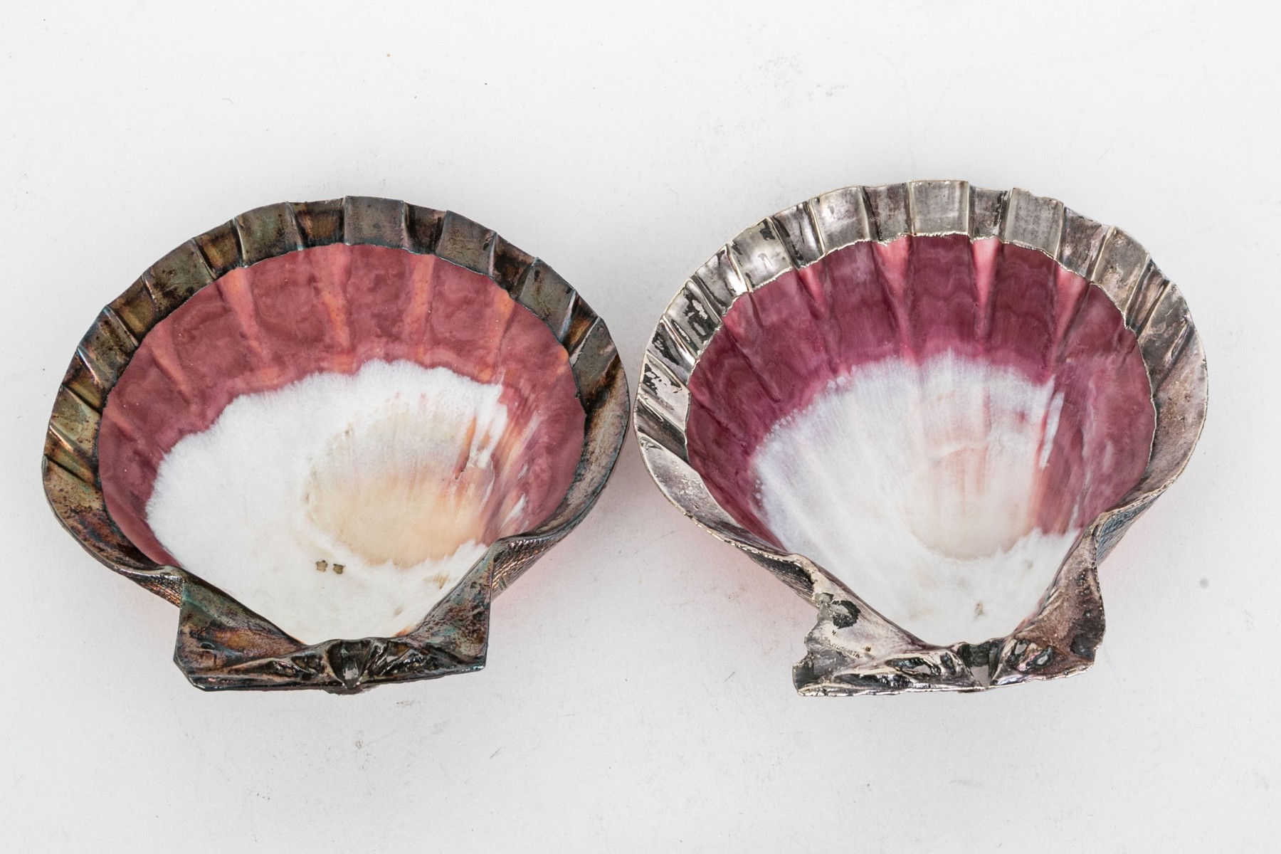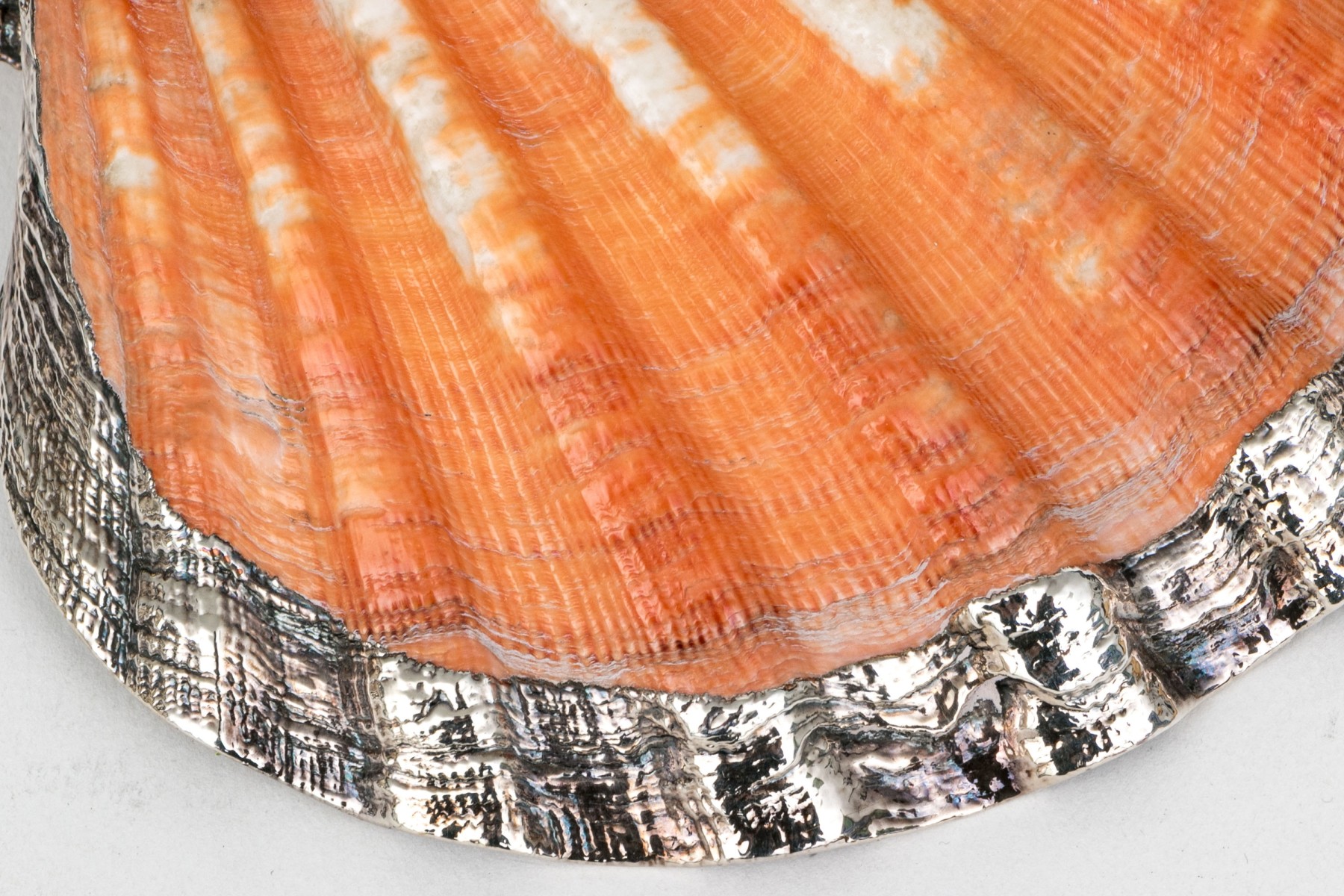 - A pair of beautiful orange and pink on white scallop shells with silver mounts made in Italy.