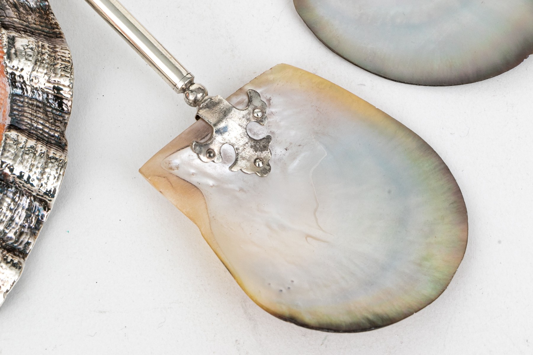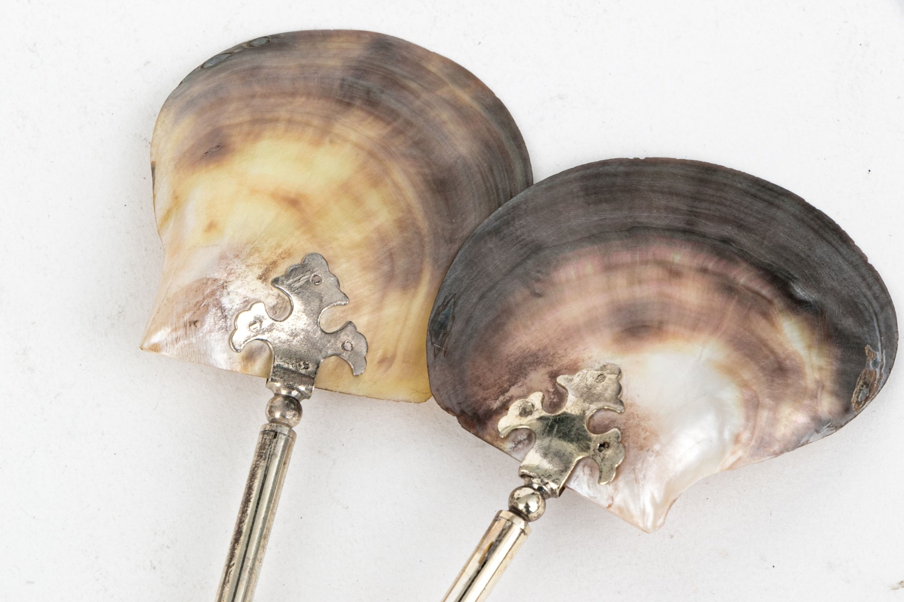 - Pair of spoons with mother-of-pearl shell bowls on silverplate handles