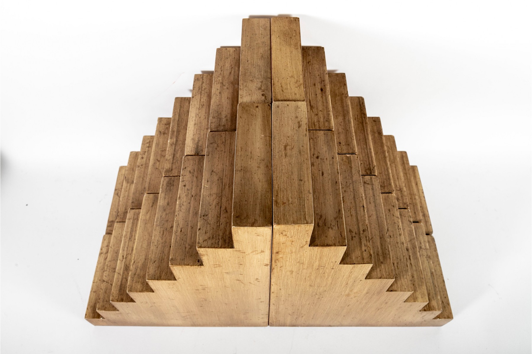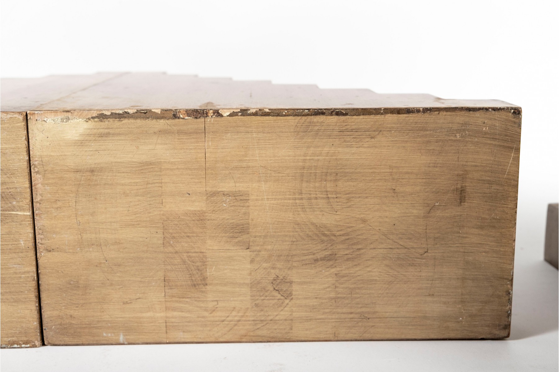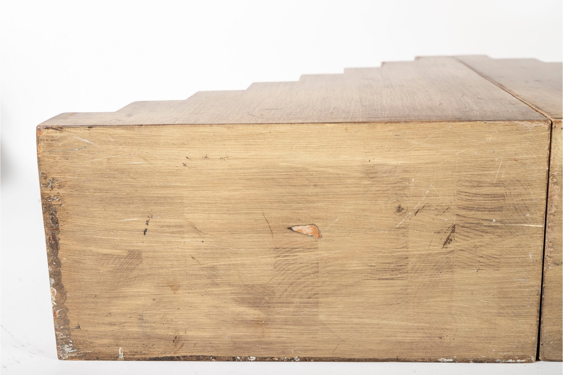 A group of four large and weighty wood decor pieces in the shape of stairs, with stepped triangular forms in a dappled olive-brown hued finish.