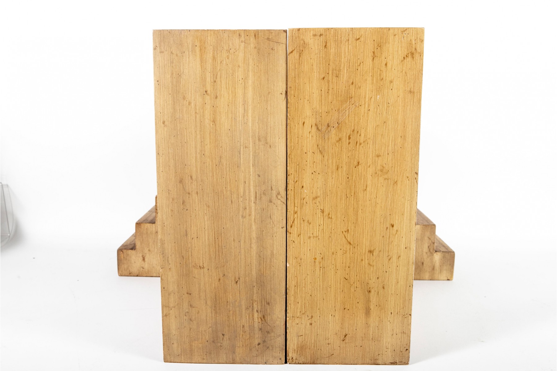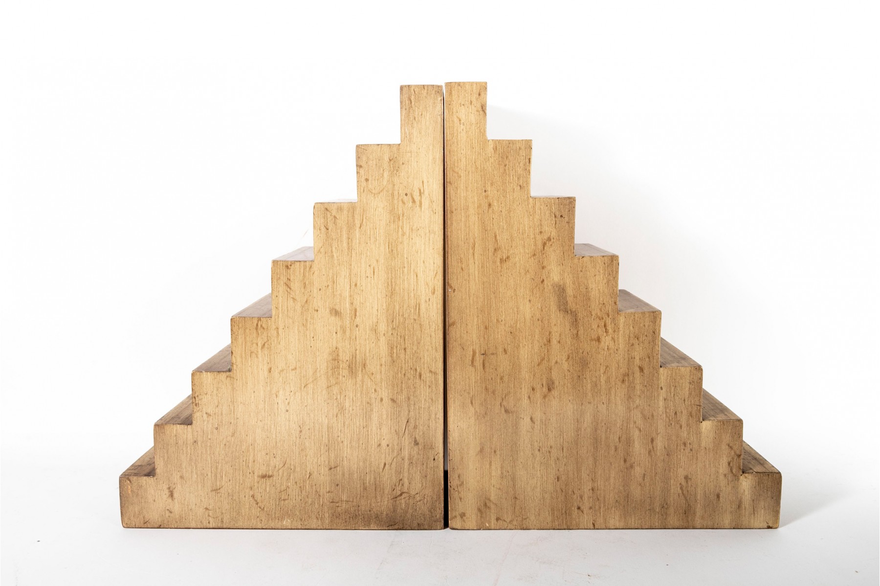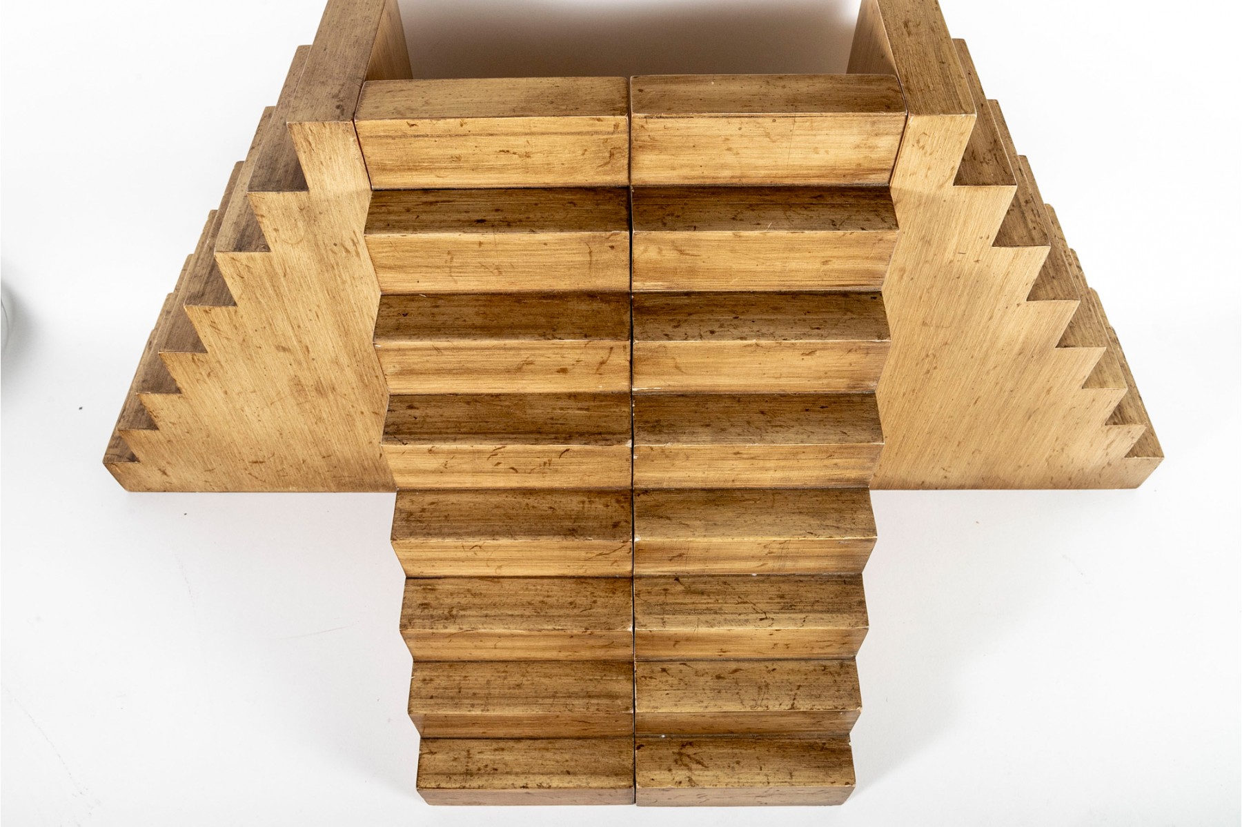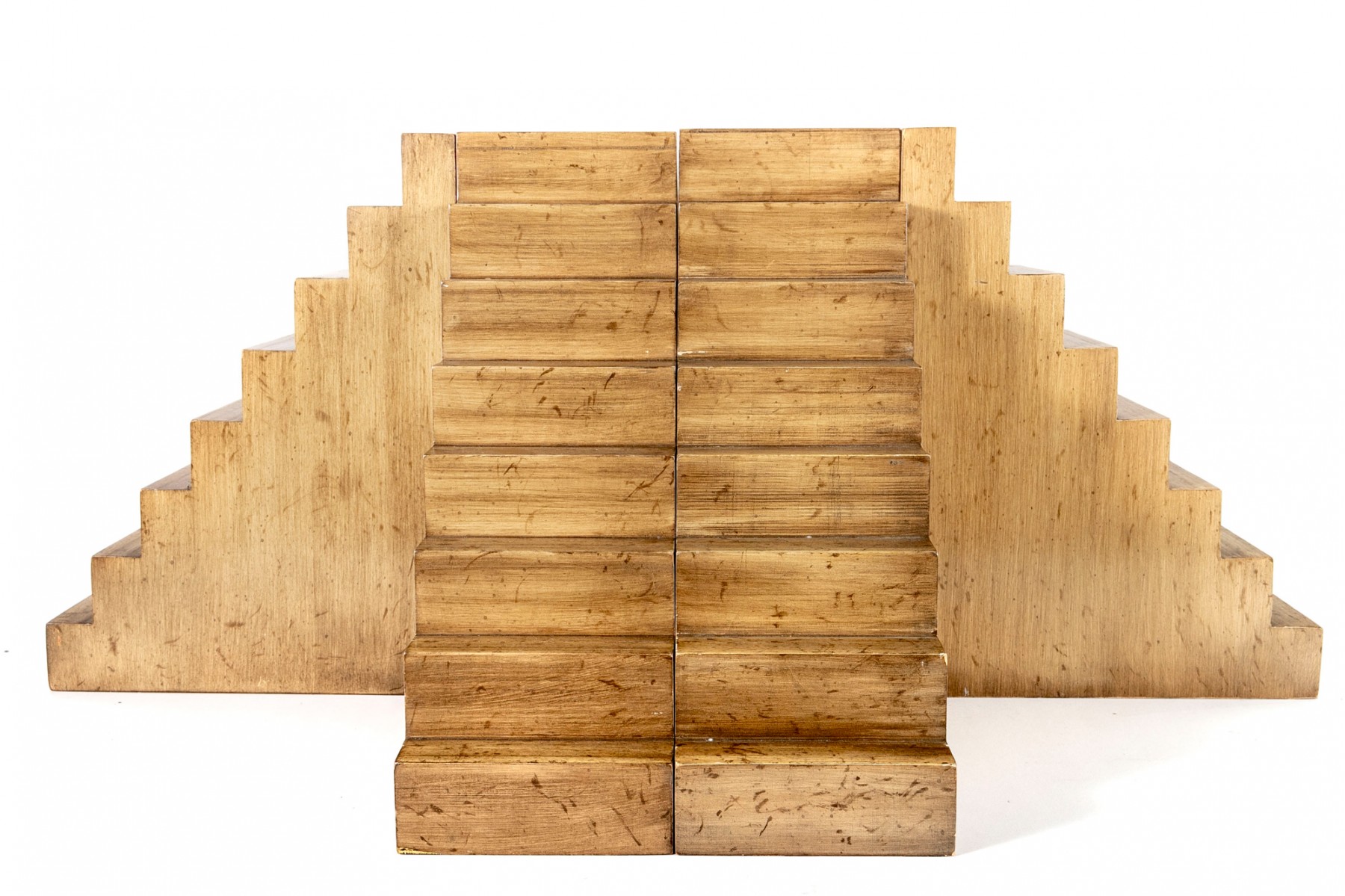 A group of four large and weighty wood decor pieces in the shape of stairs, with stepped triangular forms in a dappled olive-brown hued finish.