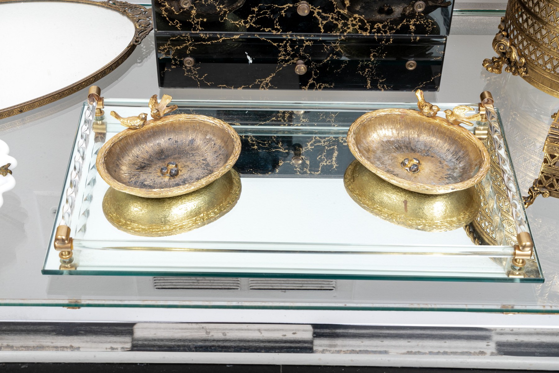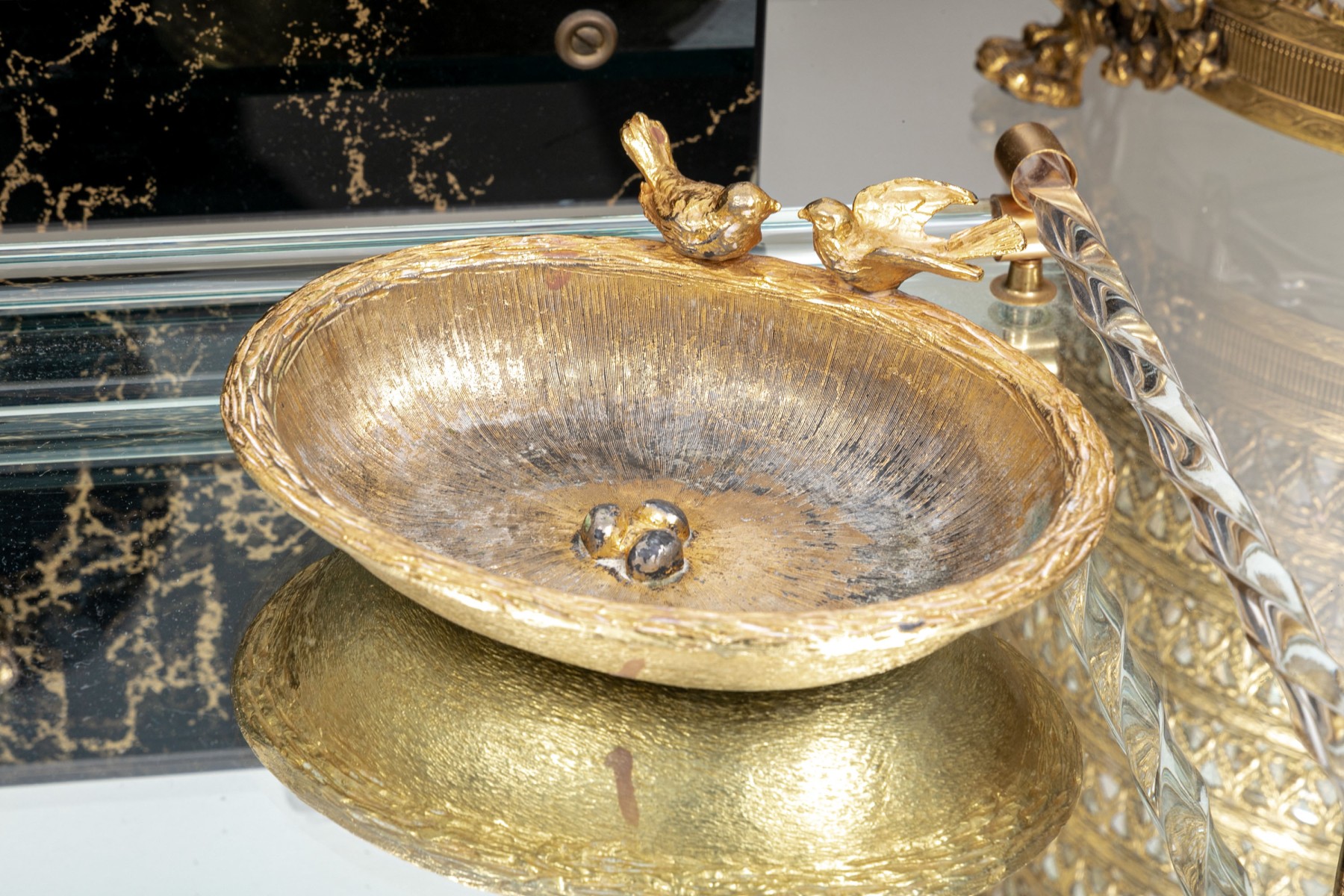 (2) gold soap dishes with birds, 5" W x 4" D
