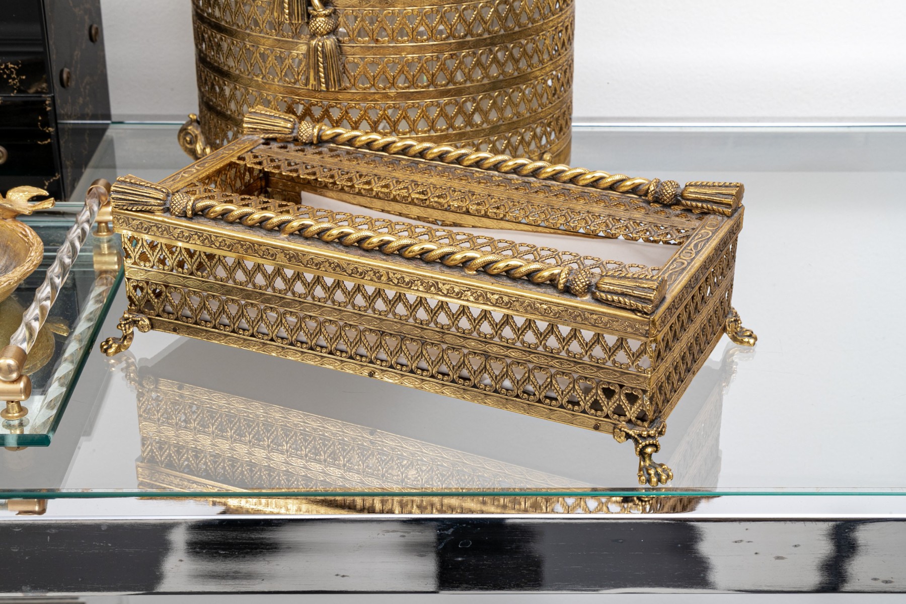 Gold filigree tissue box, footed, tasseled, 10" x 5 1/4" x 3 1/4" H