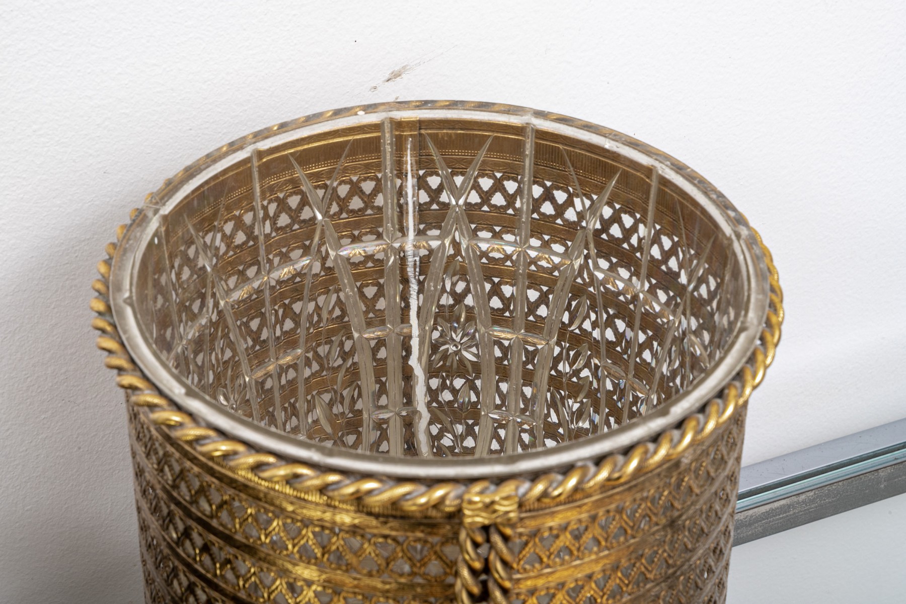 Gold filigree wastepaper pail with clear plastic liner, footed, tasseled, 9" W x 10 3/8" H
