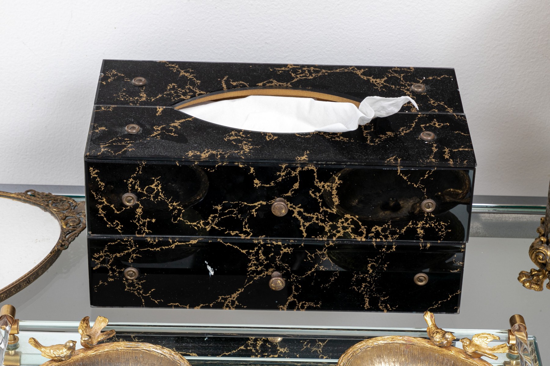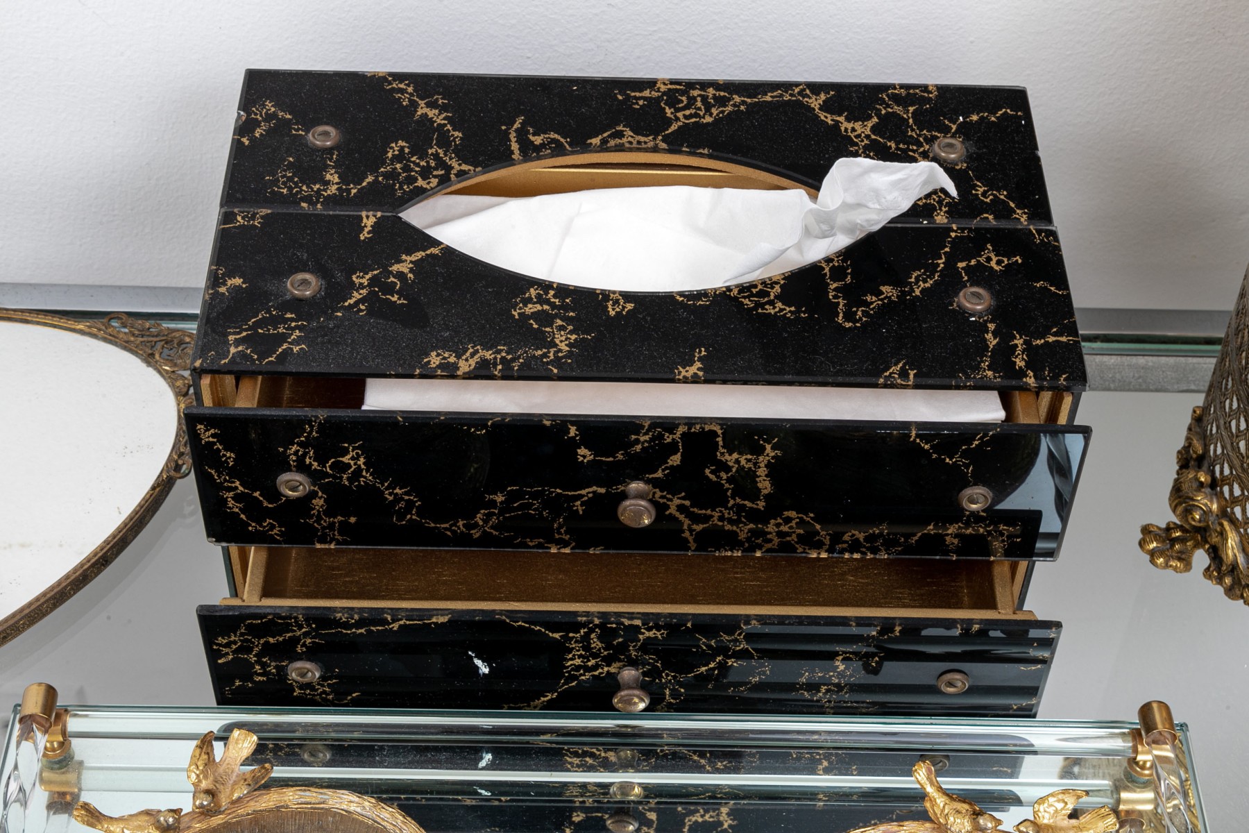 Glass cased two drawer tissue box, mid century, 6" x 11 1/4" L x 5 1/2" H