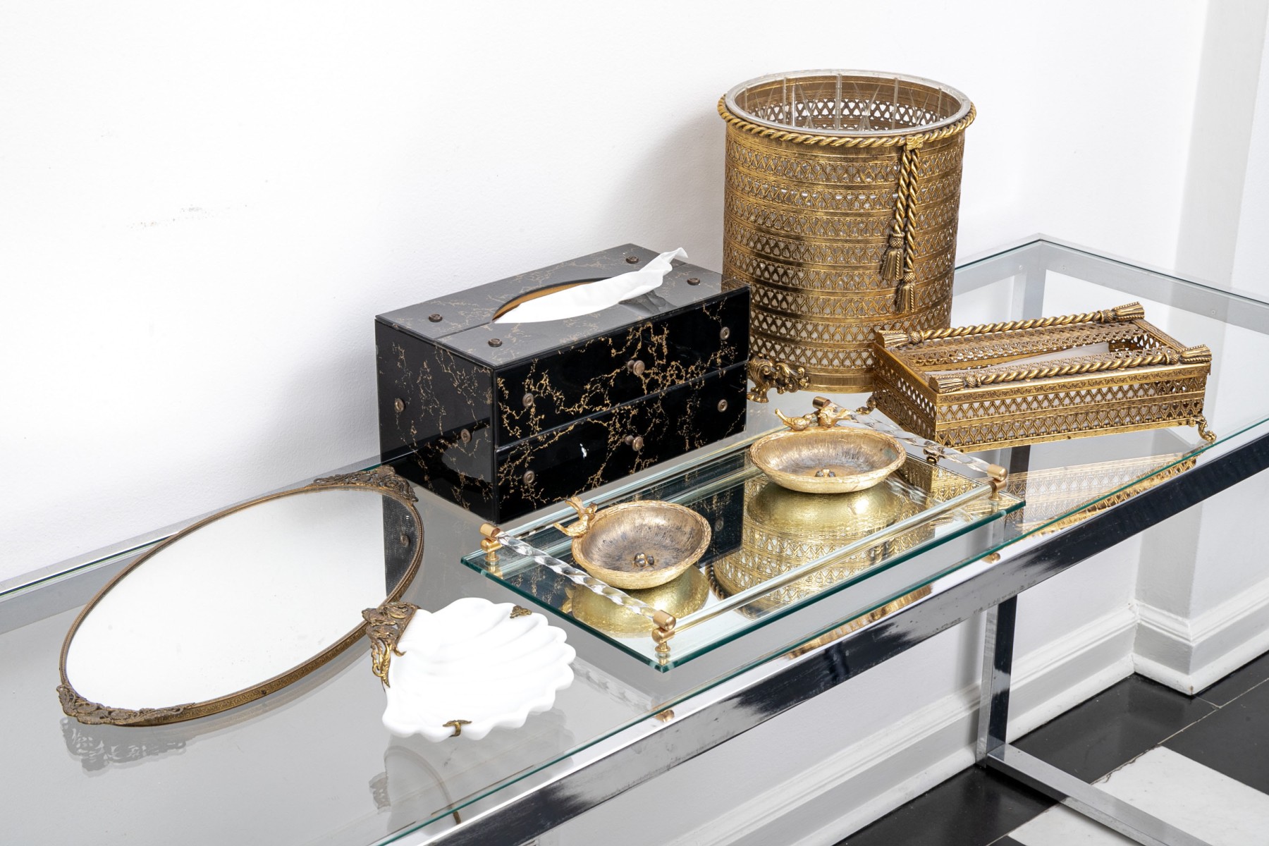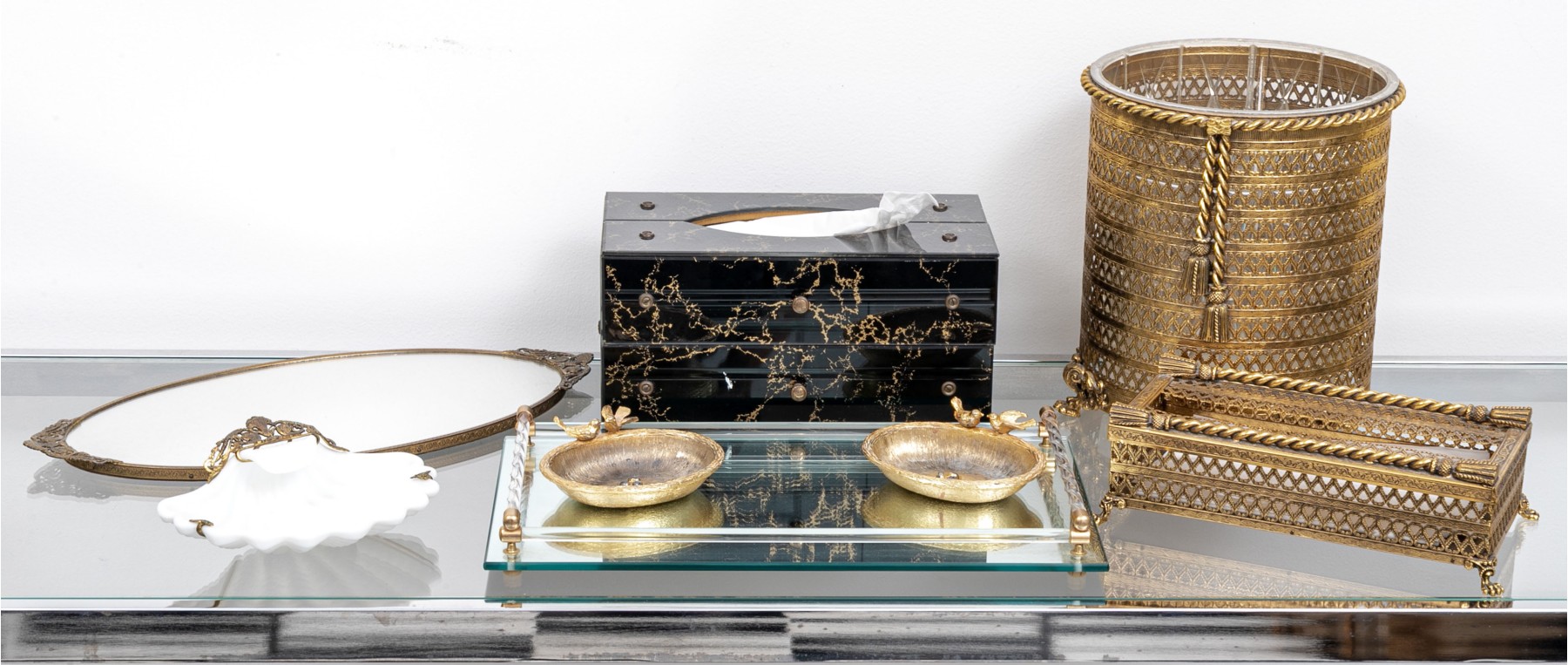 Condition: plastic pail liner with stains and wear; (2) soap dishes with losses to gold finish, tiny chip to corner of drawer of cabinet.