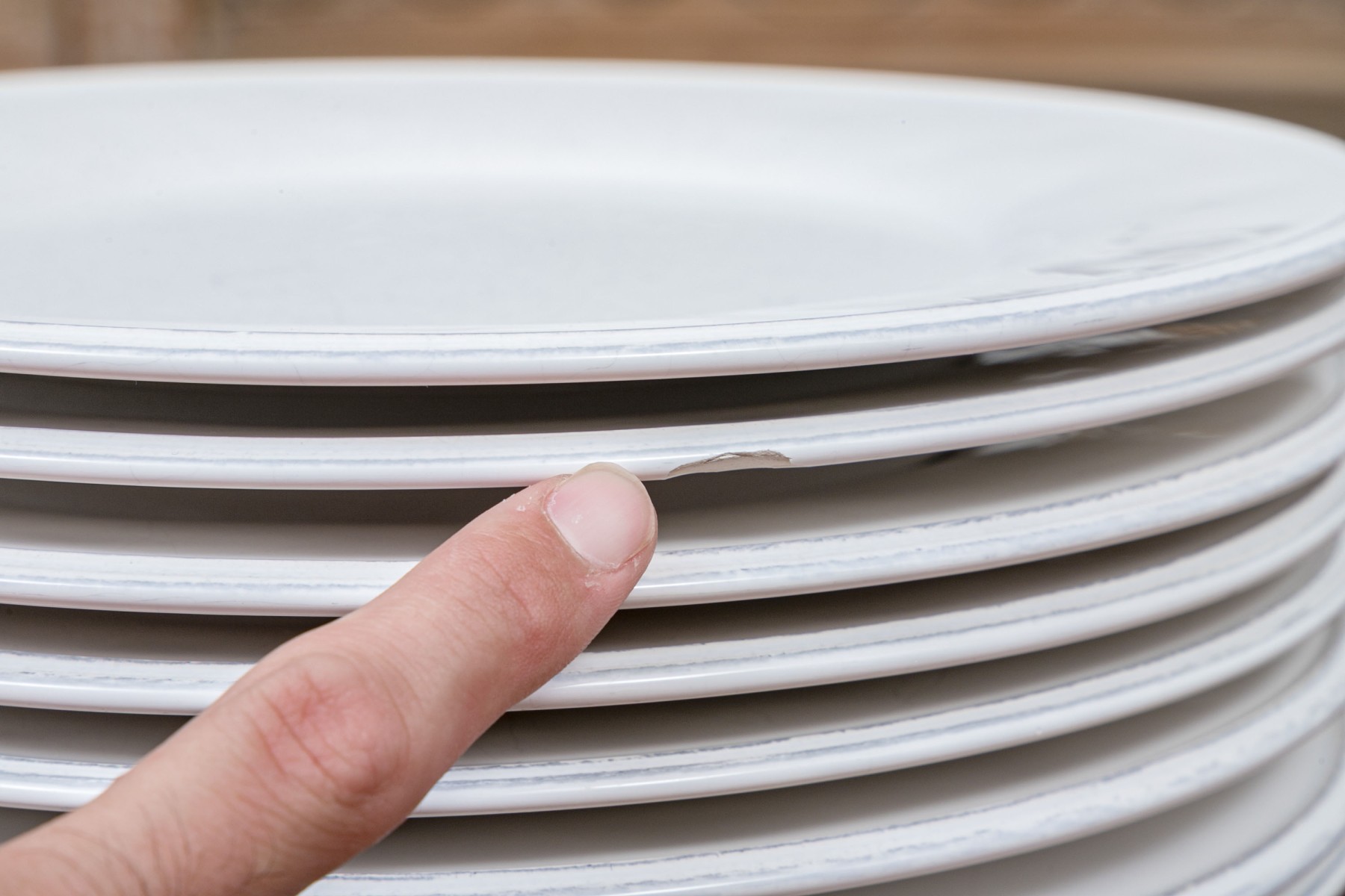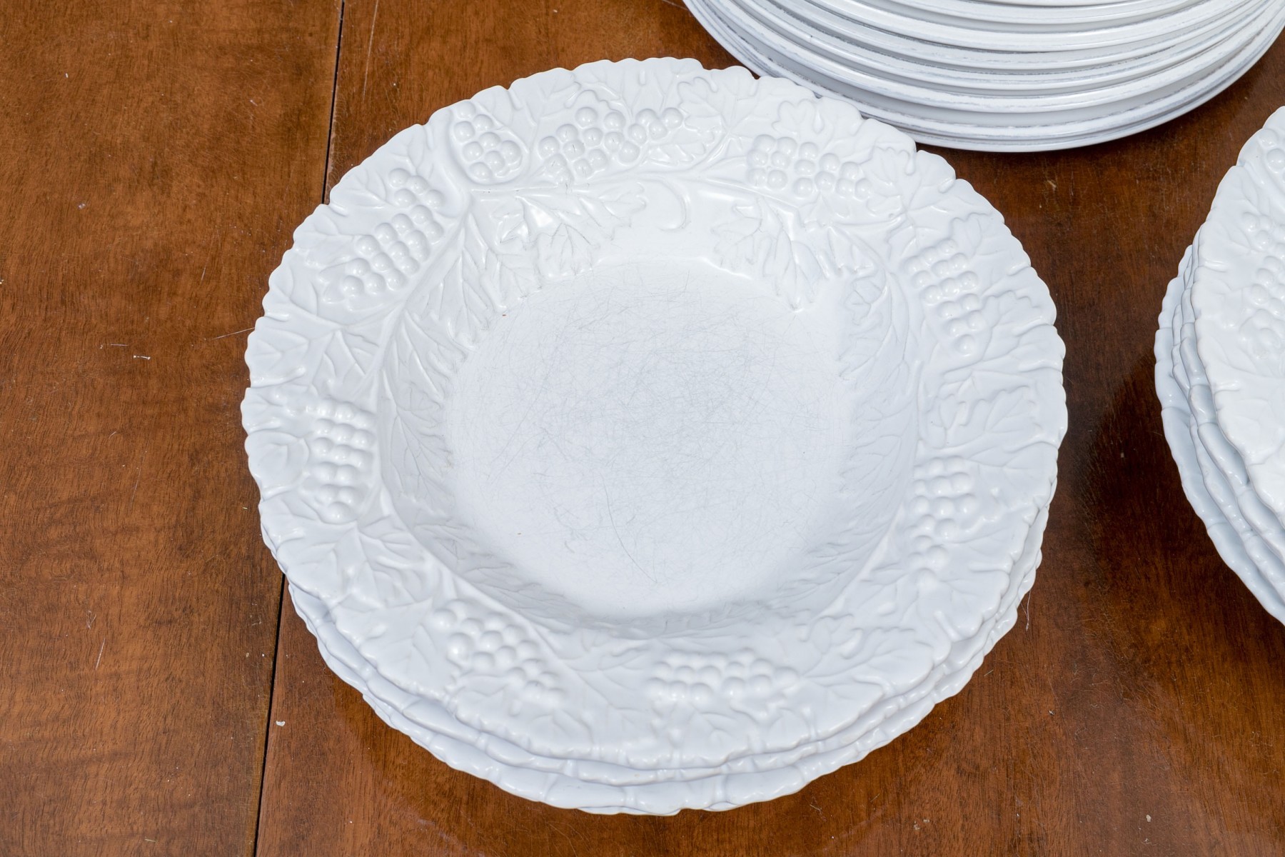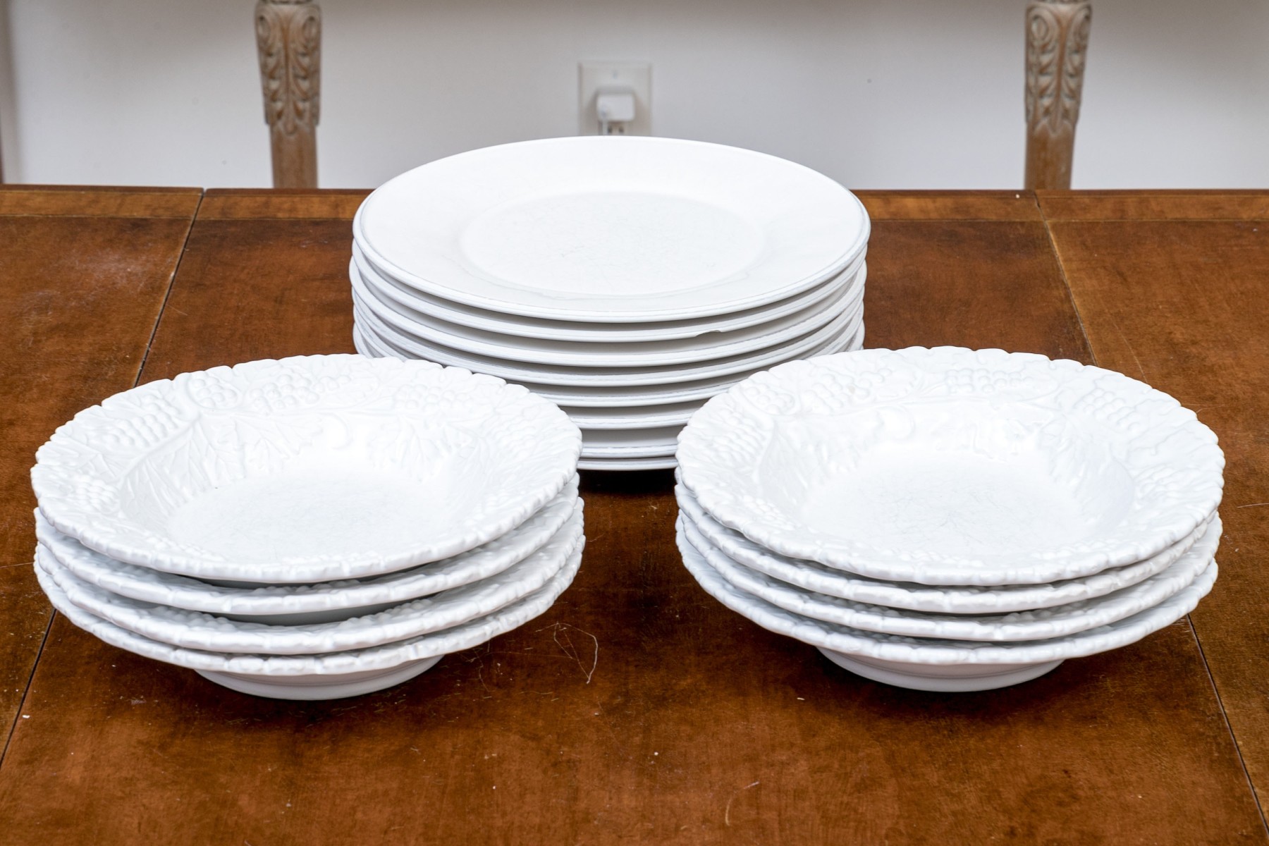 8 Italian white glazed dishes, 10 1/4” W (heavily worn, one with chip, surface scratches)