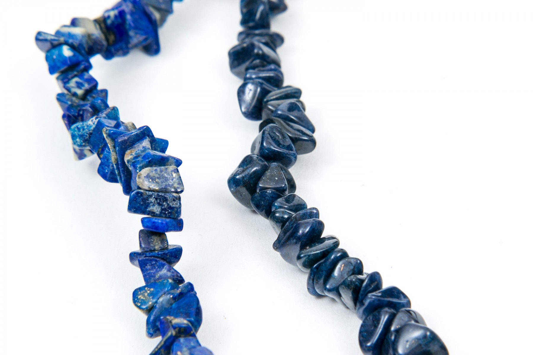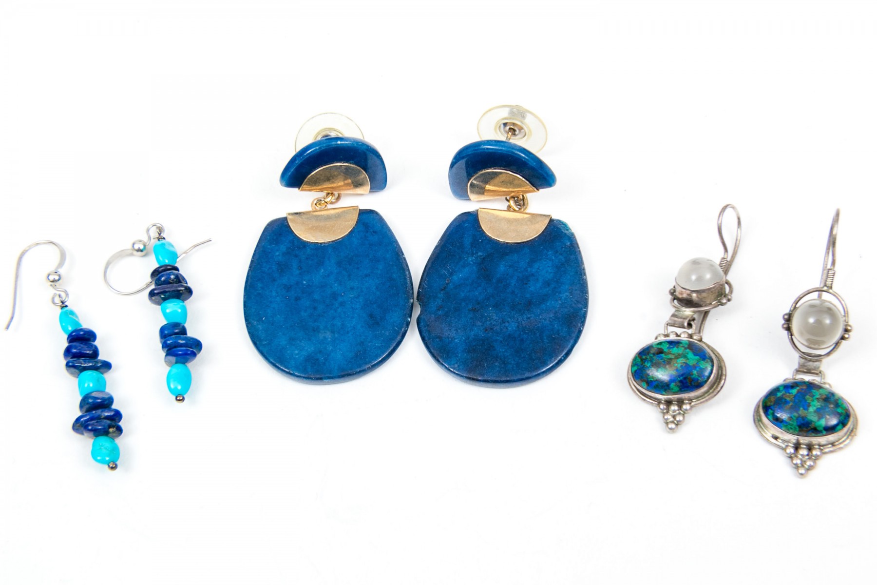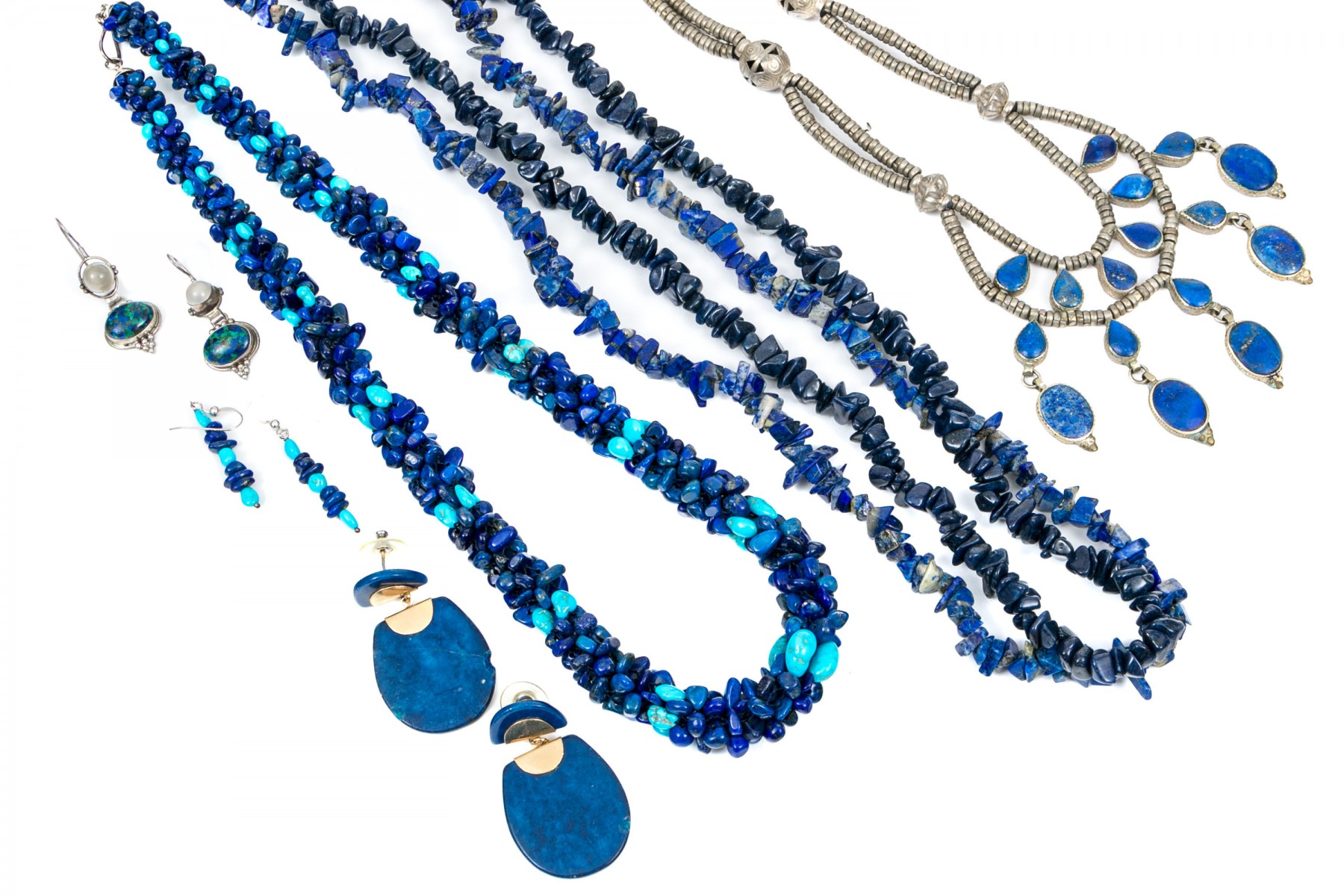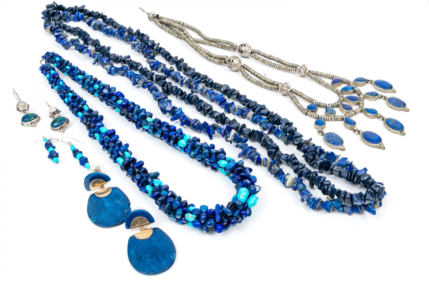 Lapis and sodalite jewelry. Three strung beaded necklaces and a unique double stranded necklace with stone inlay. Three pairs of stone inlay earrings.