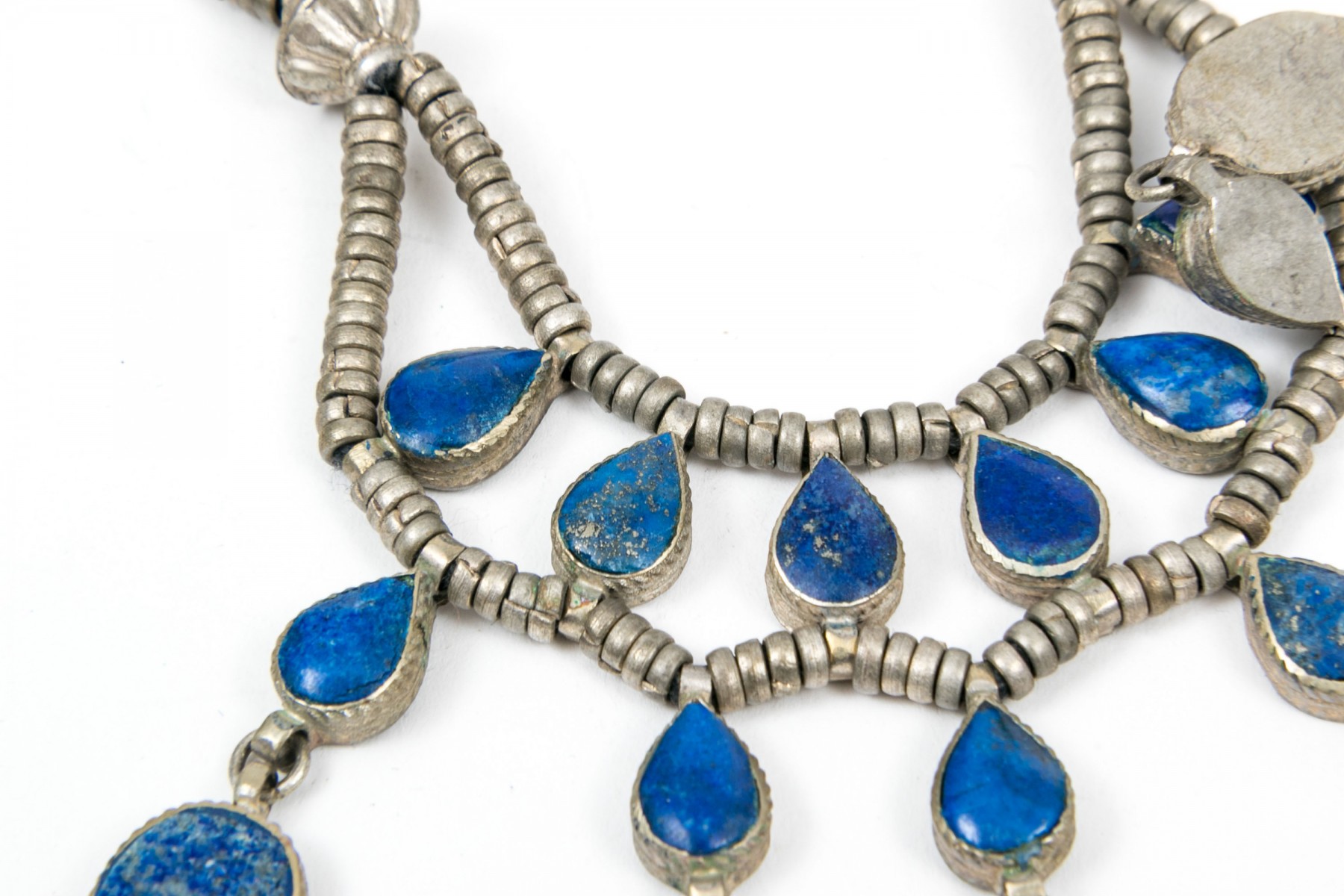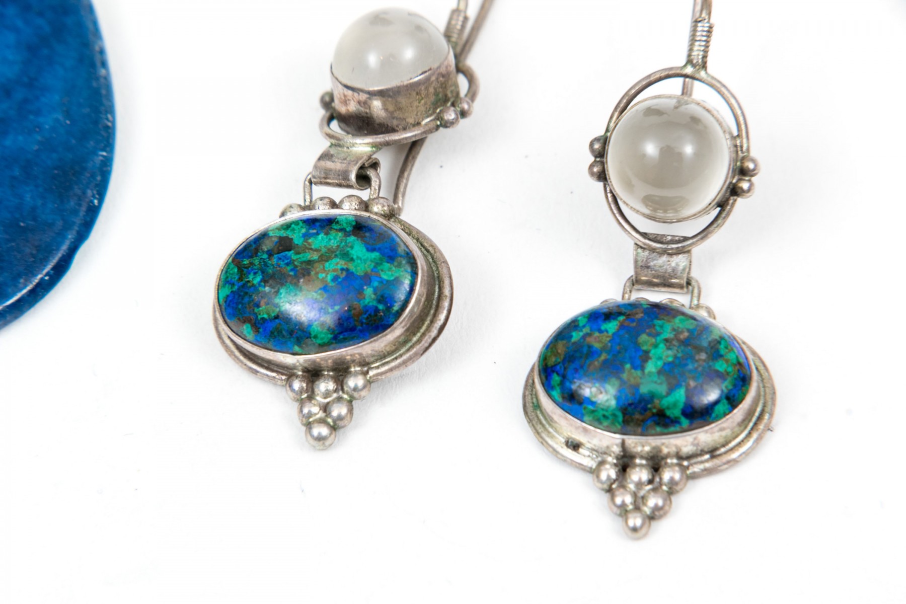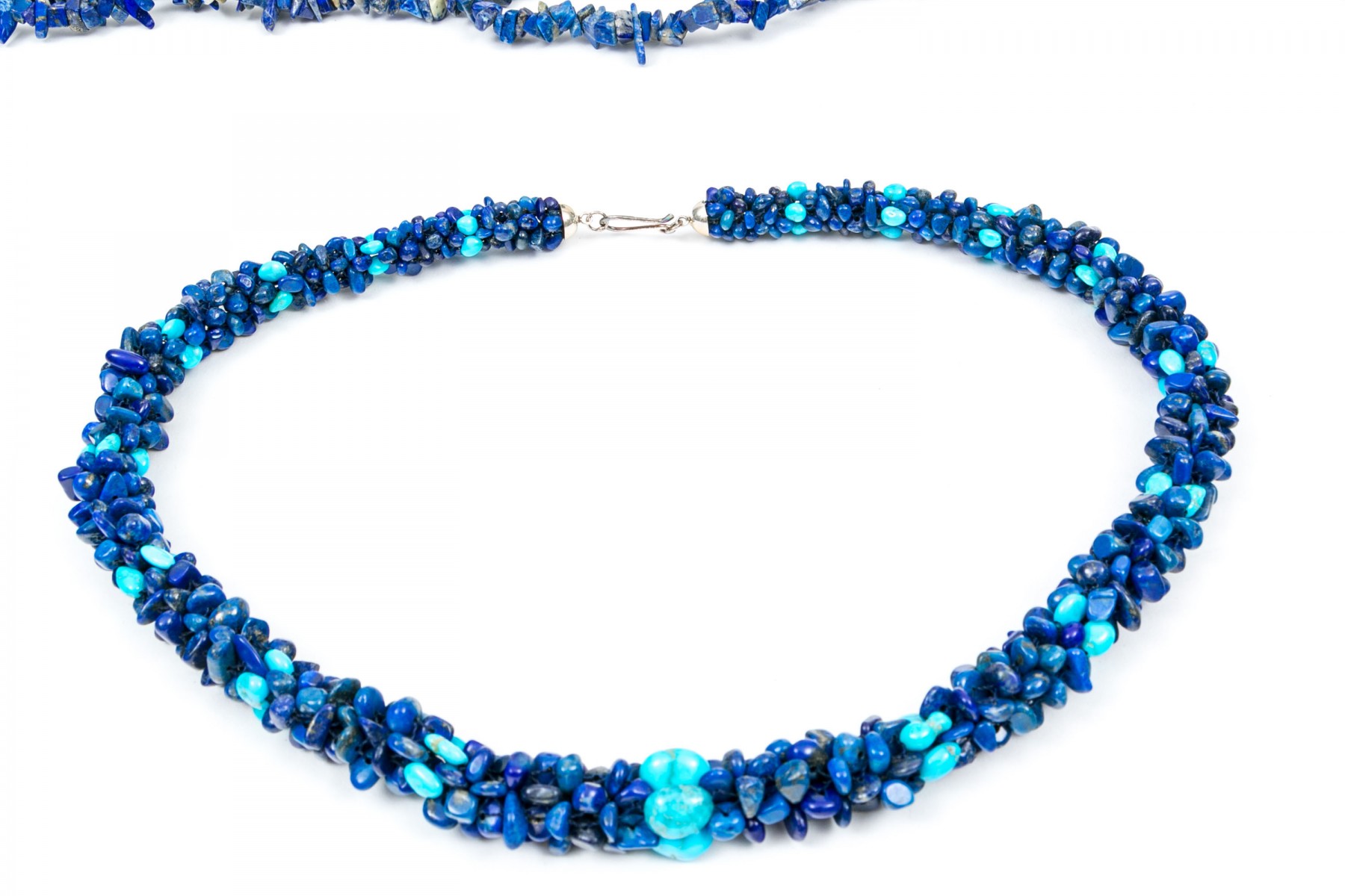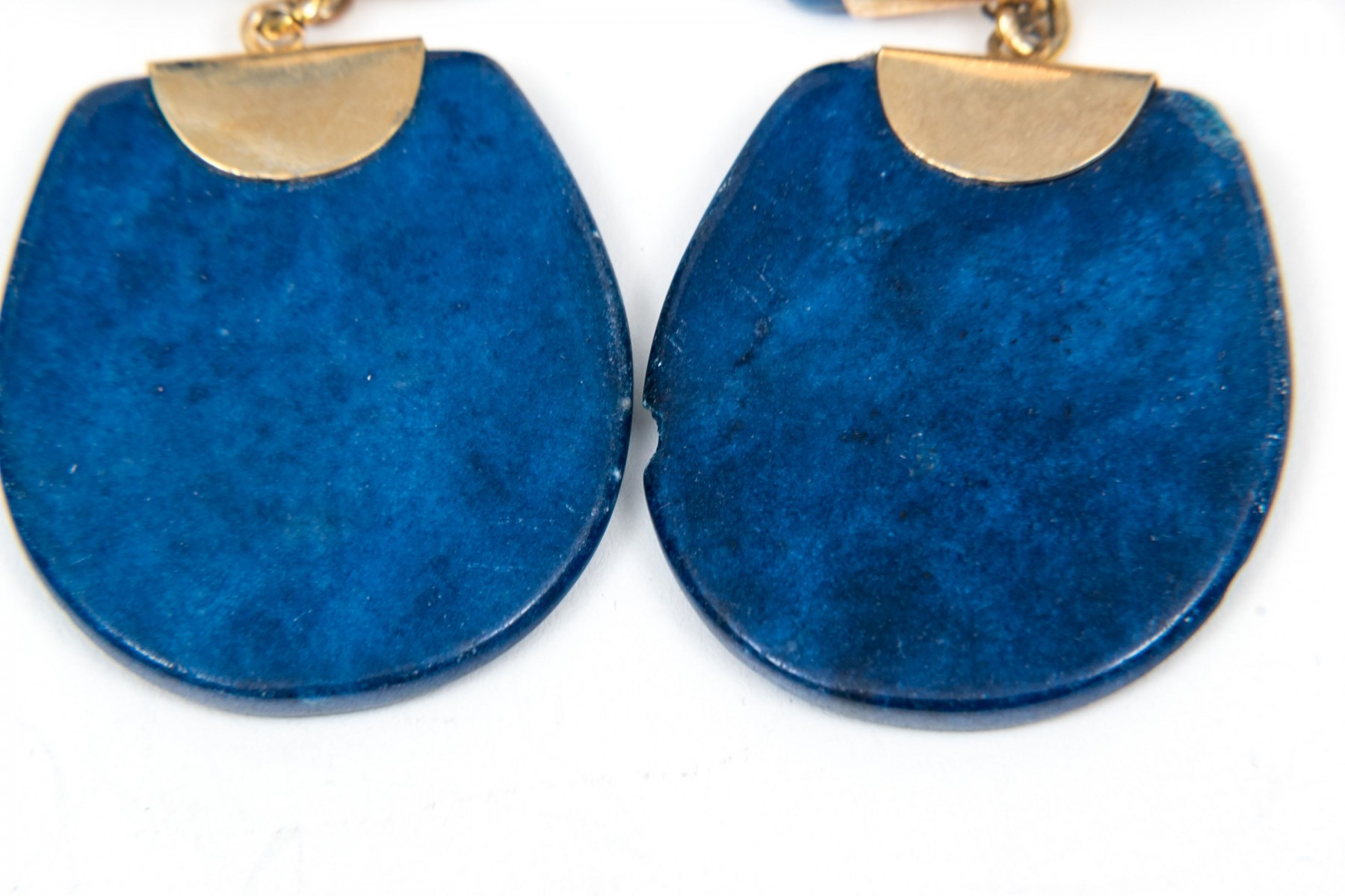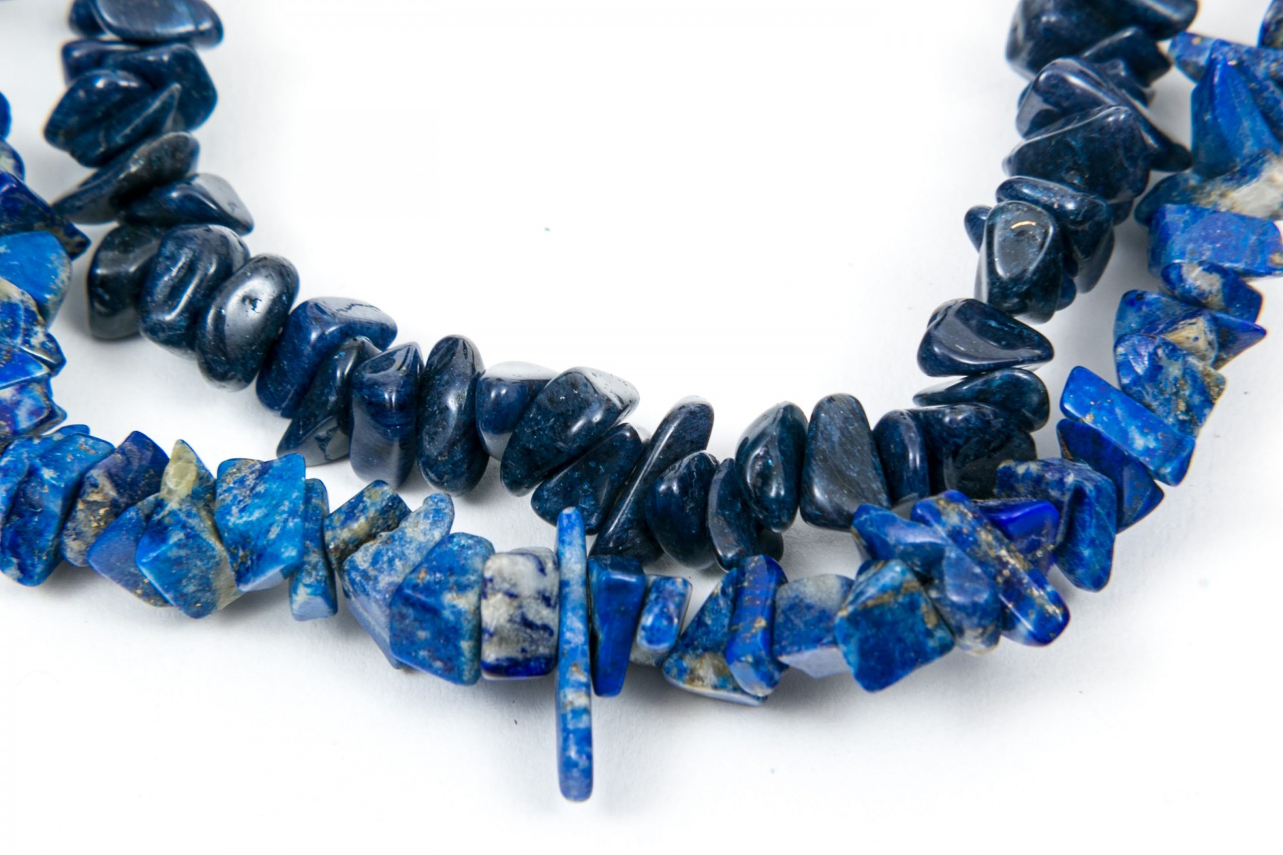 Lapis and sodalite jewelry. Three strung beaded necklaces and a unique double stranded necklace with stone inlay. Three pairs of stone inlay earrings.