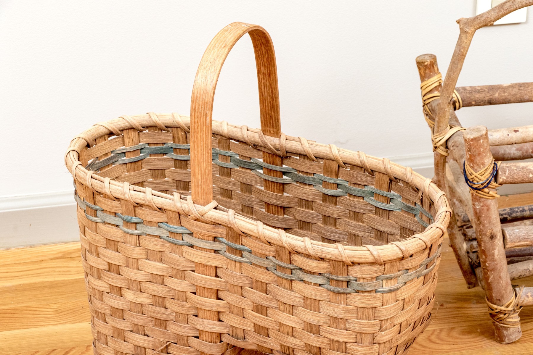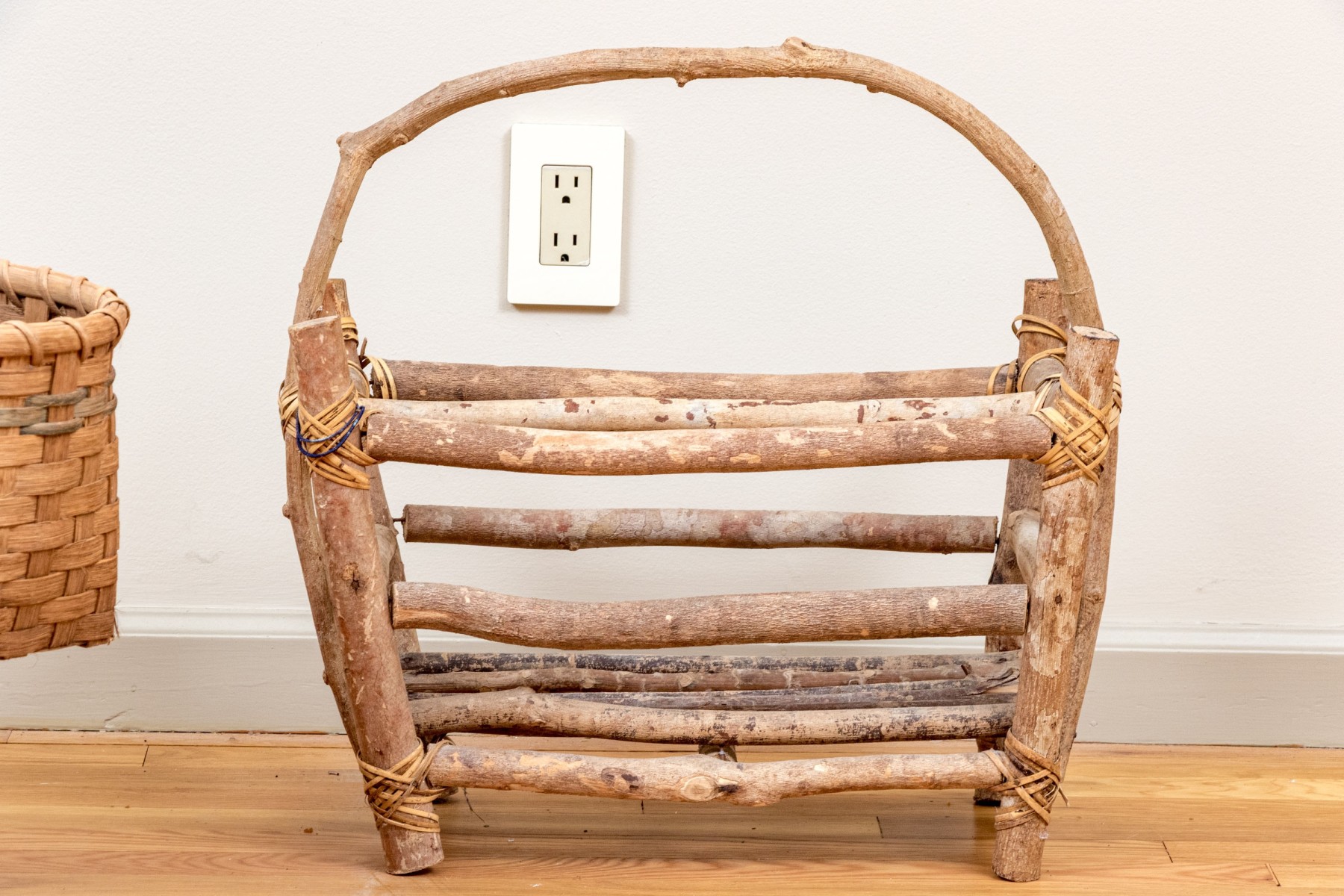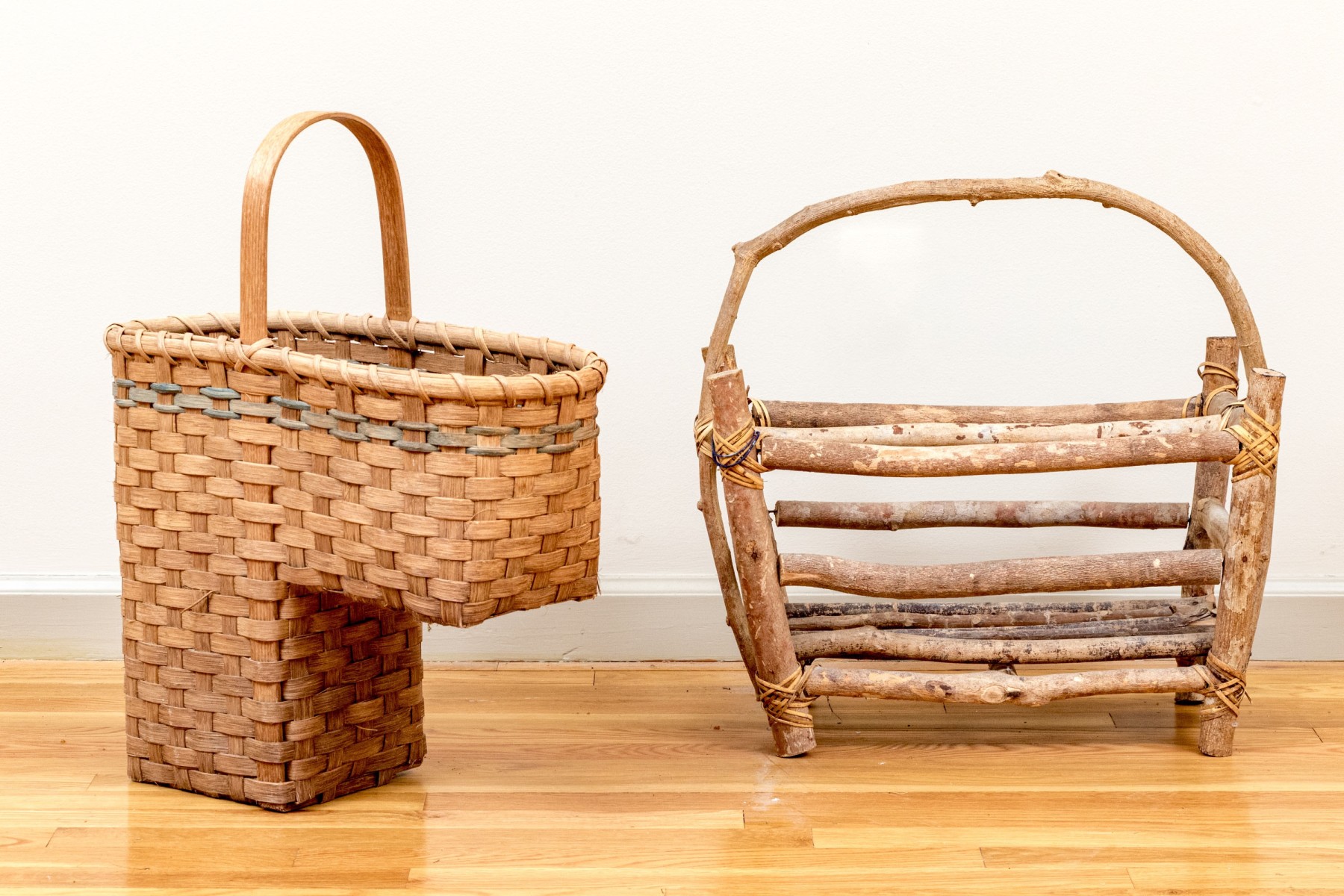 Comprised of a rustic handmade wood and rattan rustic basket together with a woven step basket with arched handle.