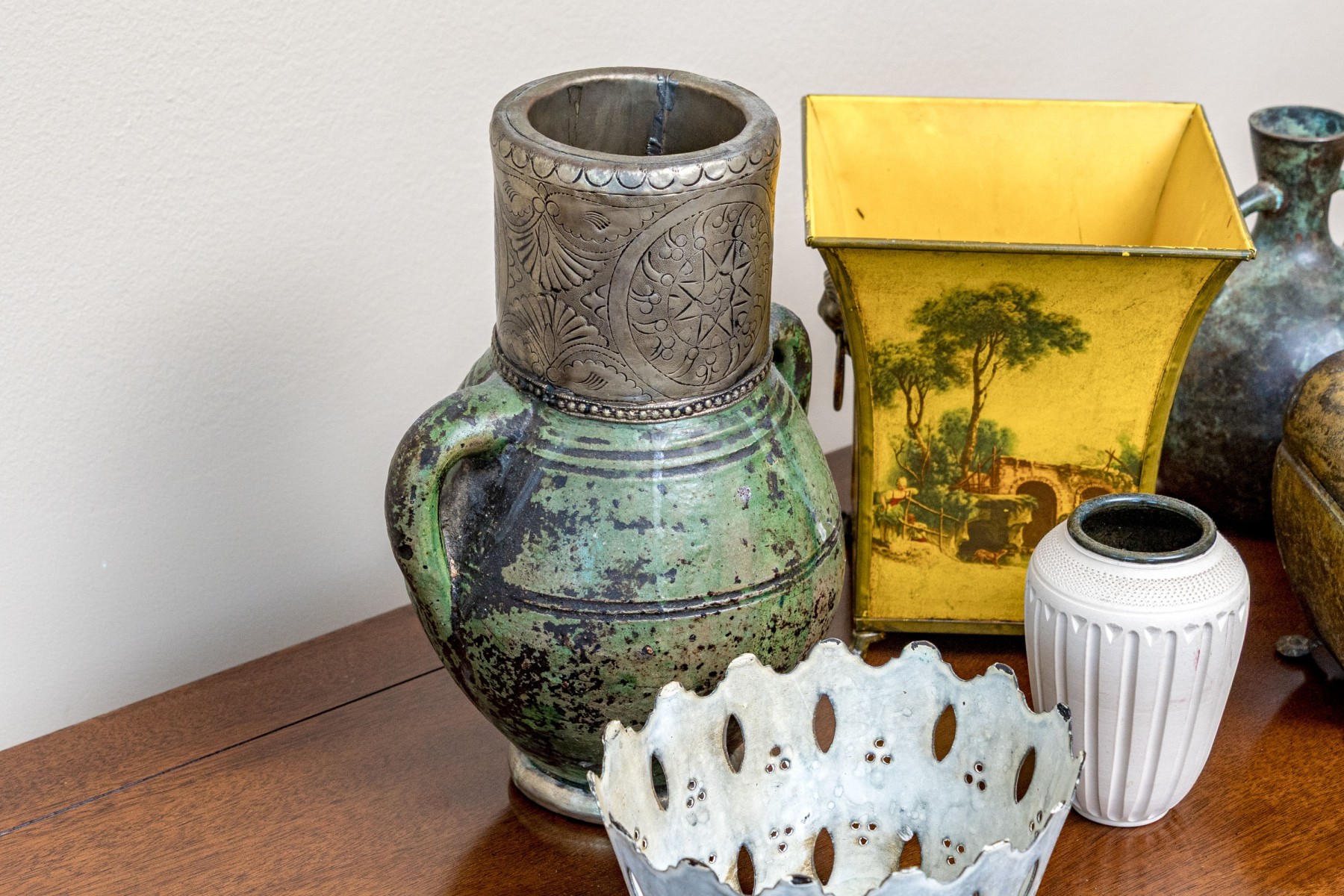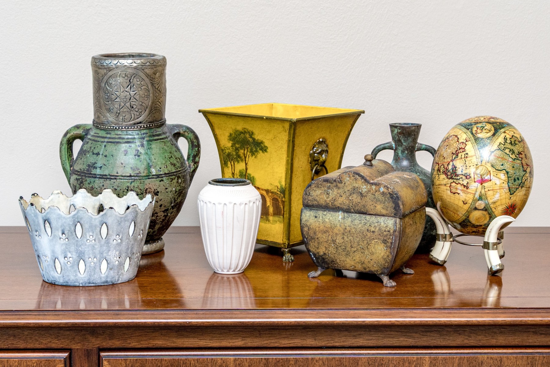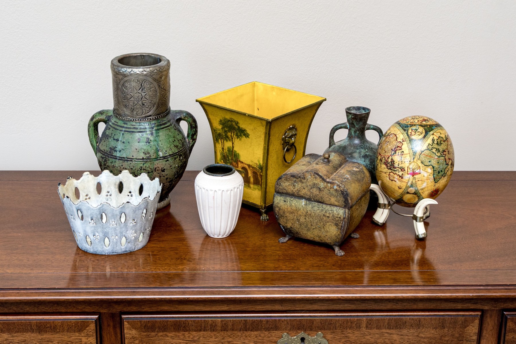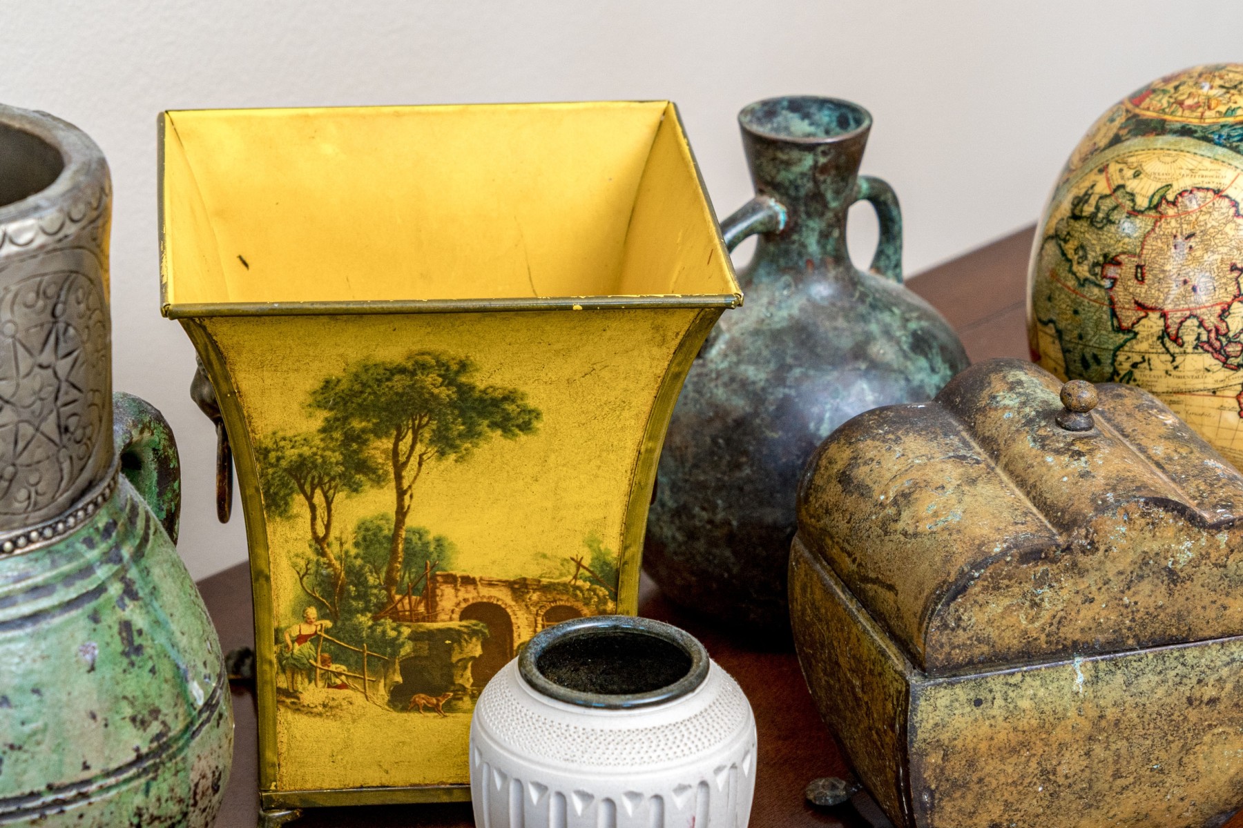 A lovely assortment of tabletop decor including a tole basket, globe on faux ivory stand, lidded and footed hinged caddy, tole footed jardiniere, twin handled vase and larger silver plate mounted twin handled vase with patinated body.