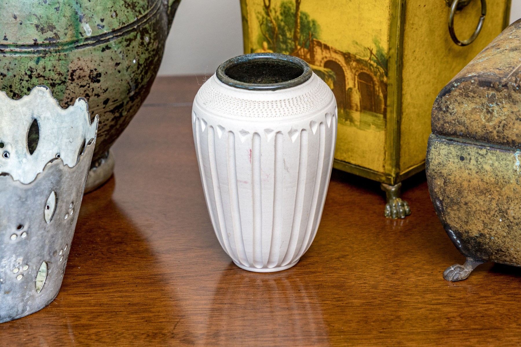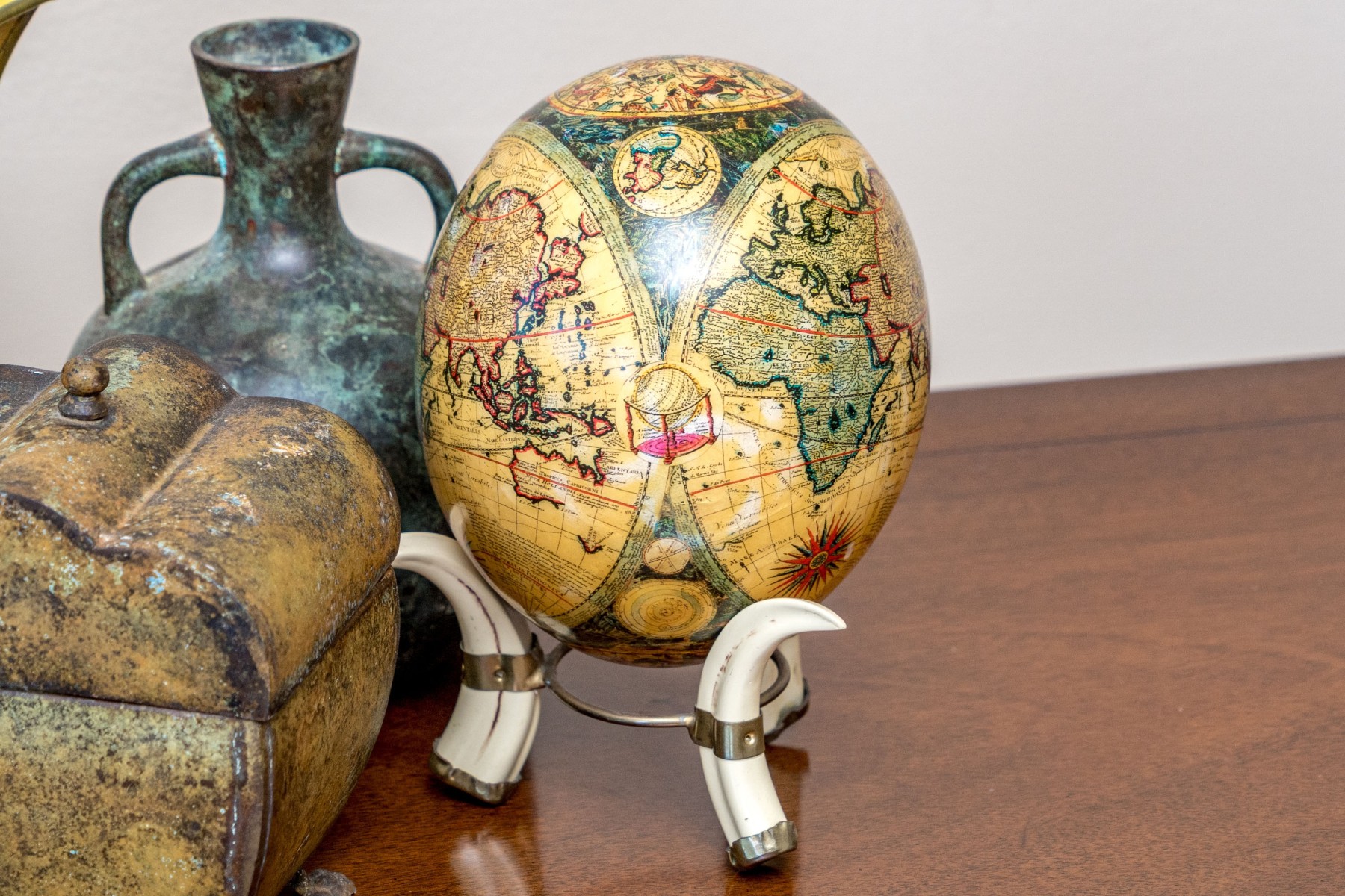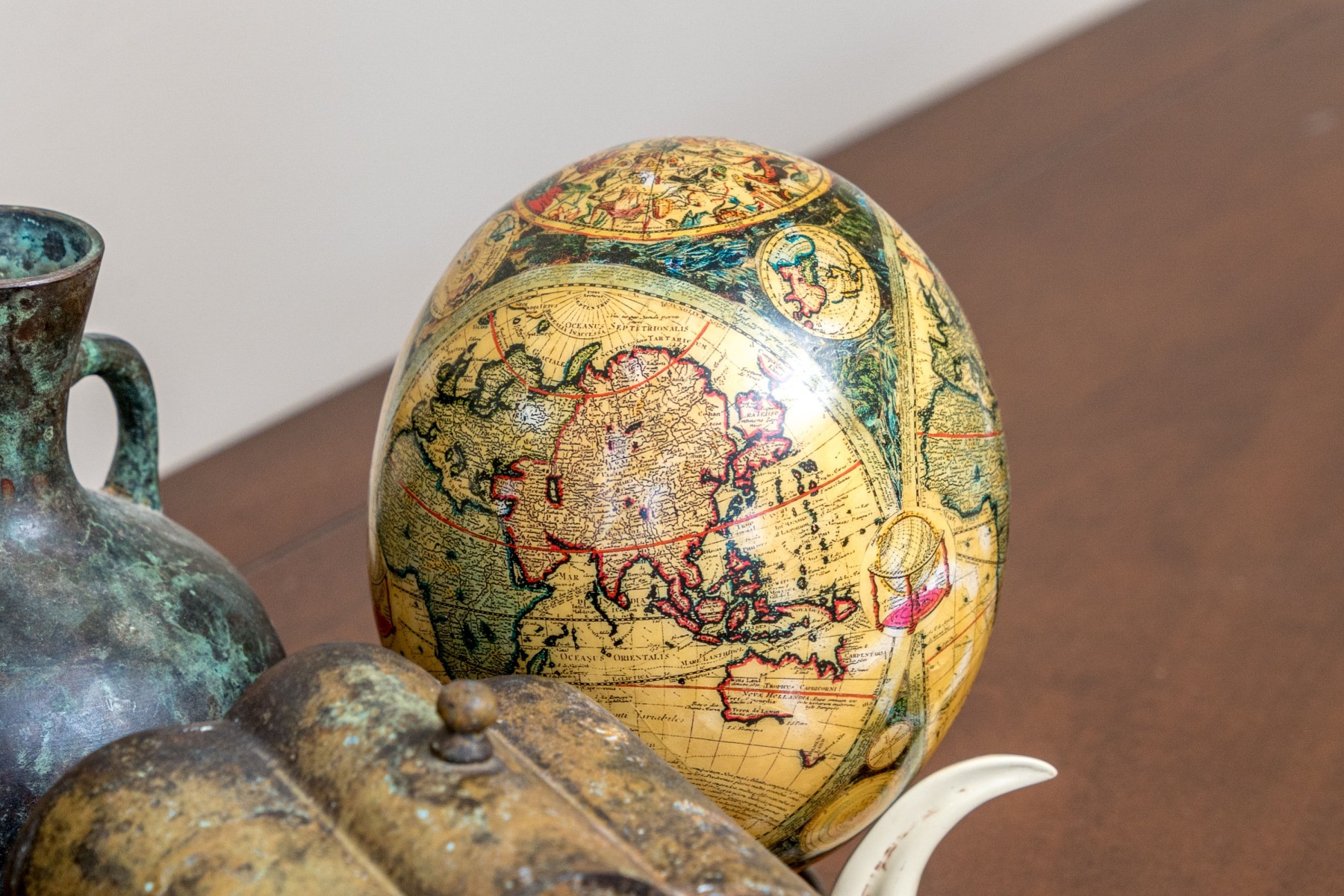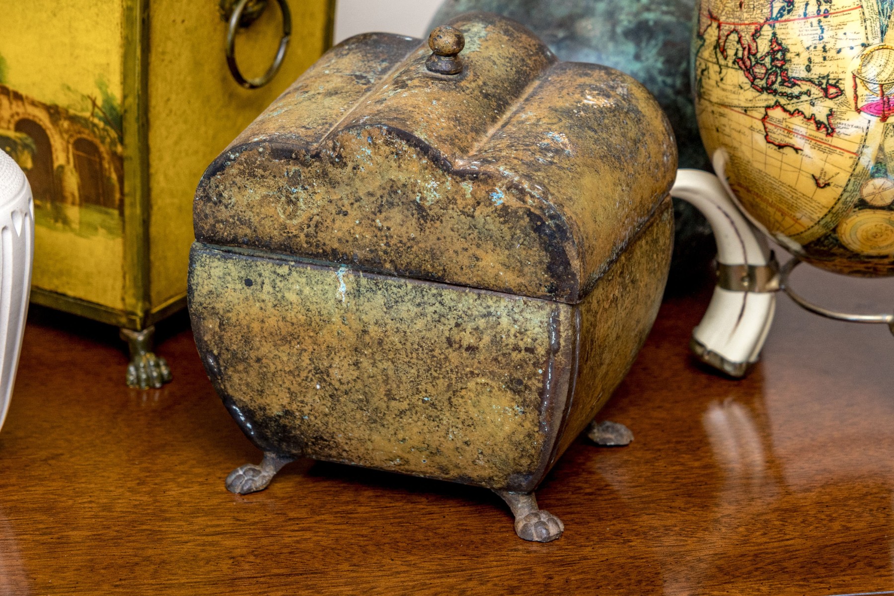 A lovely assortment of tabletop decor including a tole basket, globe on faux ivory stand, lidded and footed hinged caddy, tole footed jardiniere, twin handled vase and larger silver plate mounted twin handled vase with patinated body.