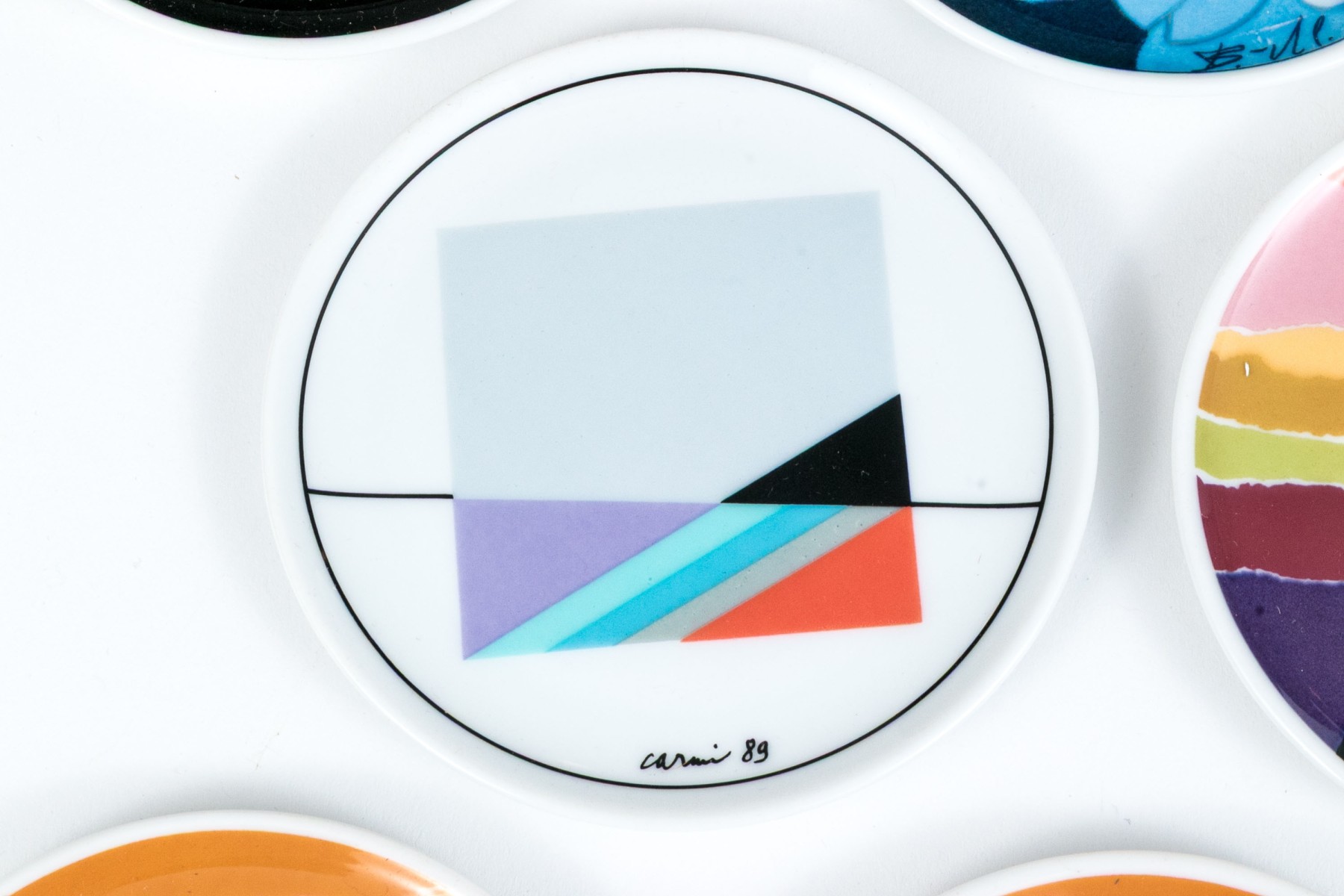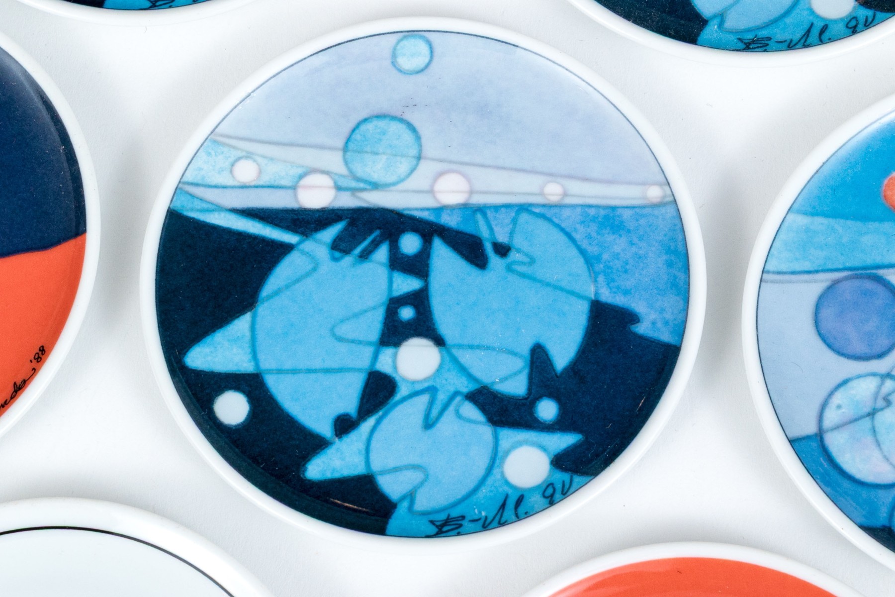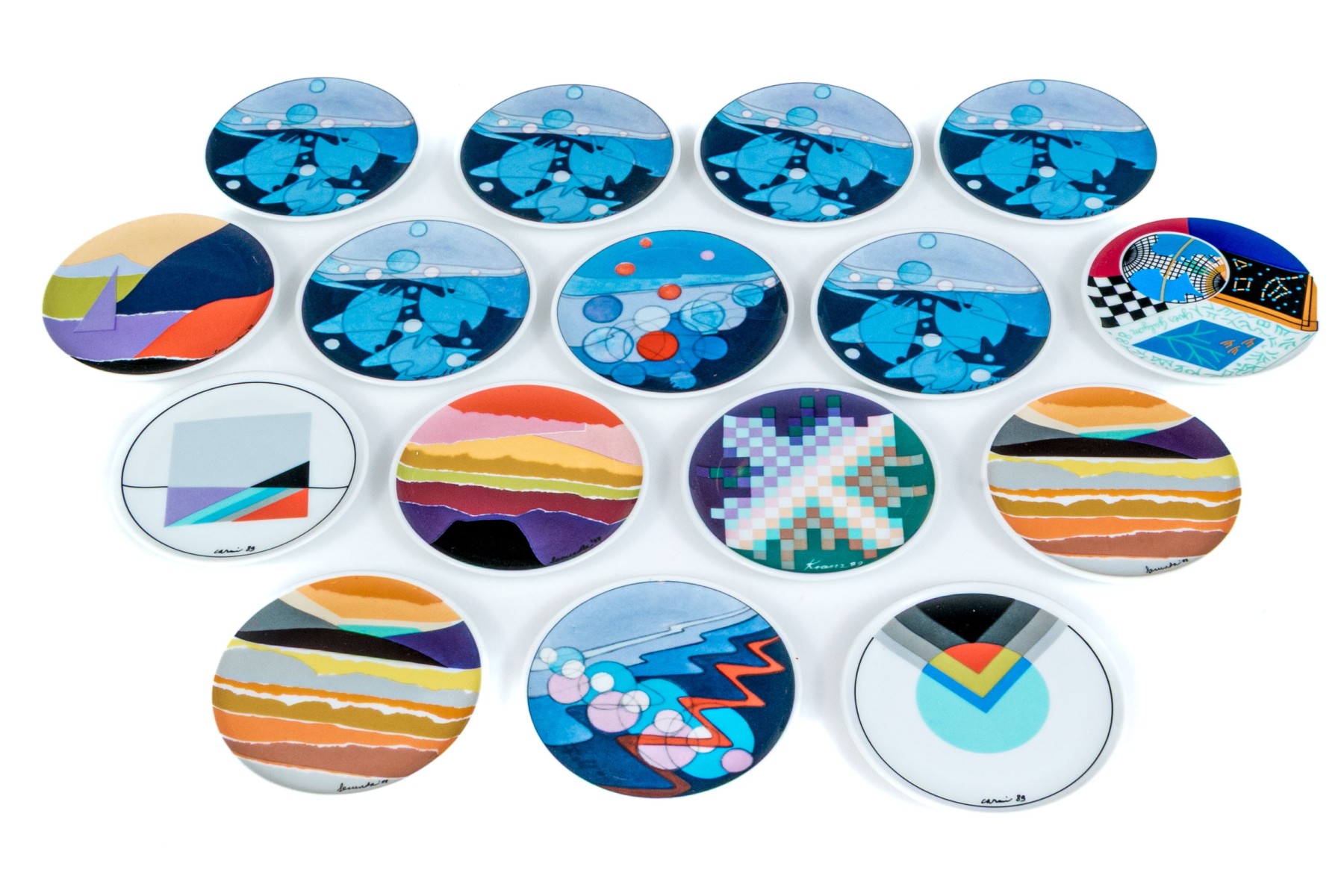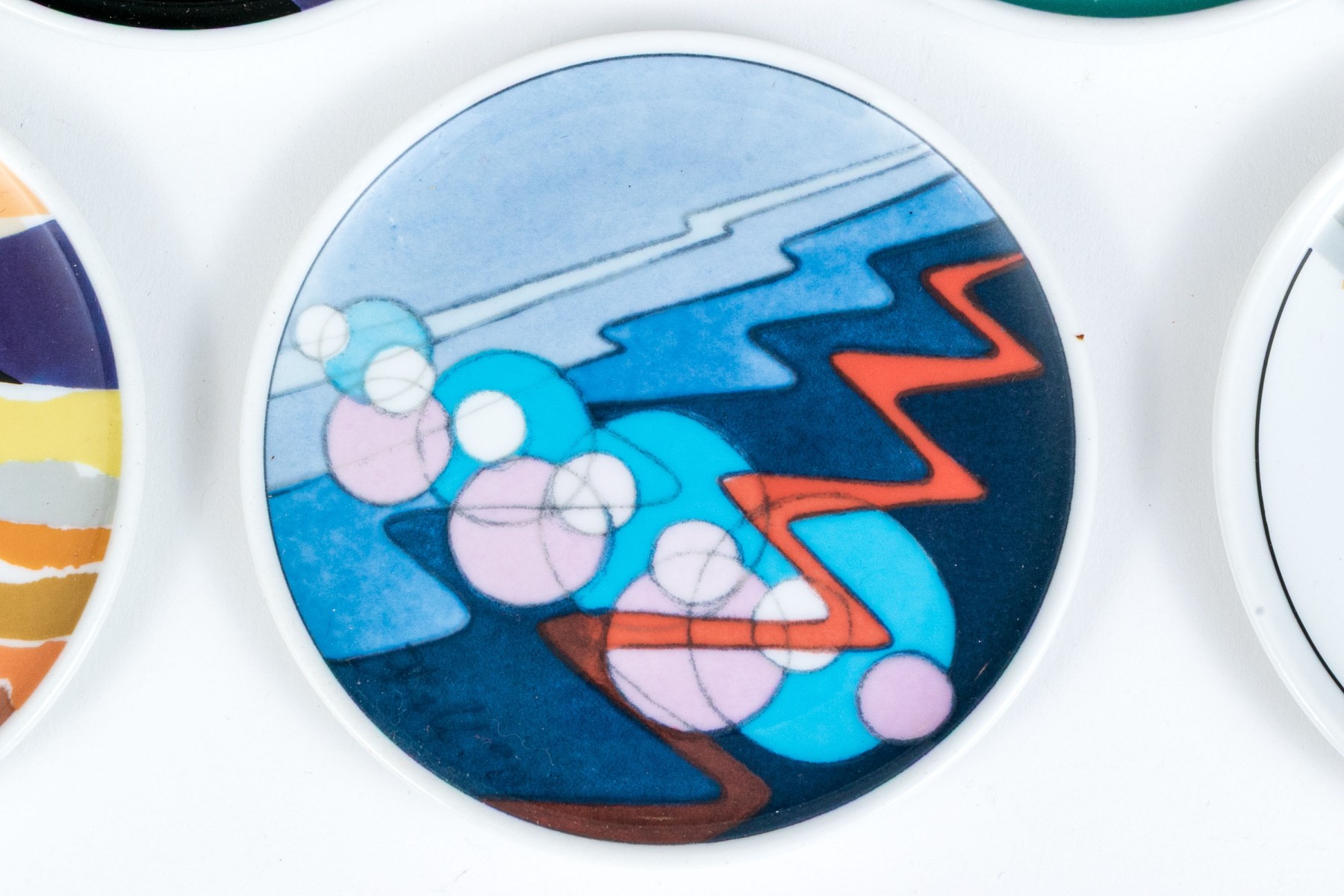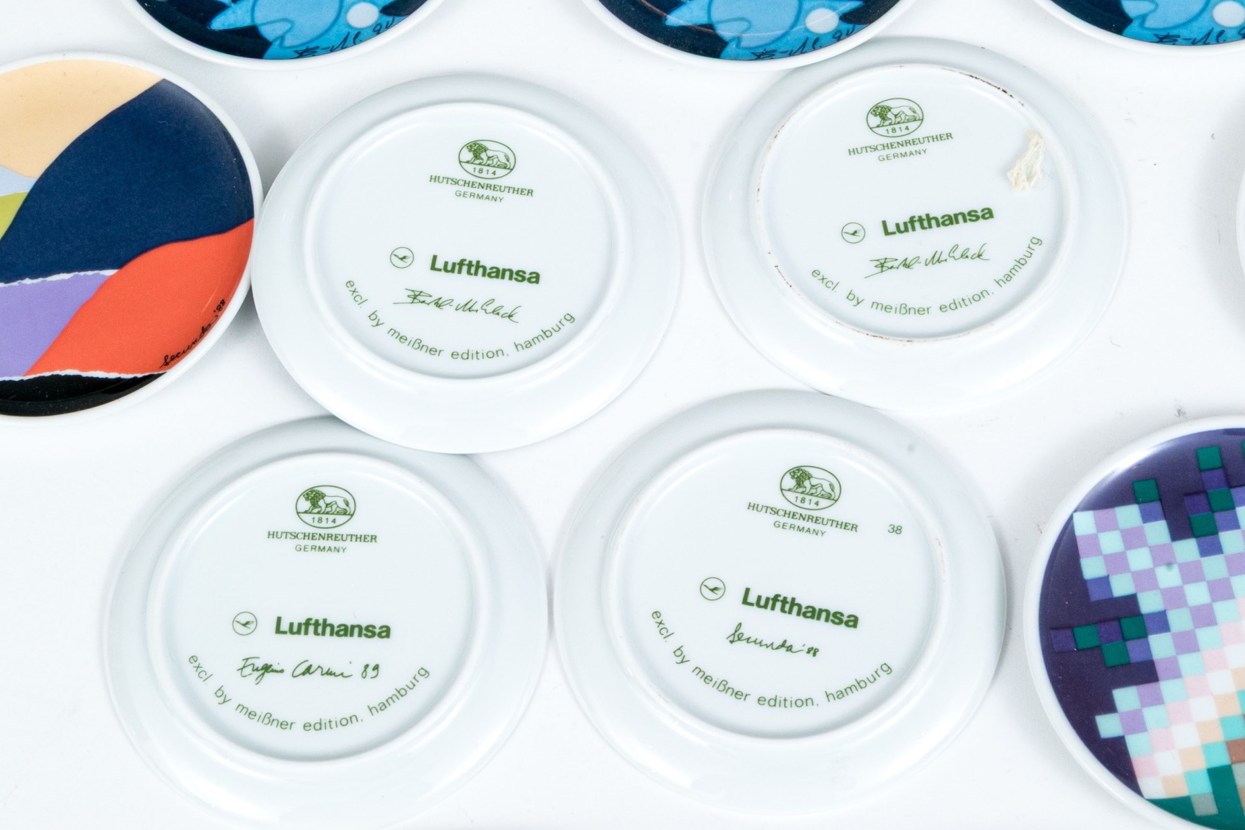 An excellent collection of seventeen Lufthansa porcelain coasters decorated with abstract motifs in vibrant color. Footed with marks underfoot.