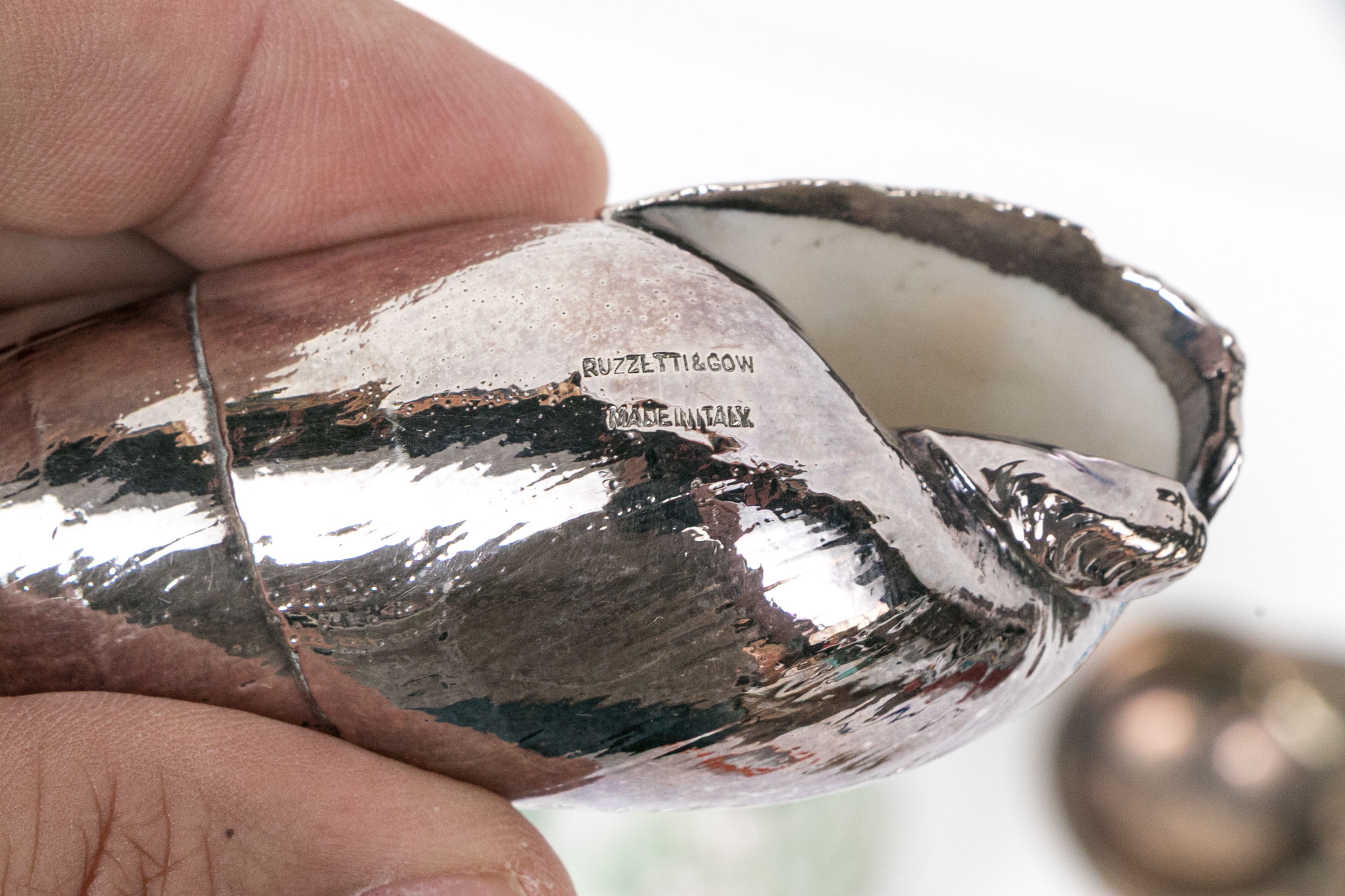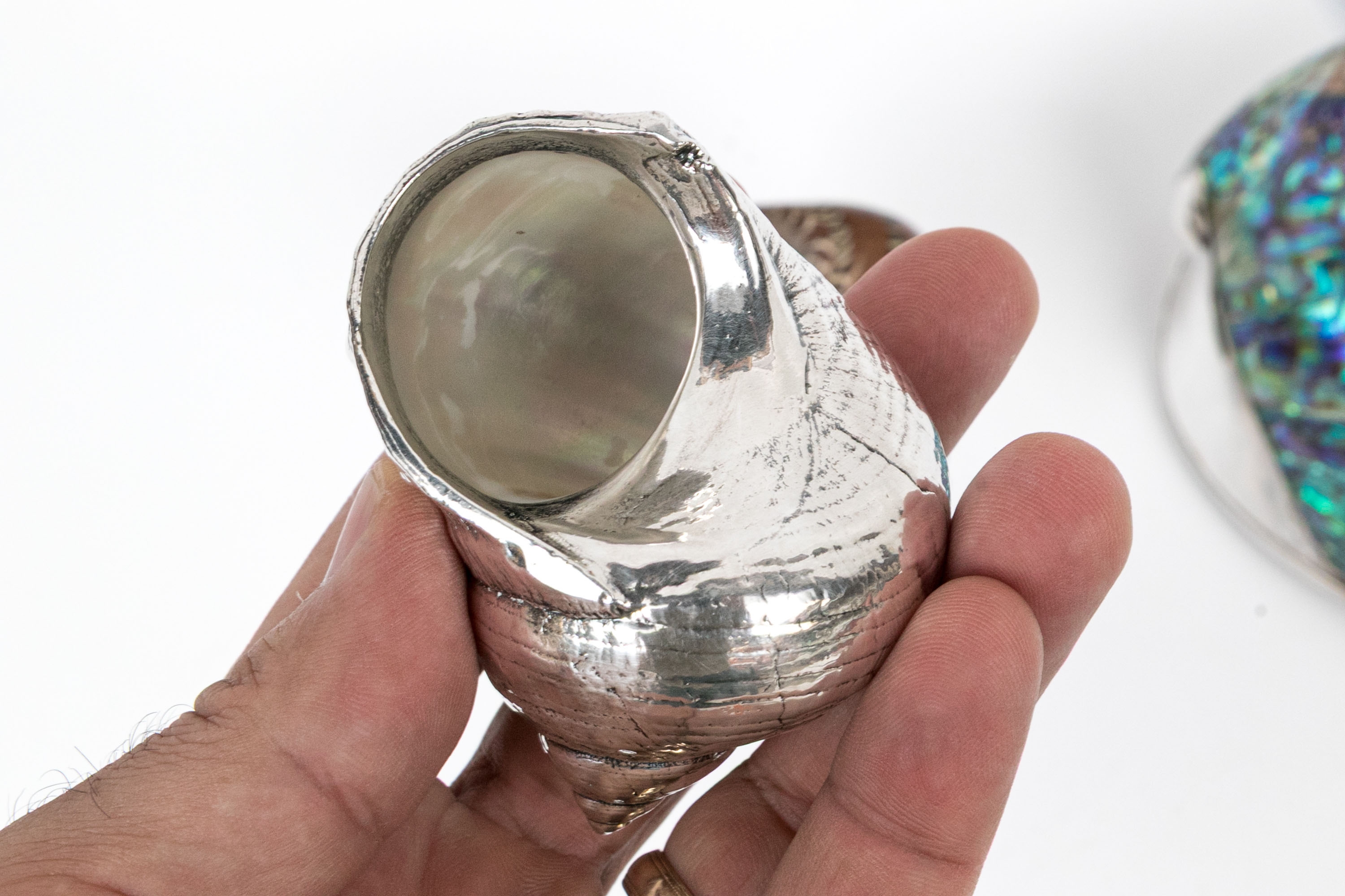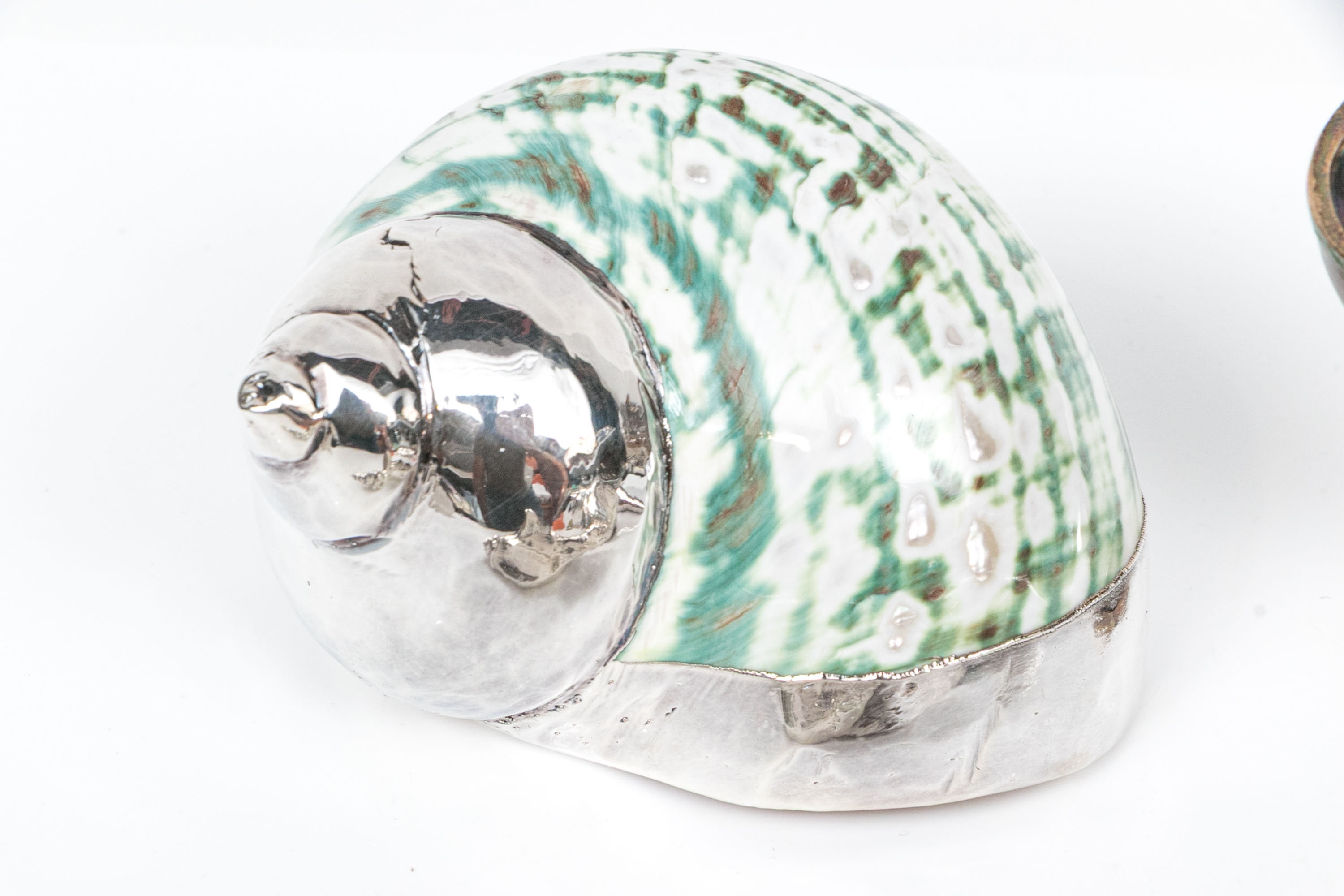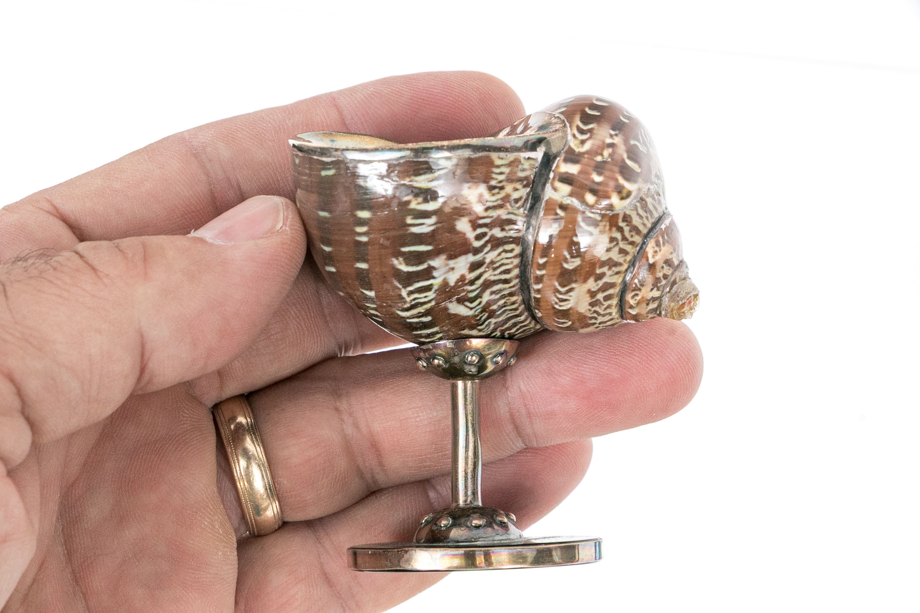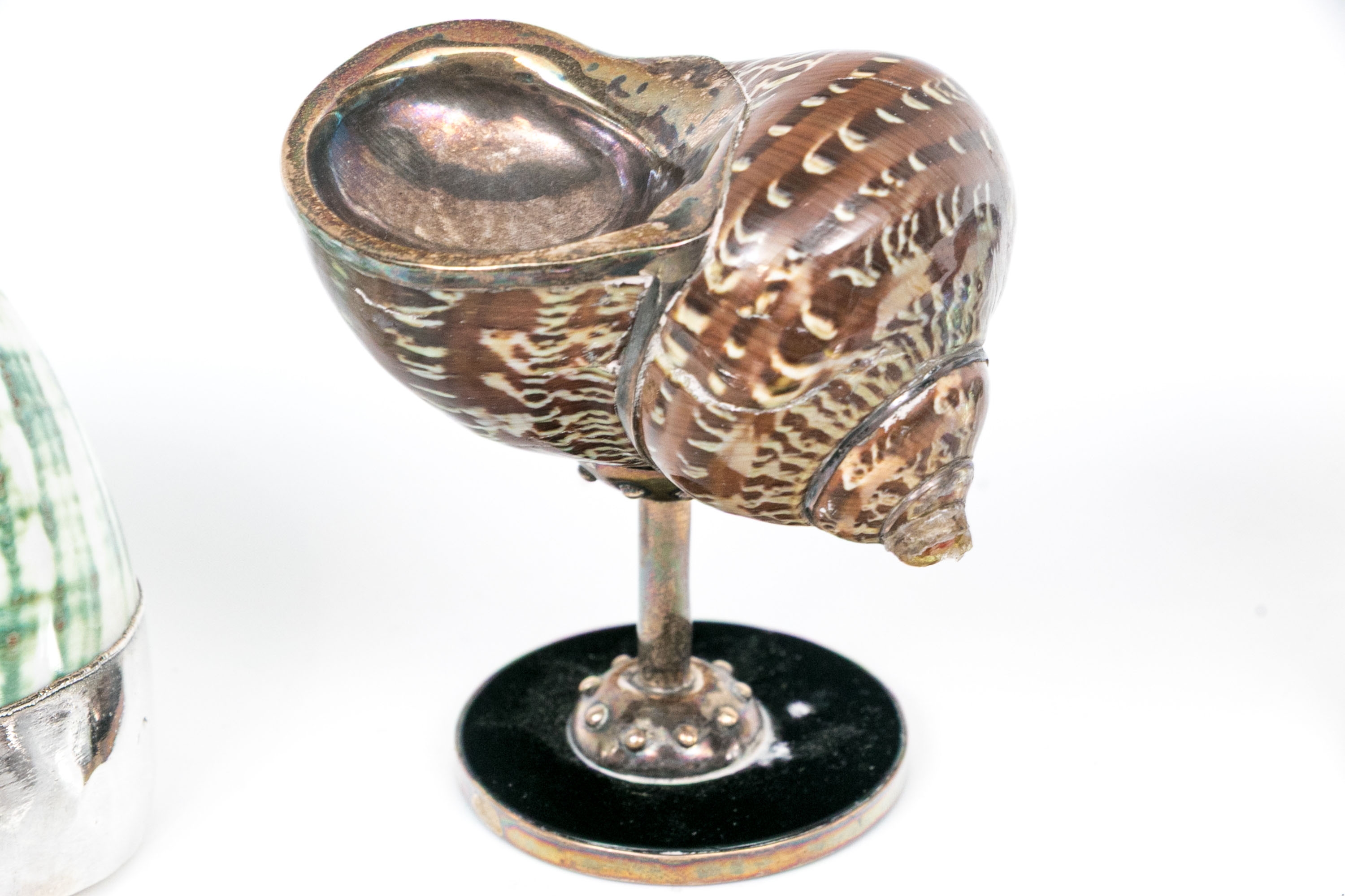 and a brown nautilus shell on laminated stand with silverplate top as a salt