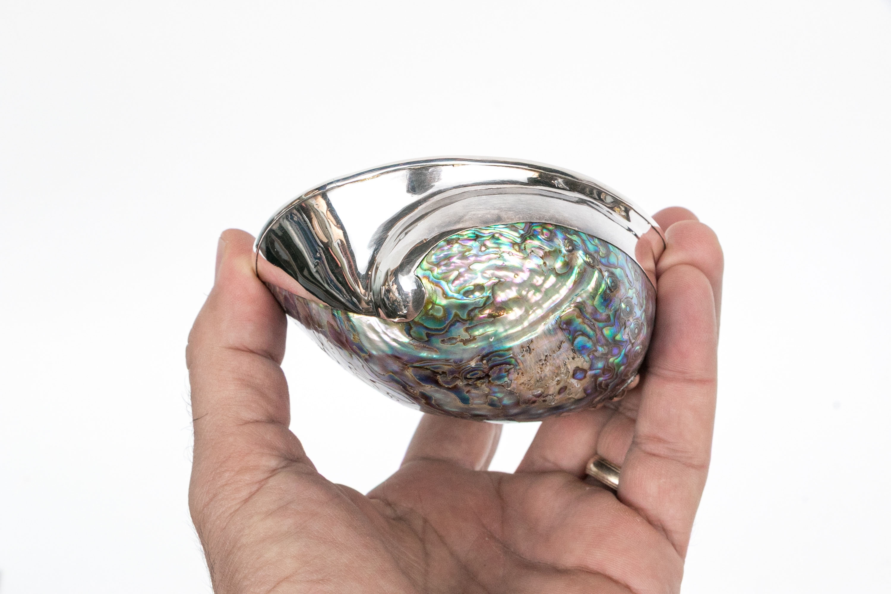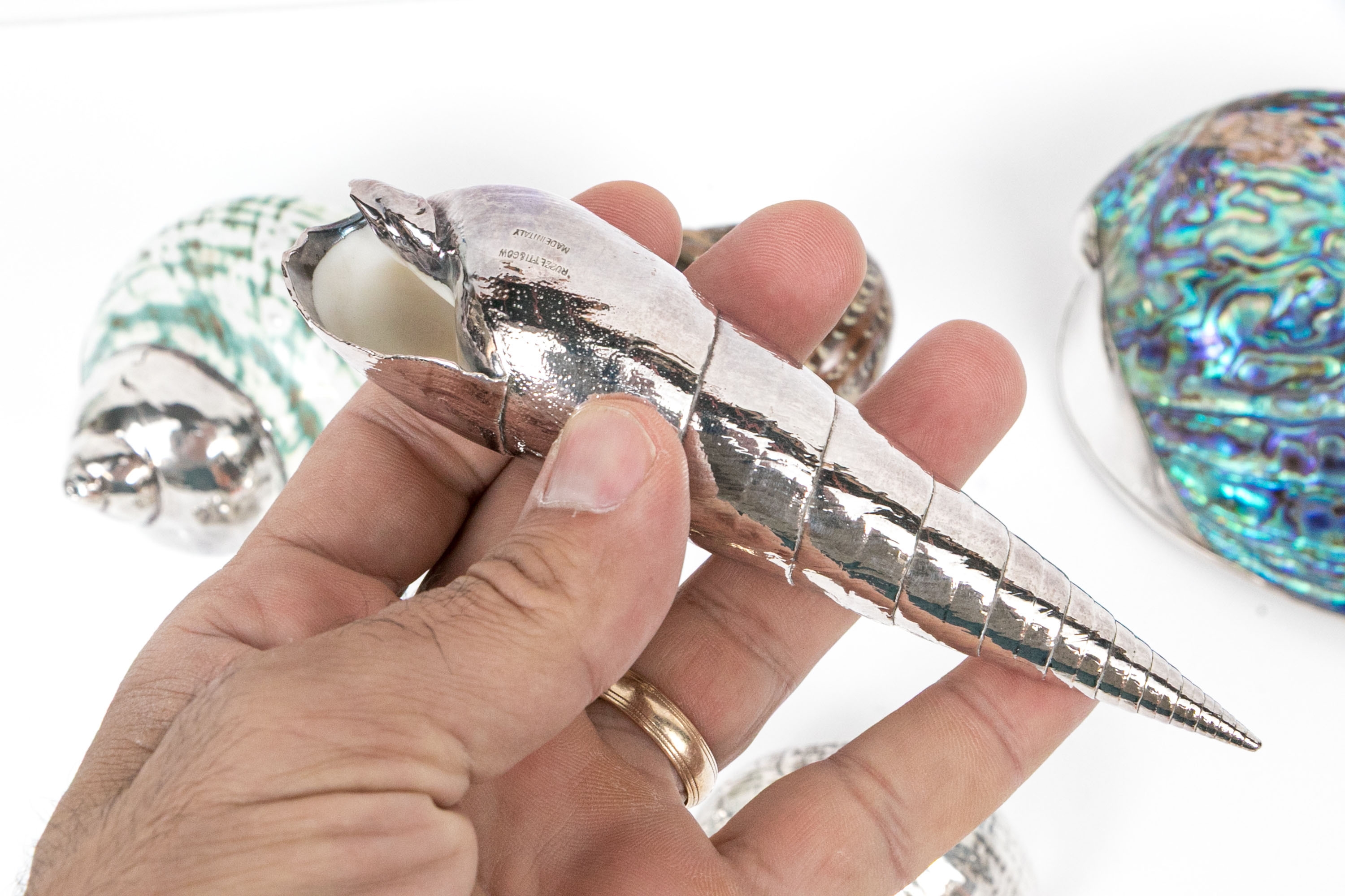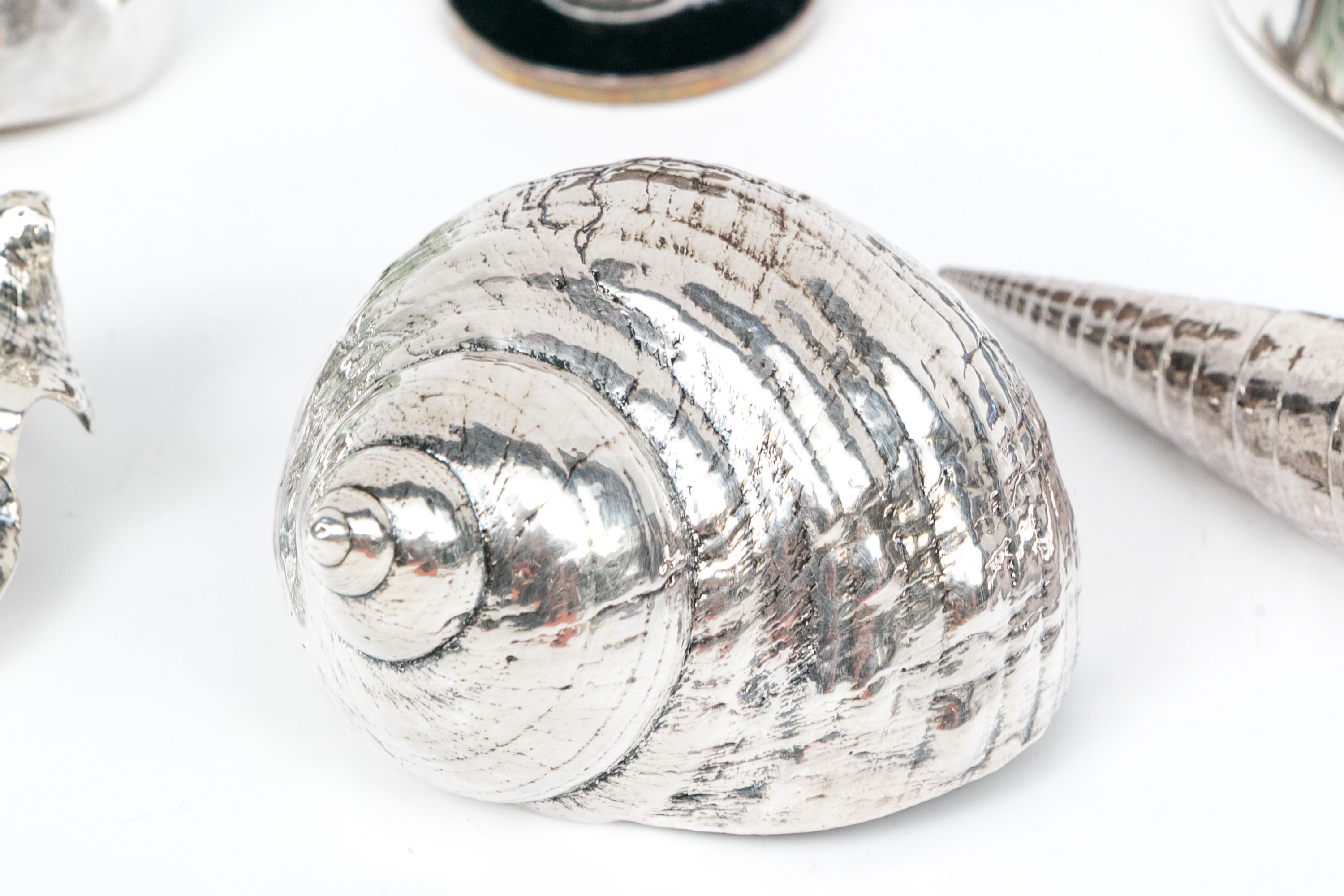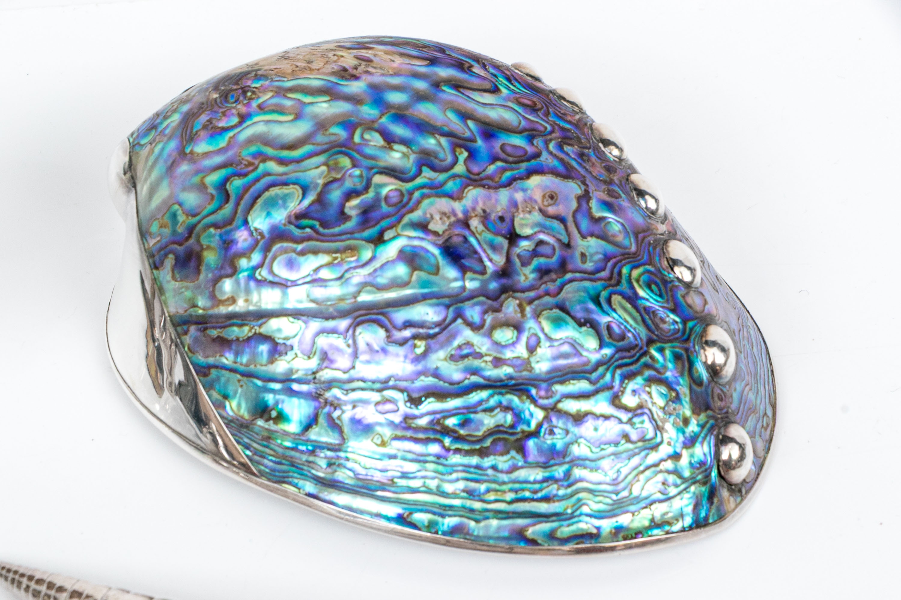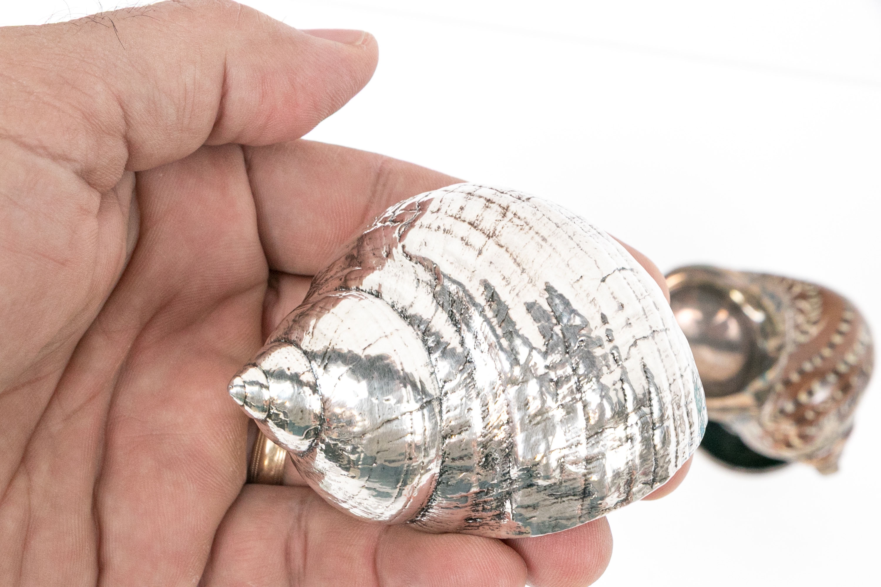 and a brown nautilus shell on laminated stand with silverplate top as a salt