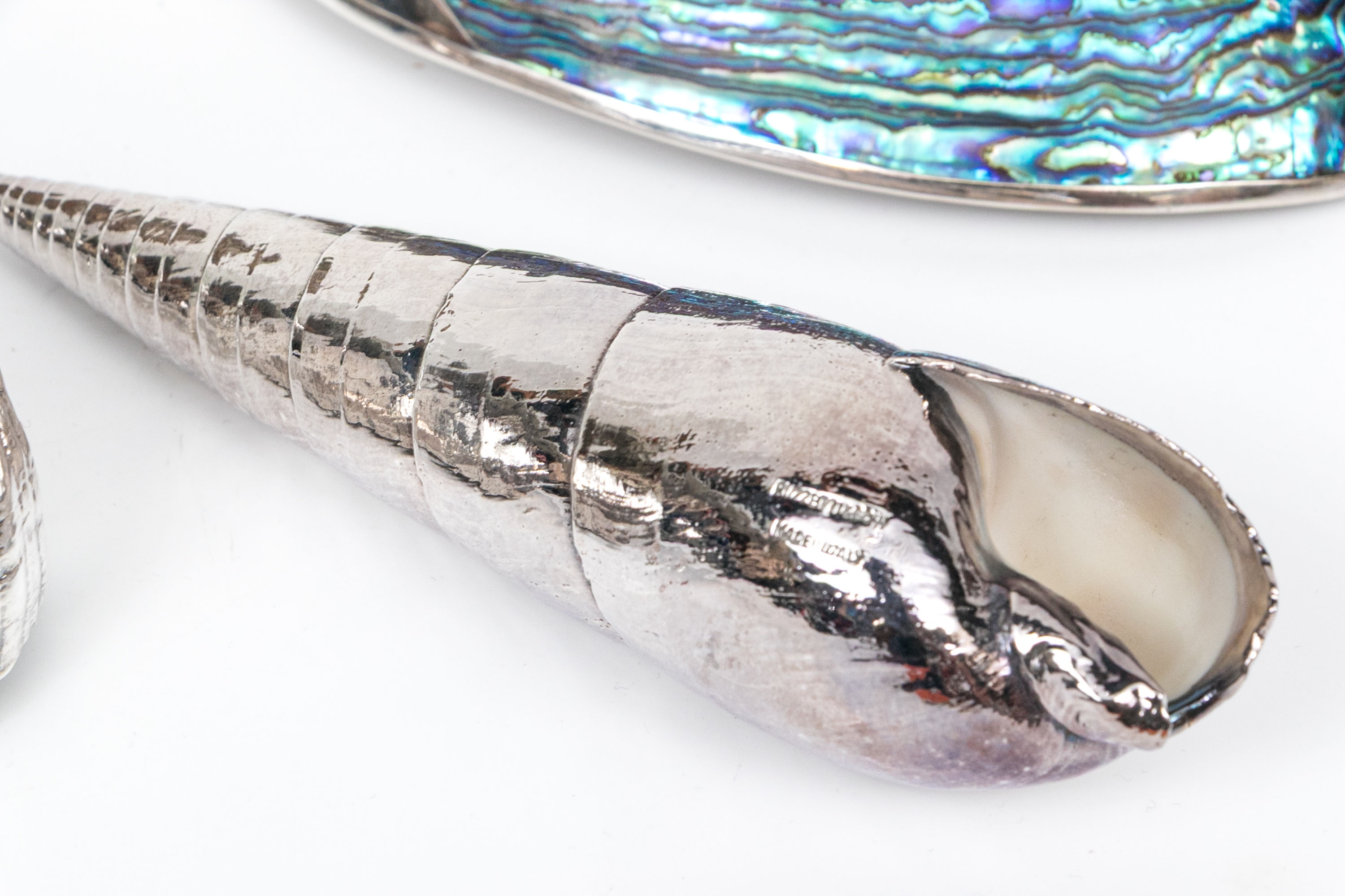 three signed by Ruzzetti Italy- one green and white nautilus, a pink conch and a long white slim shell.