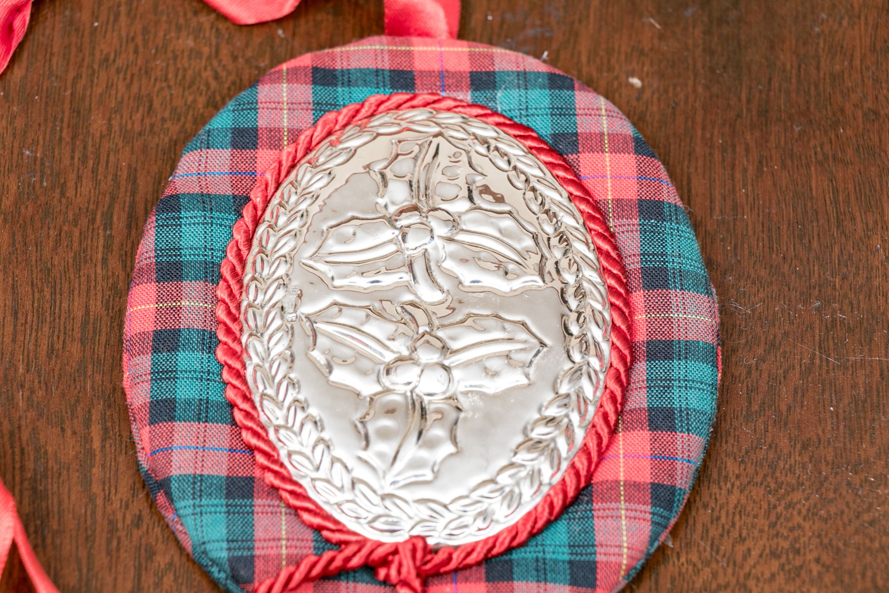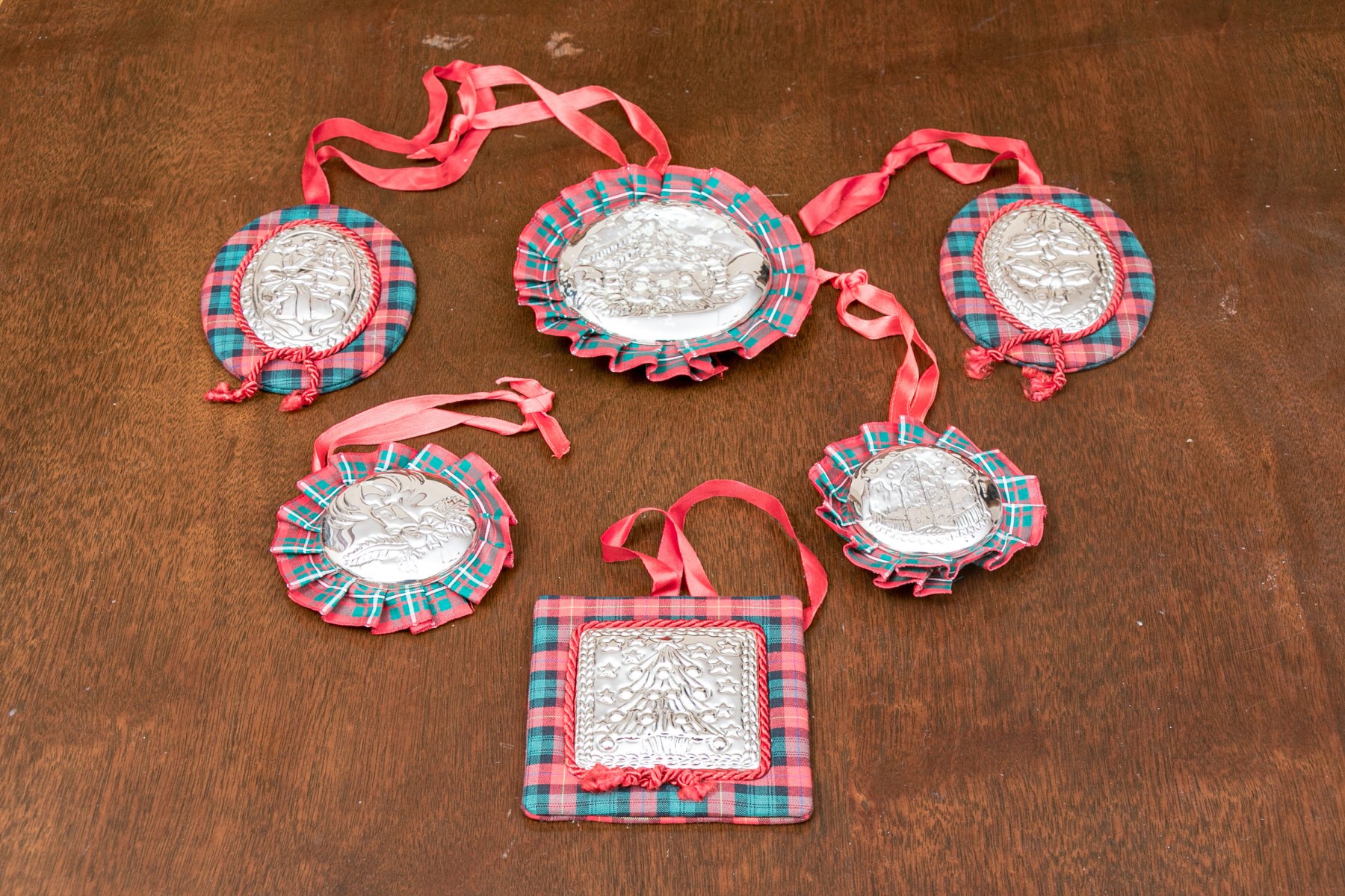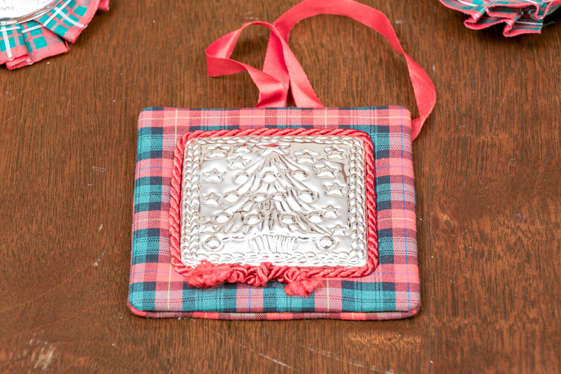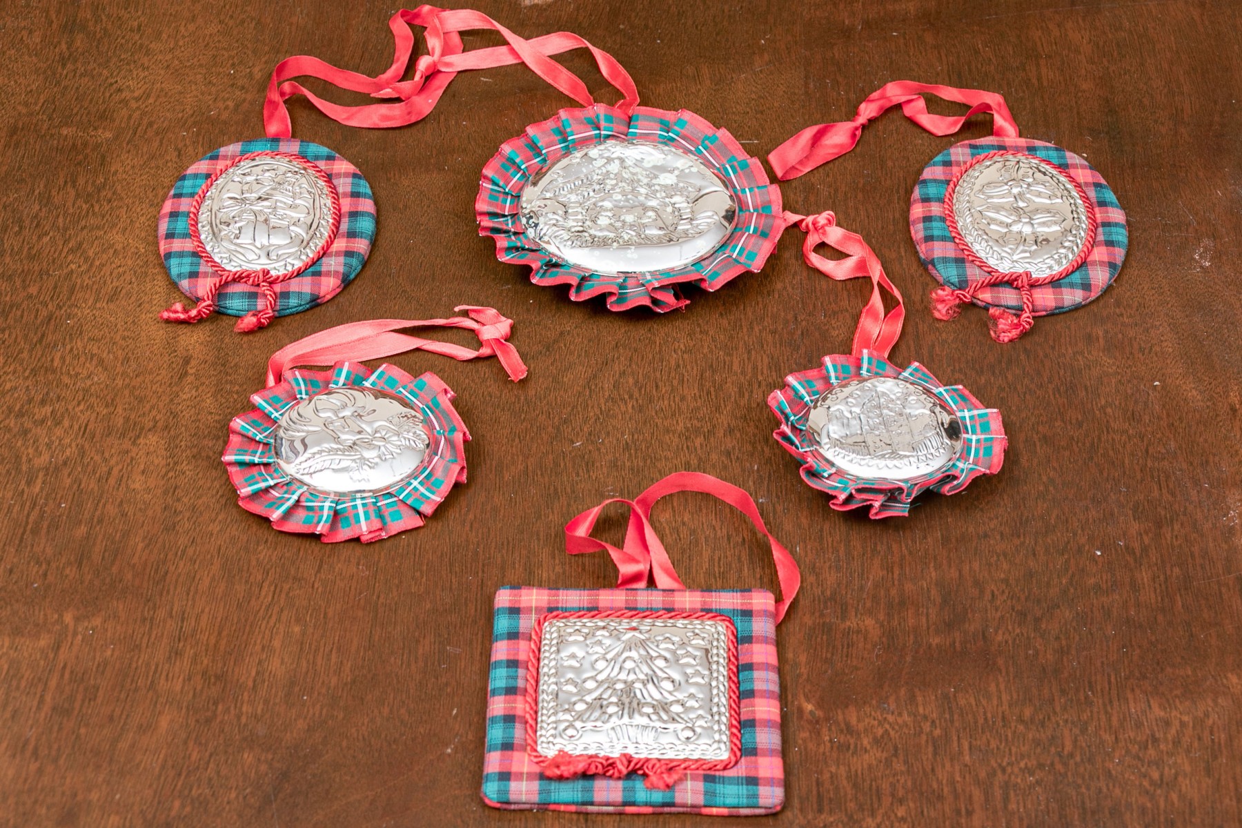 Thin silver plaques featuring a Christmas tree, a nativity scene, holly, presents, and candles. Three with green velvet backs, some with braid trim and all with plaid fabric frames and ribbons for hanging.