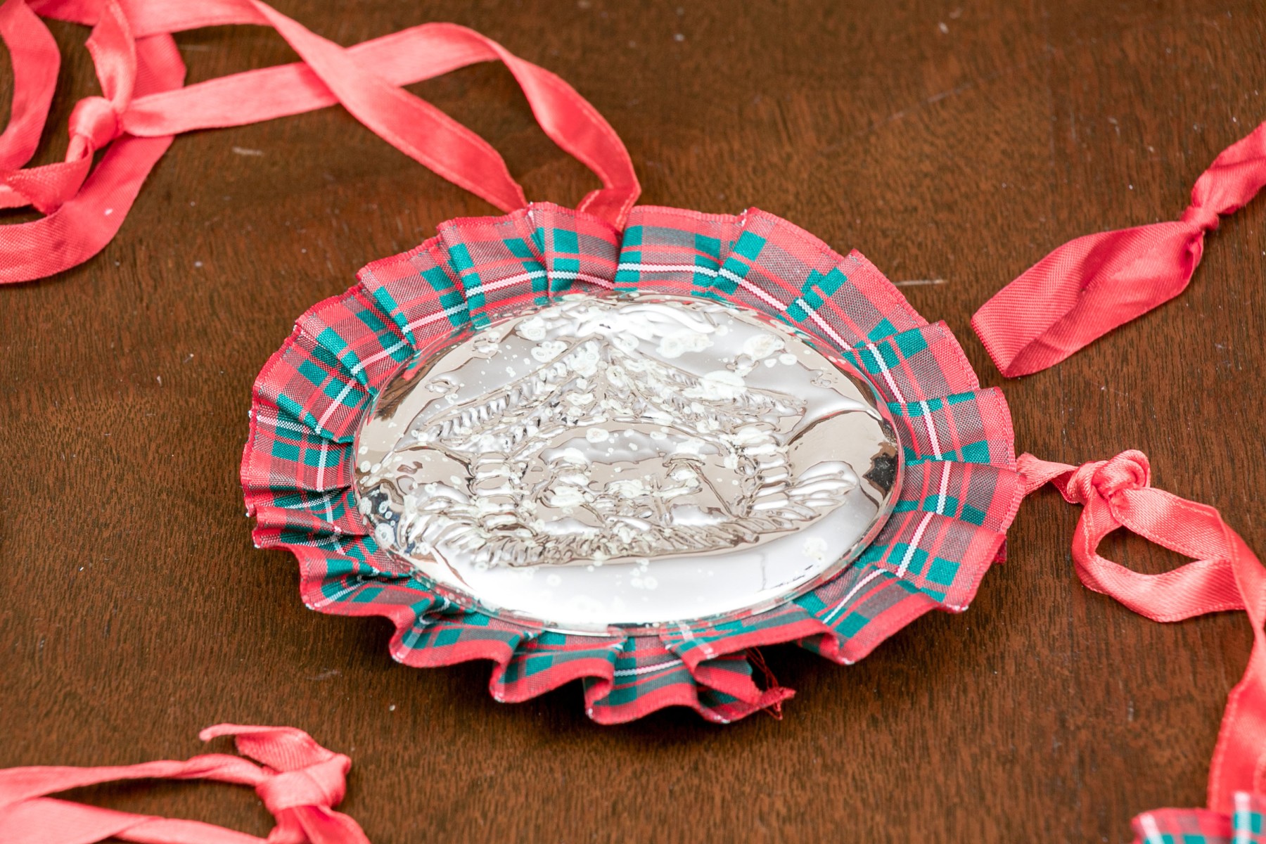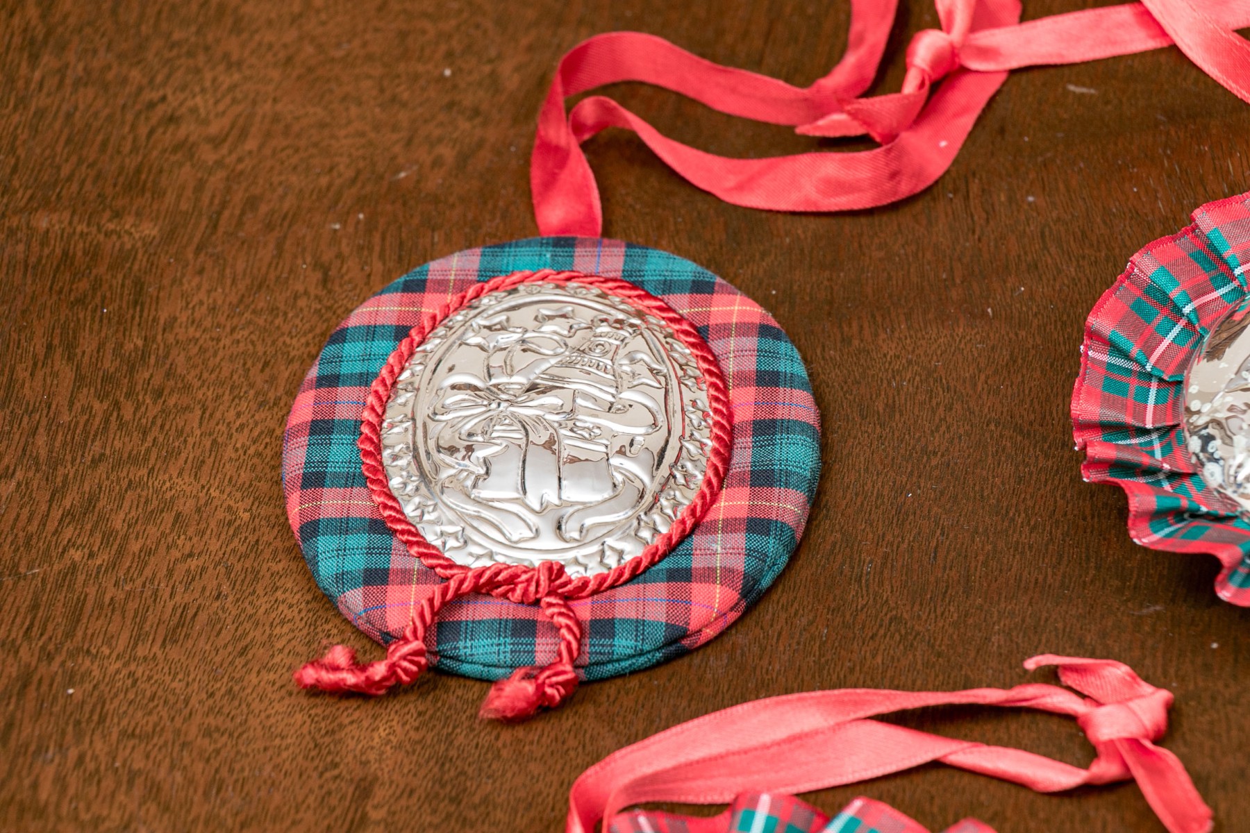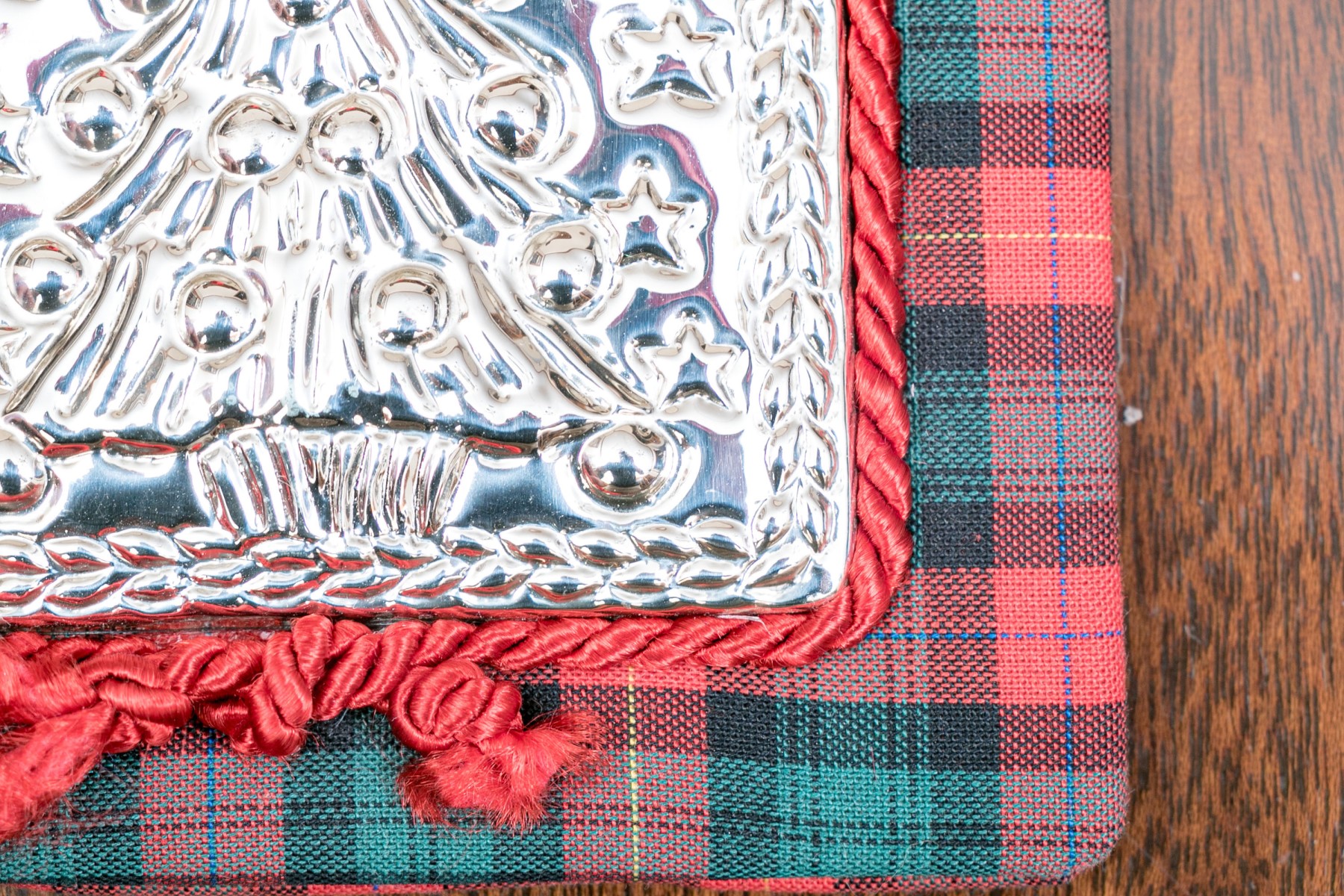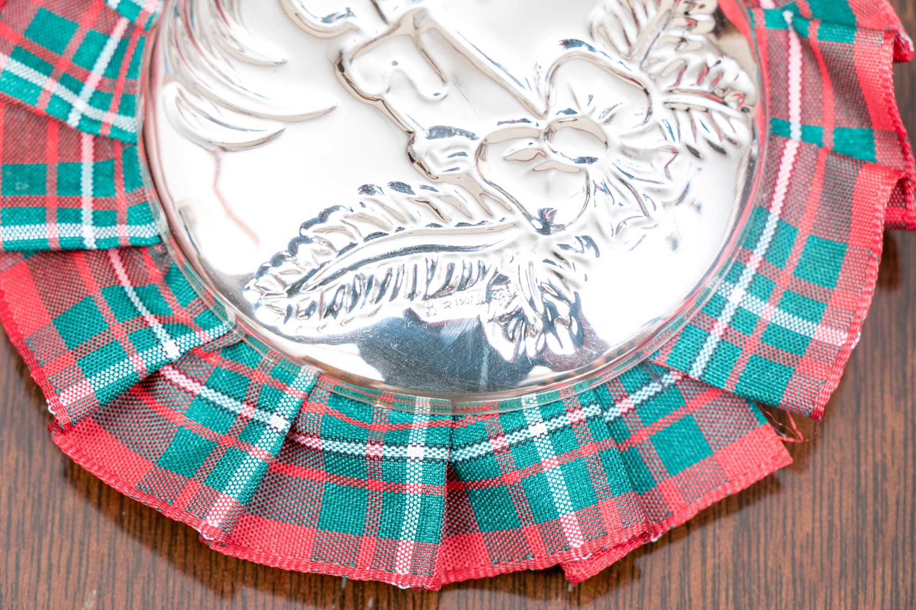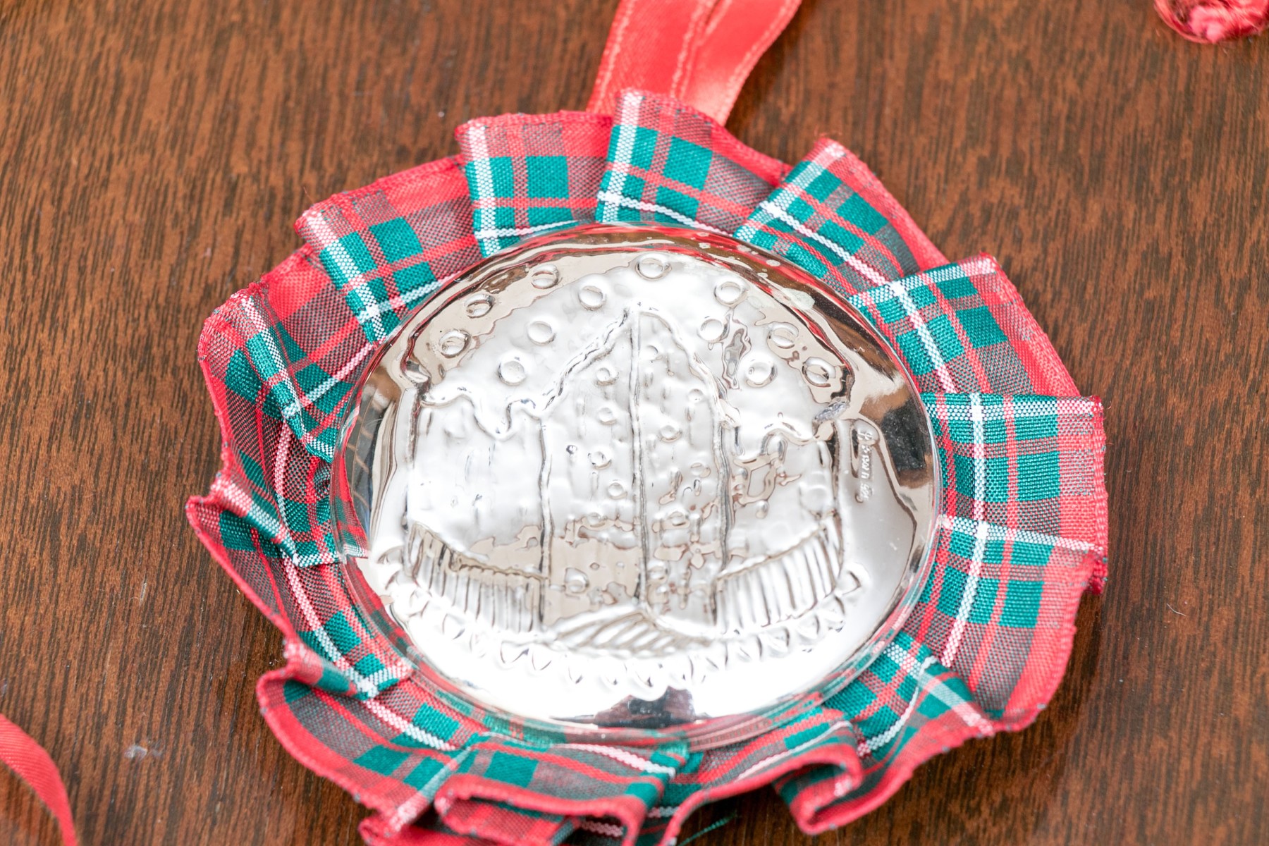 Thin silver plaques featuring a Christmas tree, a nativity scene, holly, presents, and candles. Three with green velvet backs, some with braid trim and all with plaid fabric frames and ribbons for hanging.