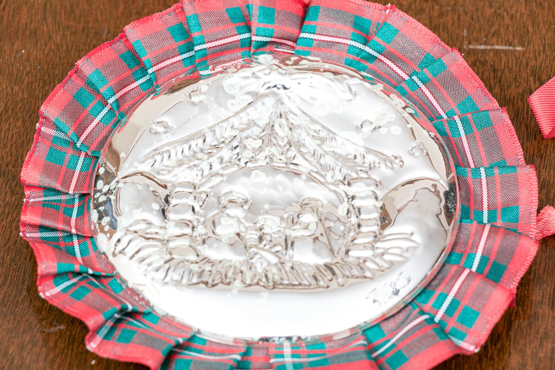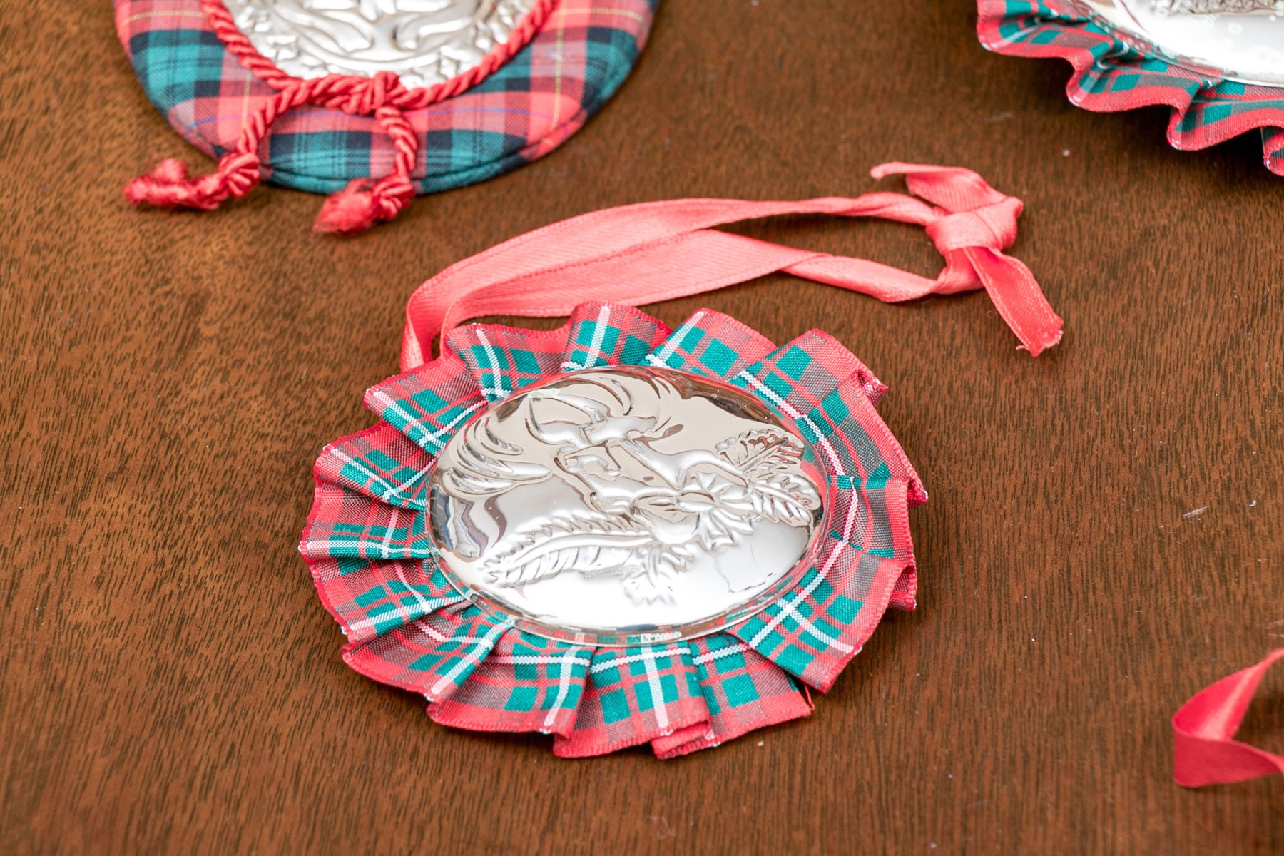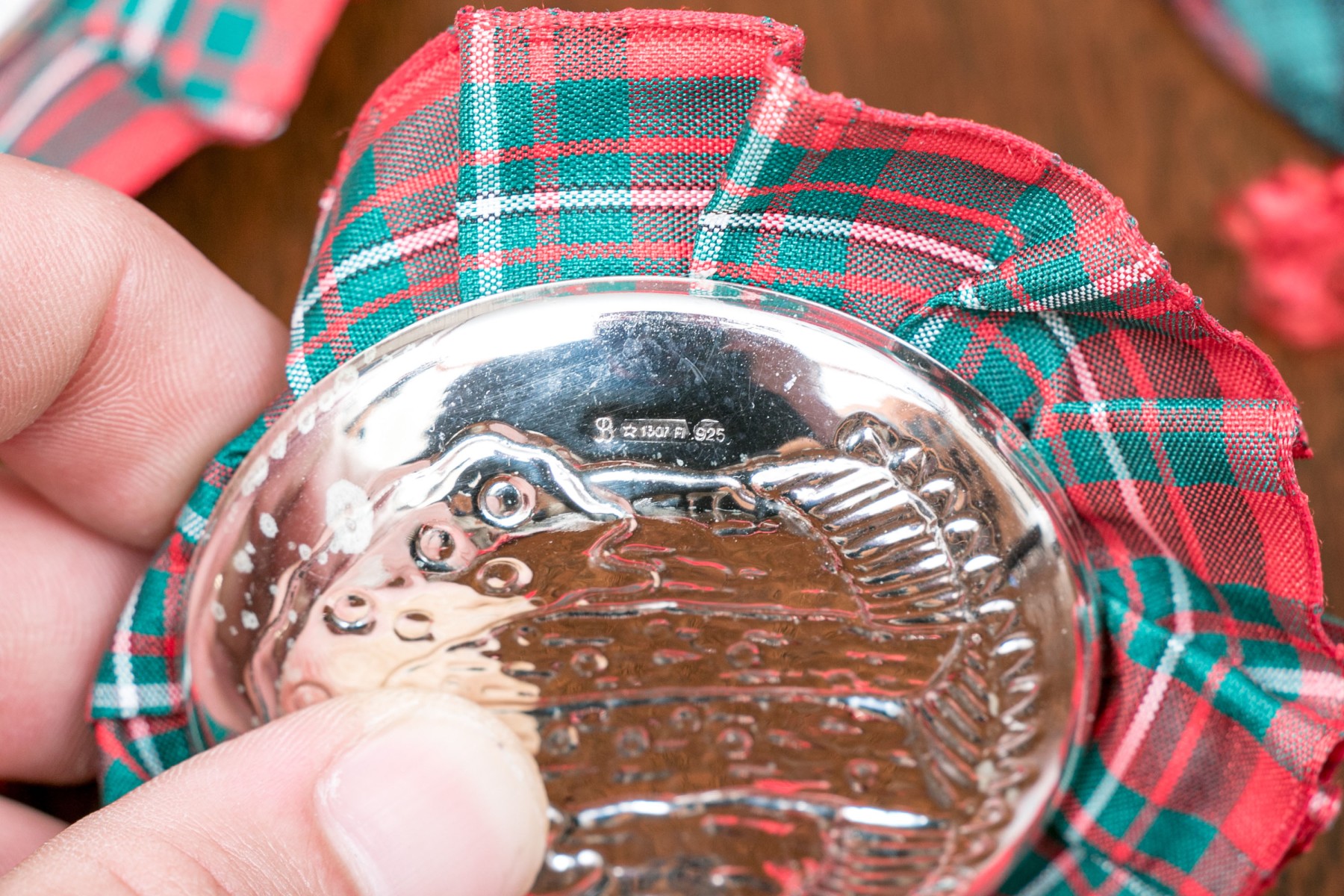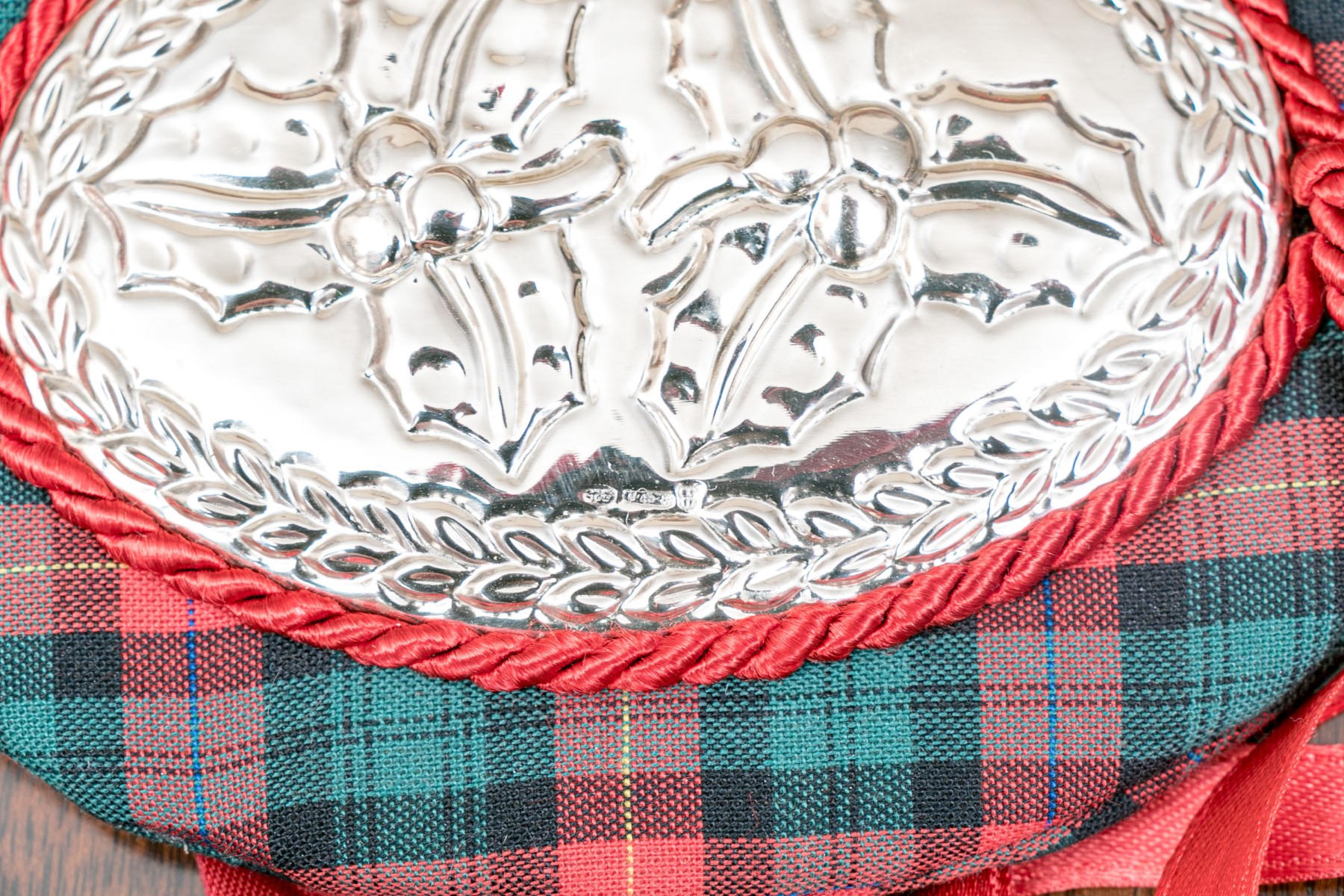 Thin silver plaques featuring a Christmas tree, a nativity scene, holly, presents, and candles. Three with green velvet backs, some with braid trim and all with plaid fabric frames and ribbons for hanging.