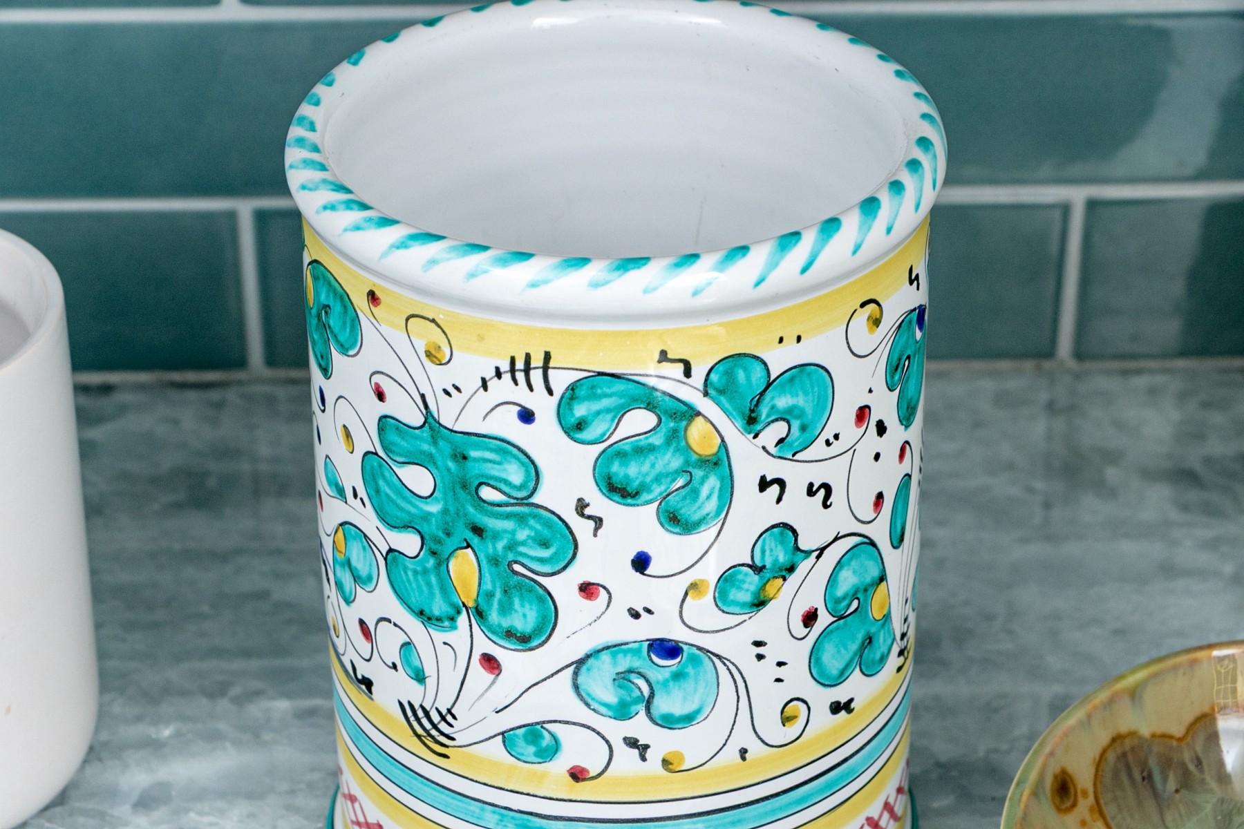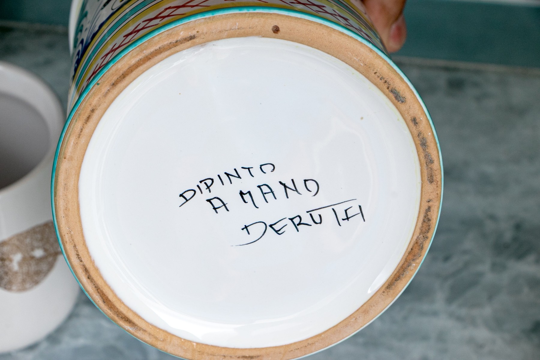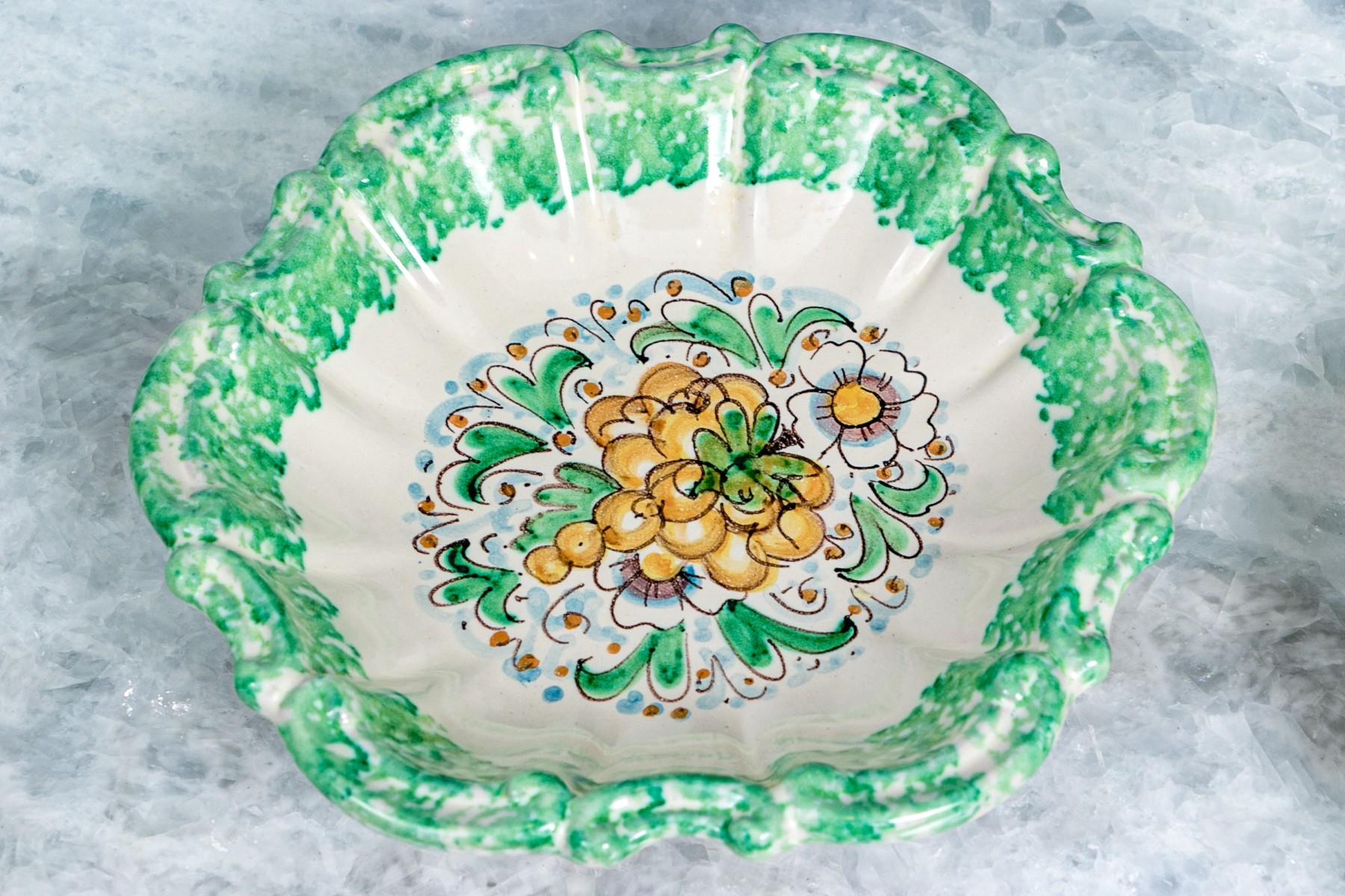 Fun and colorful group of tabletop items and service ware. Two small bowls are signed.