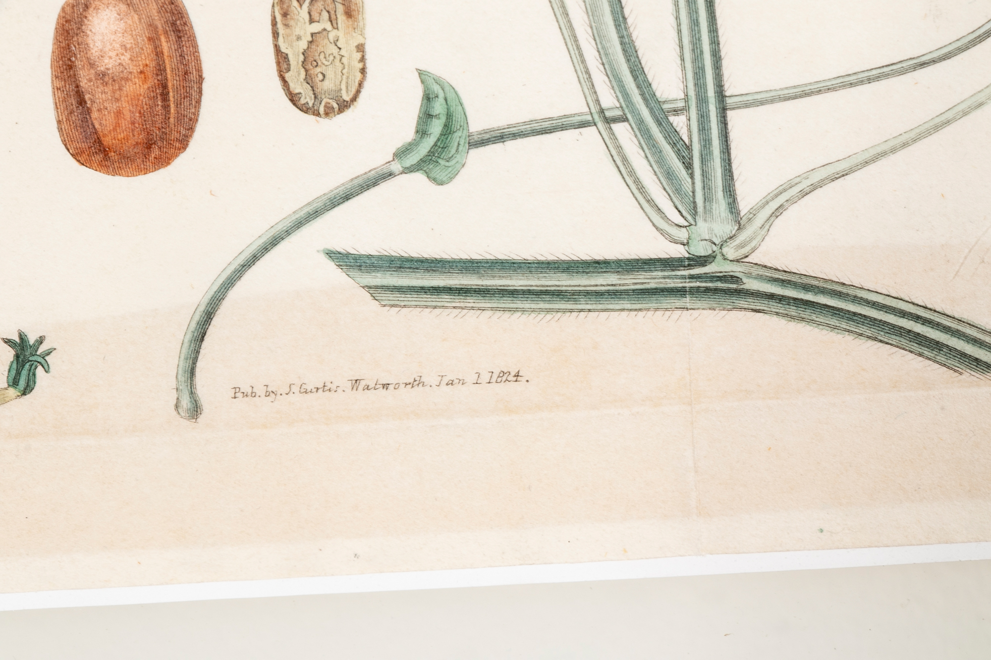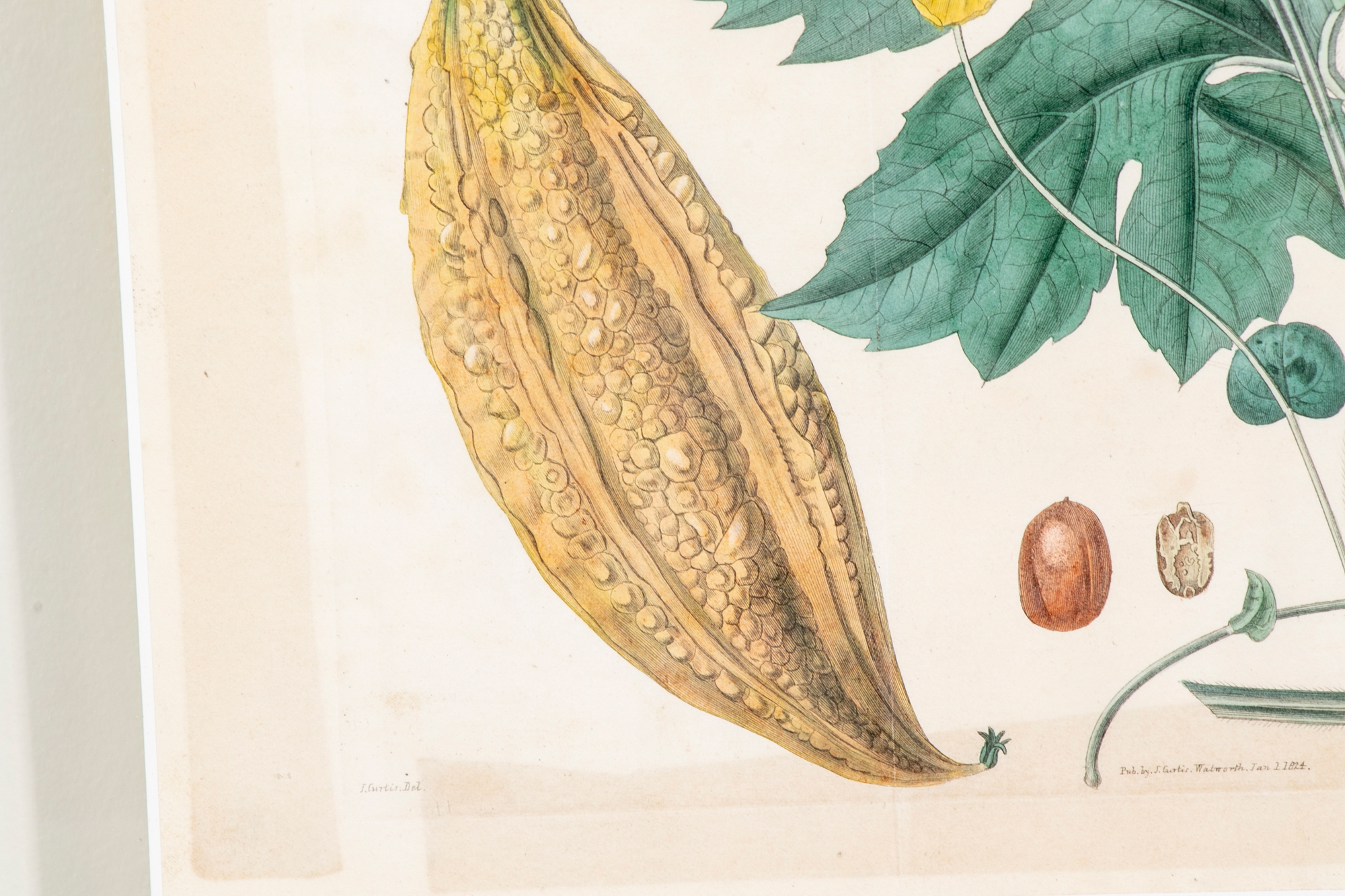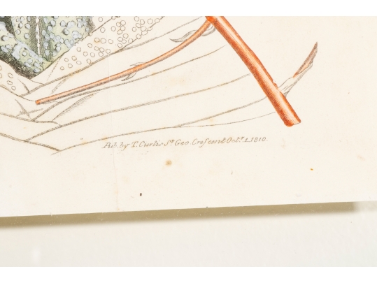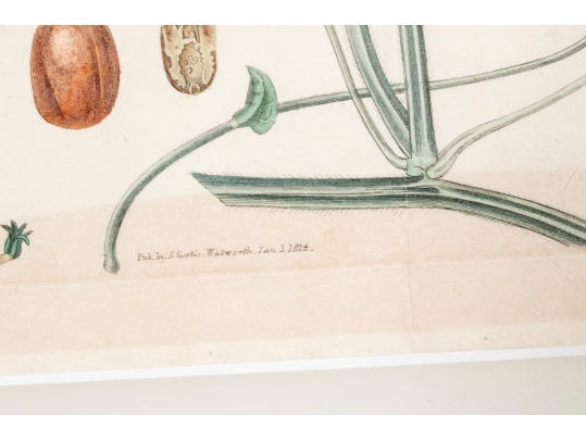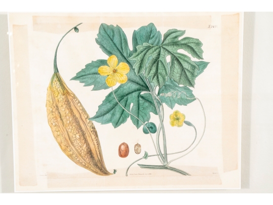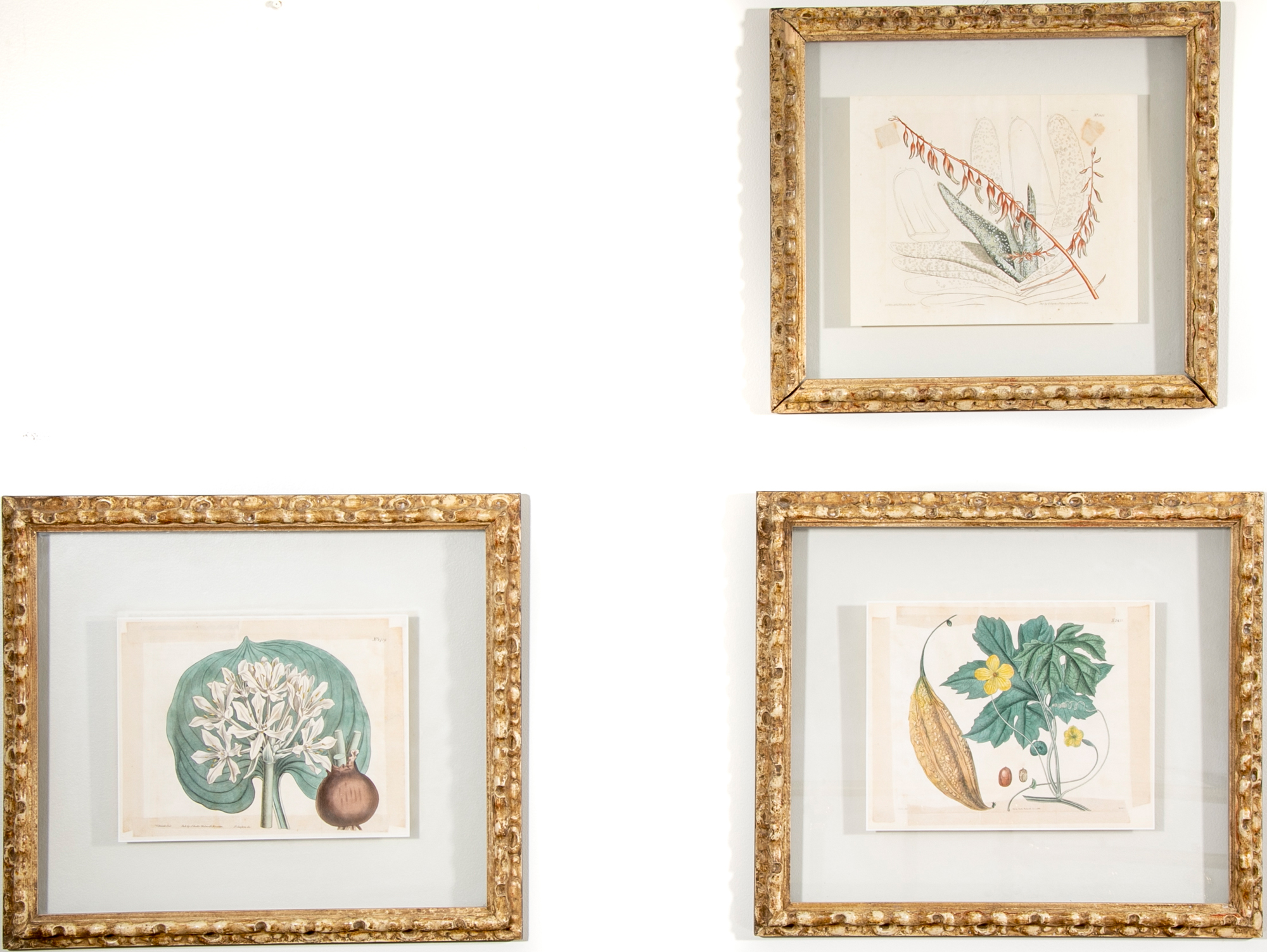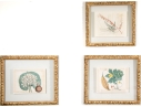 A group of three Antique Botanical Prints custom framed with an interesting floating effect. The sculpted frames have an antique Creme paint finish and relate well to the muted Mustard, Green, Coral and browns of the prints. All are in very good condition with only acceptable and minor age and use wear.
