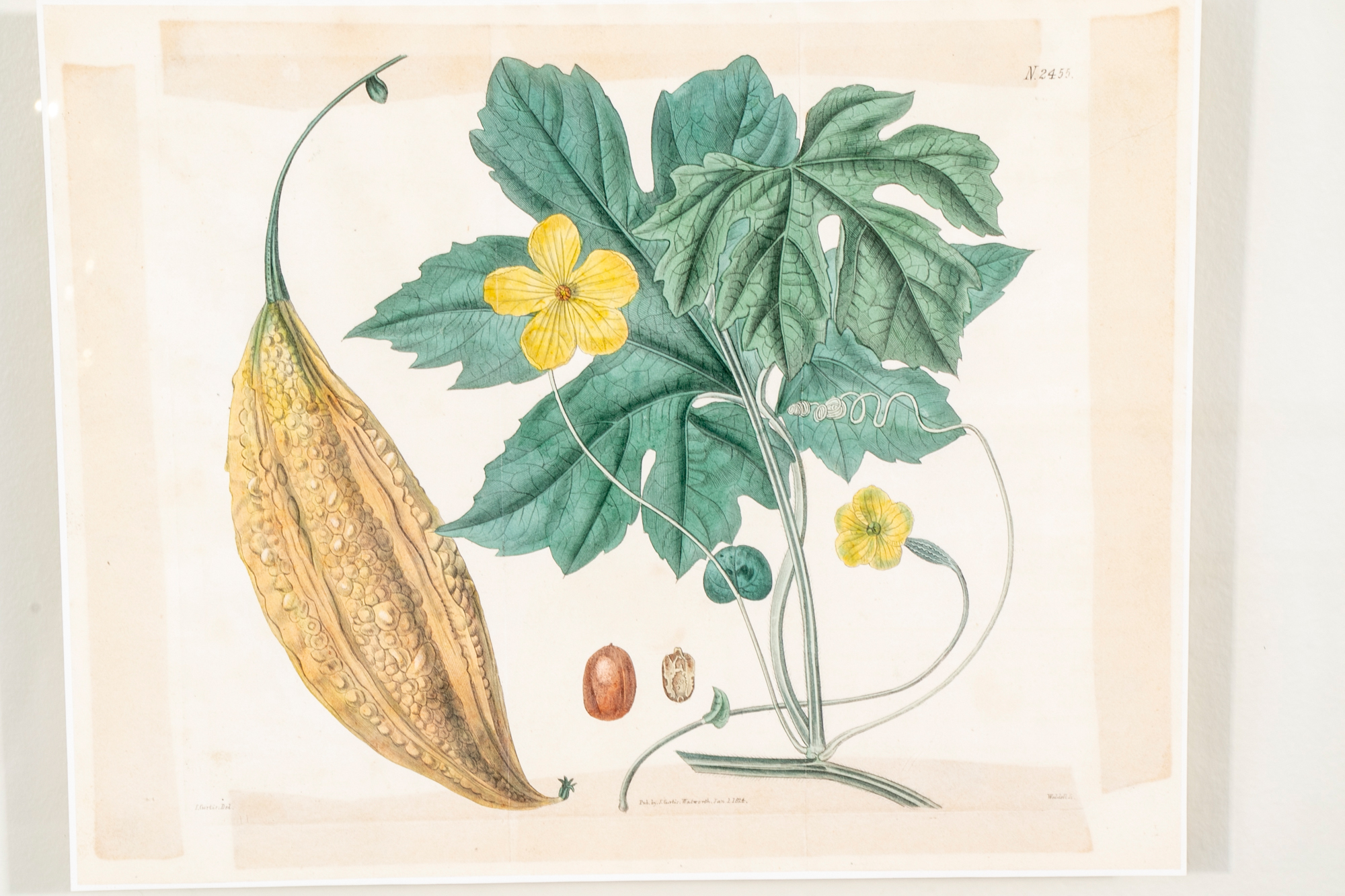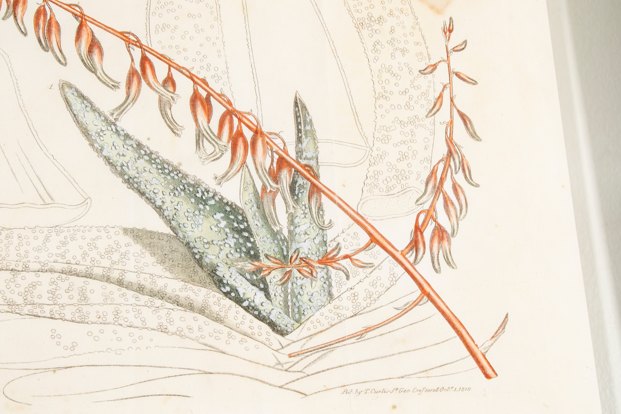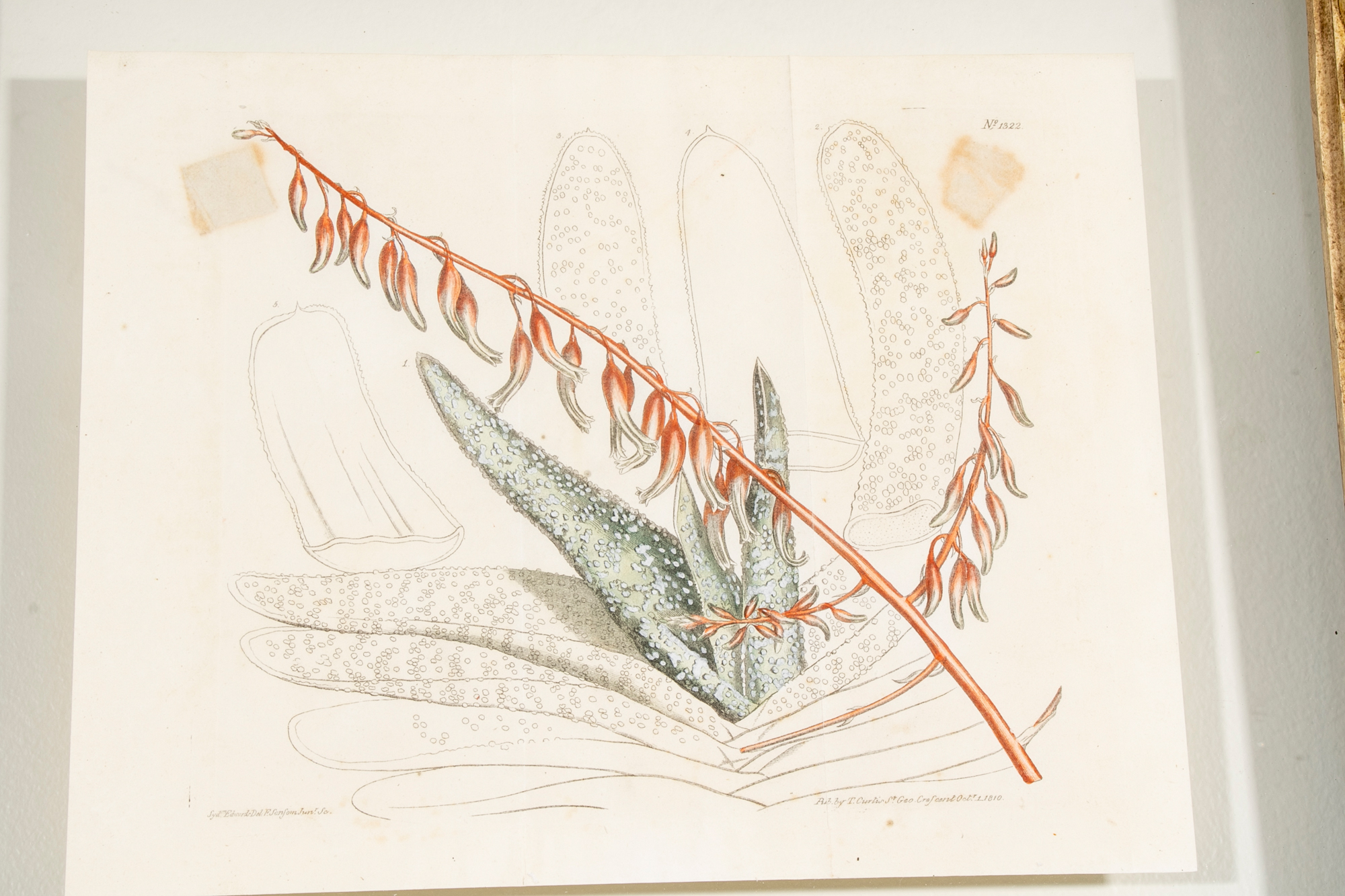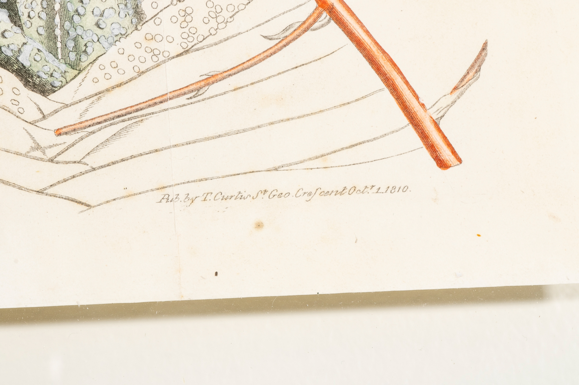 A group of three Antique Botanical Prints custom framed with an interesting floating effect. The sculpted frames have an antique Creme paint finish and relate well to the muted Mustard, Green, Coral and browns of the prints. All are in very good condition with only acceptable and minor age and use wear.