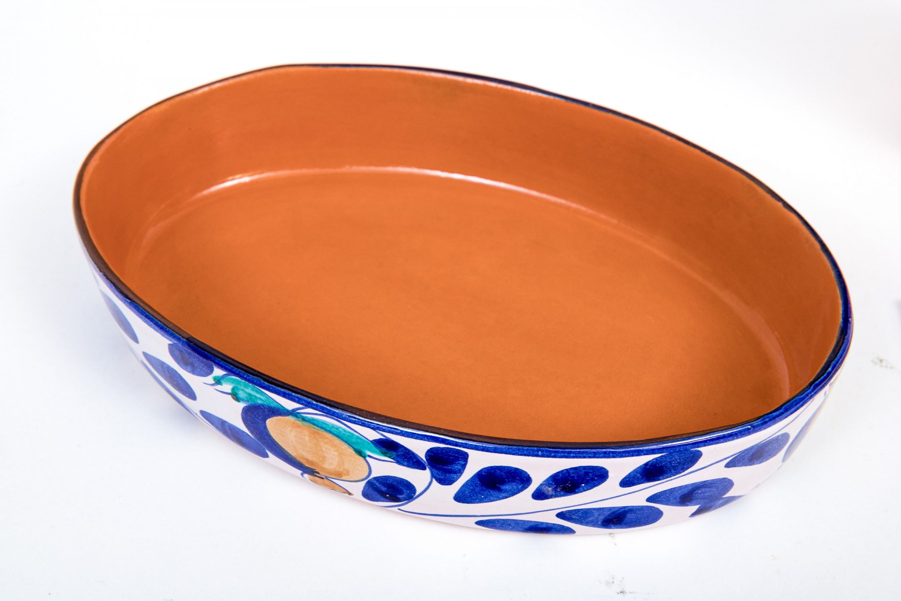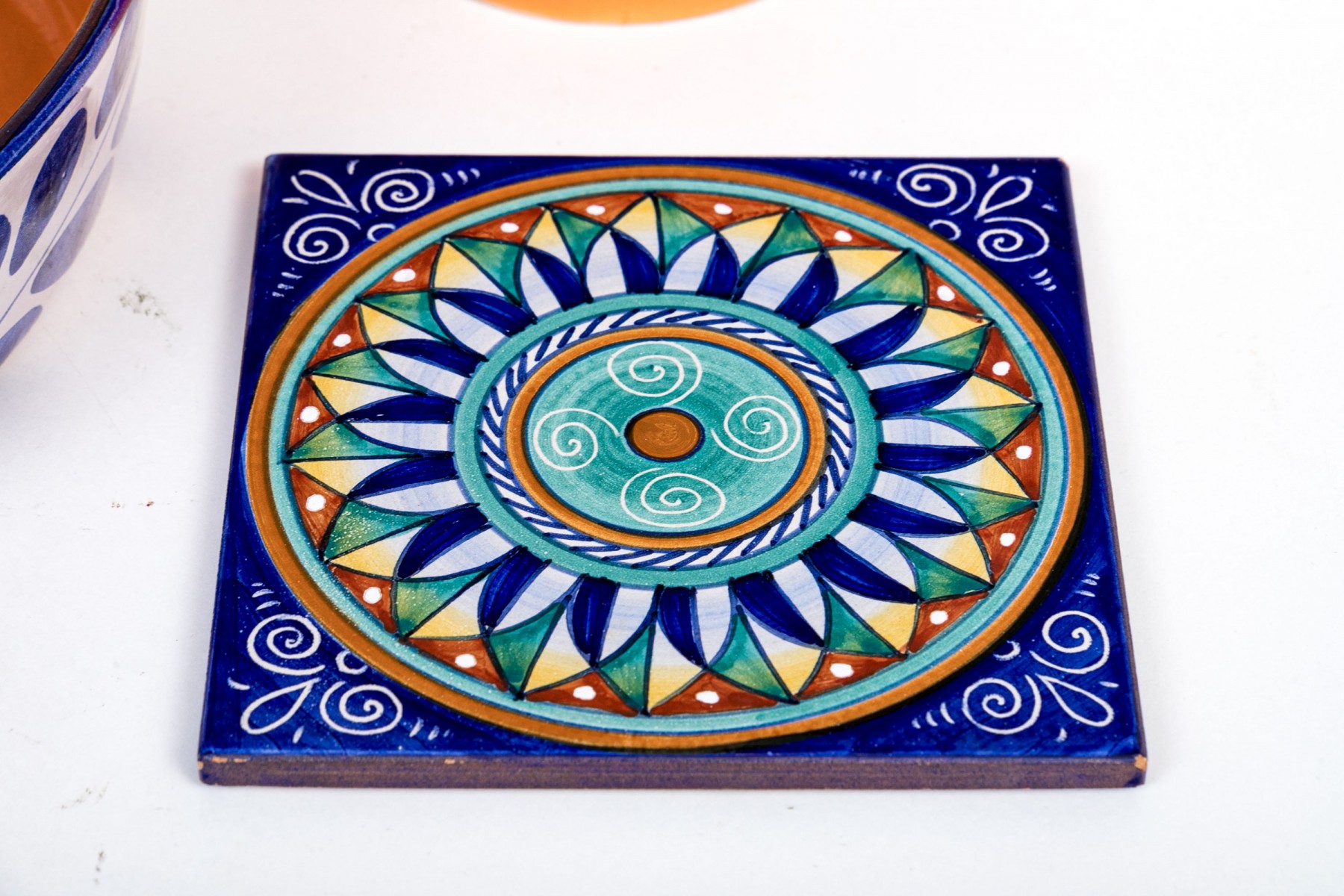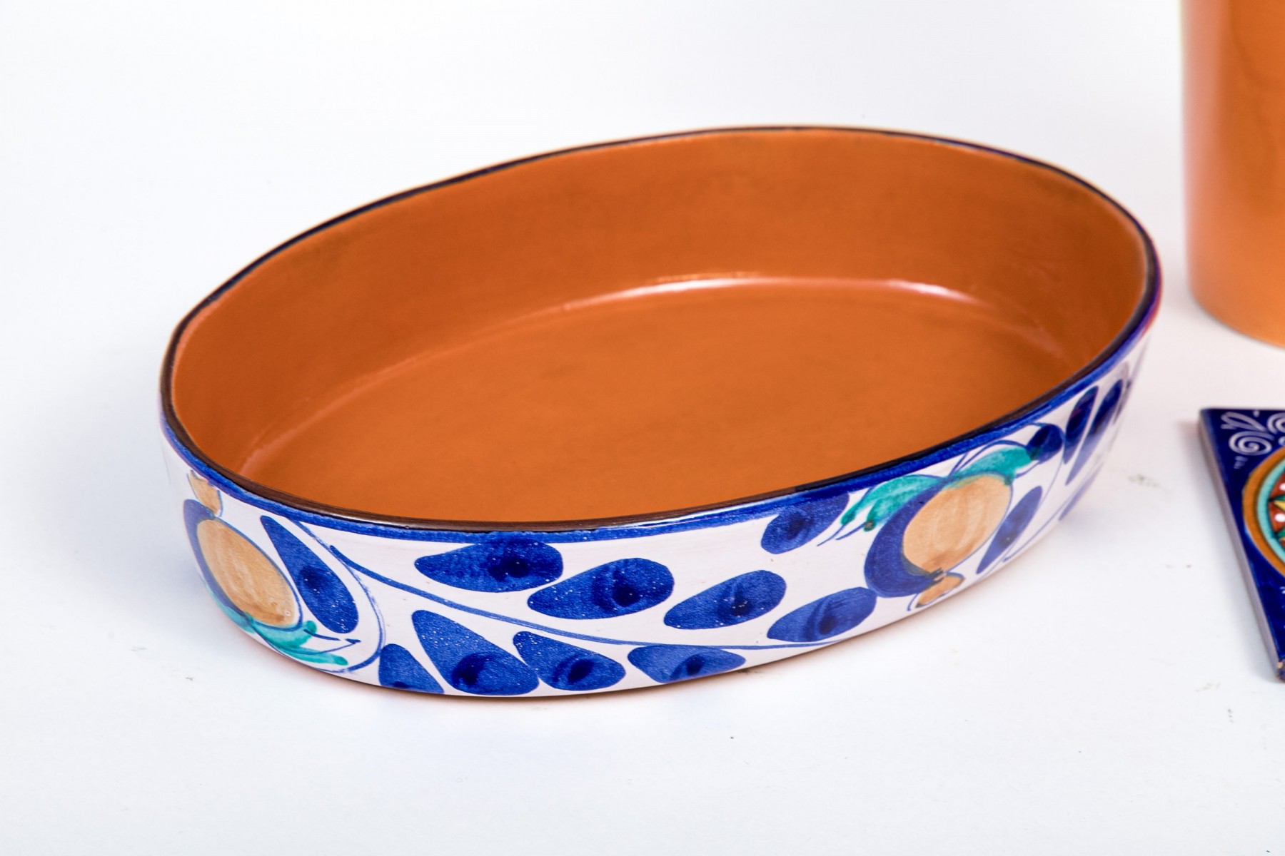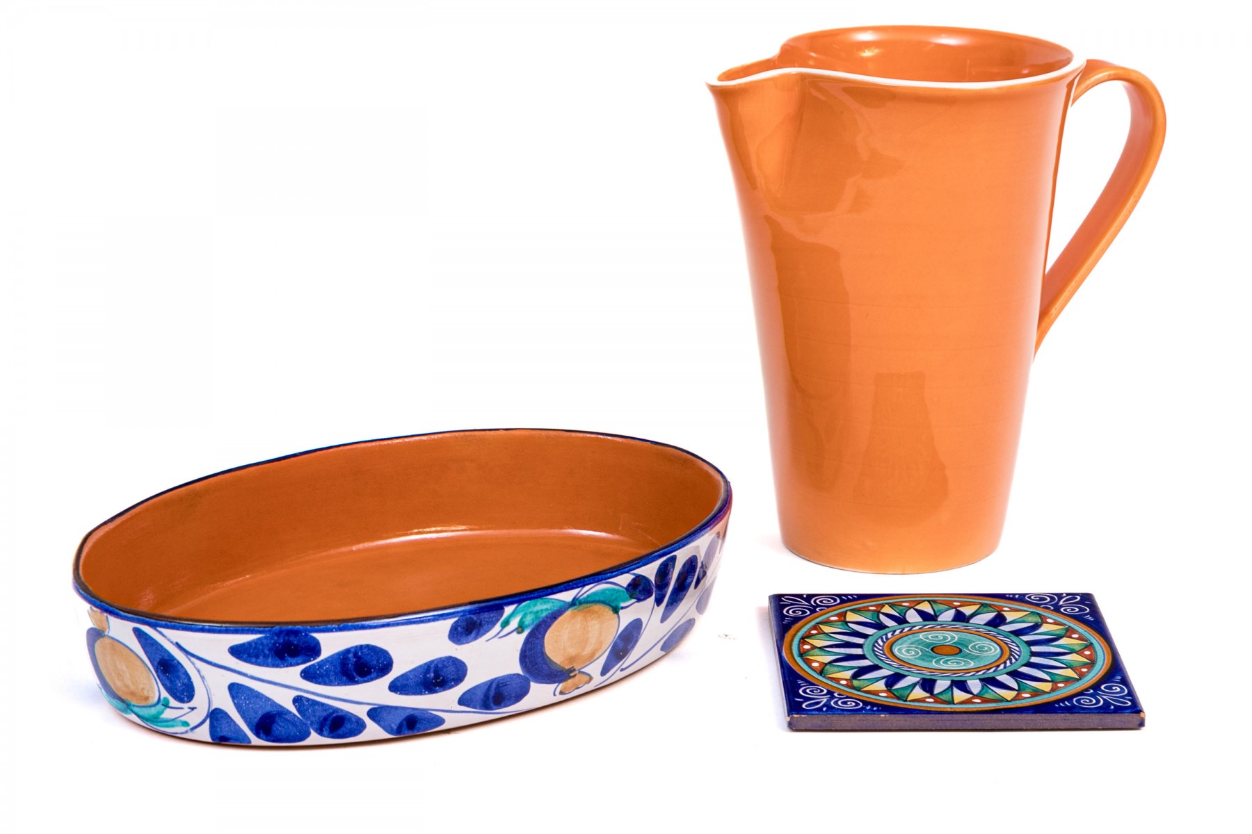 Including; a tall orange pitcher, an oval baker with fruit and vine motifs on the sides, and a square tile with sun motif.