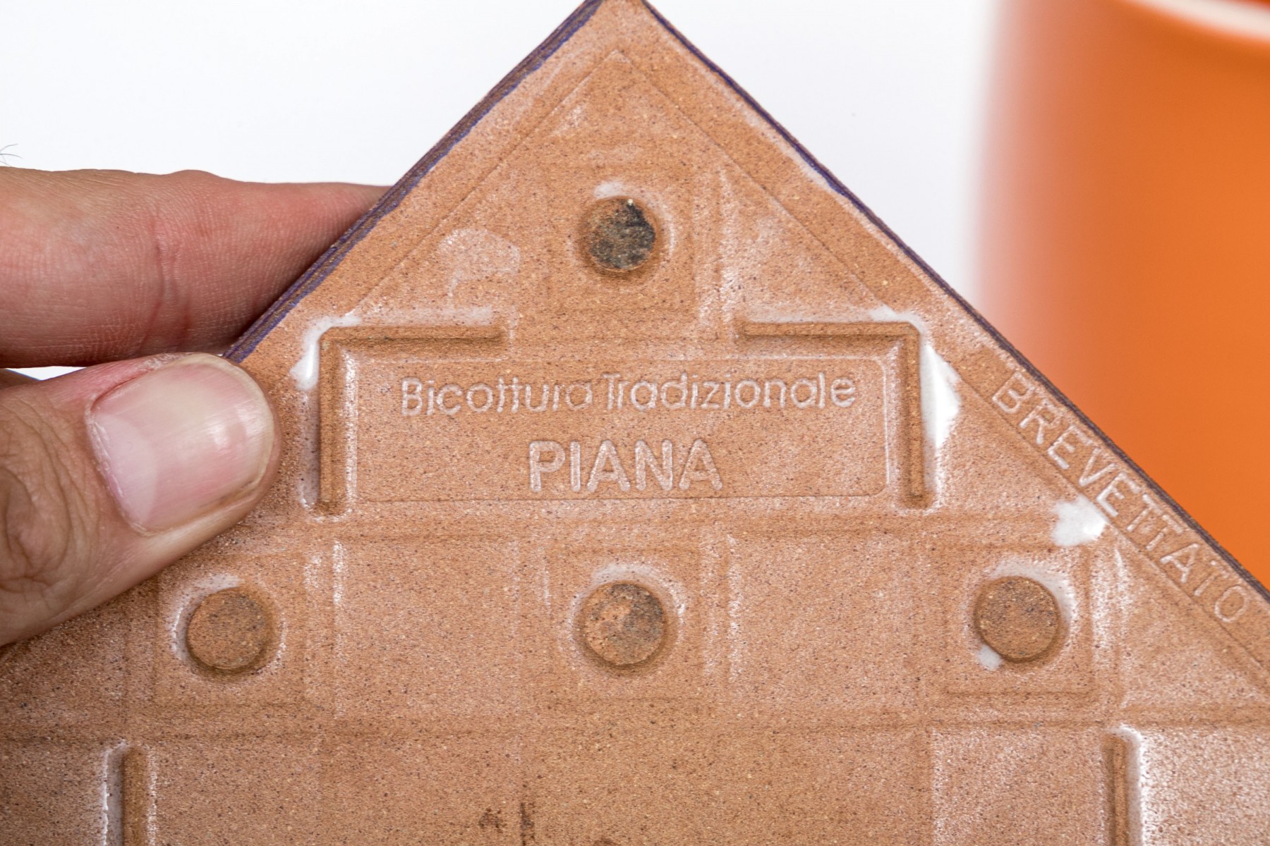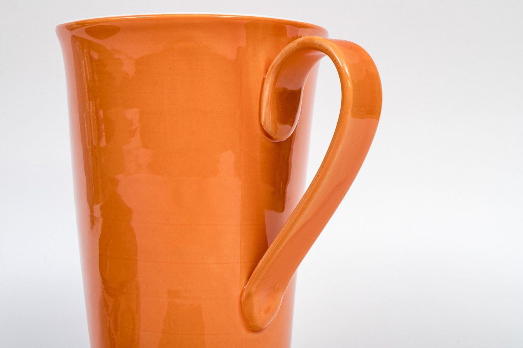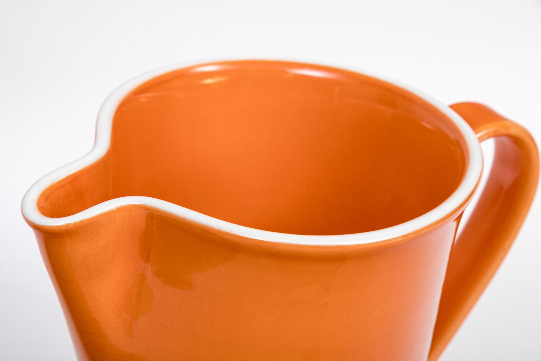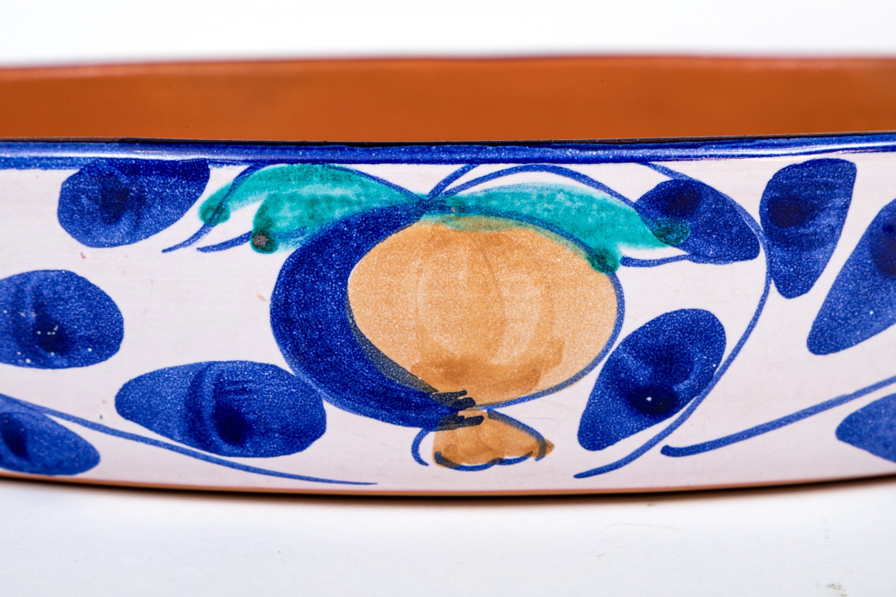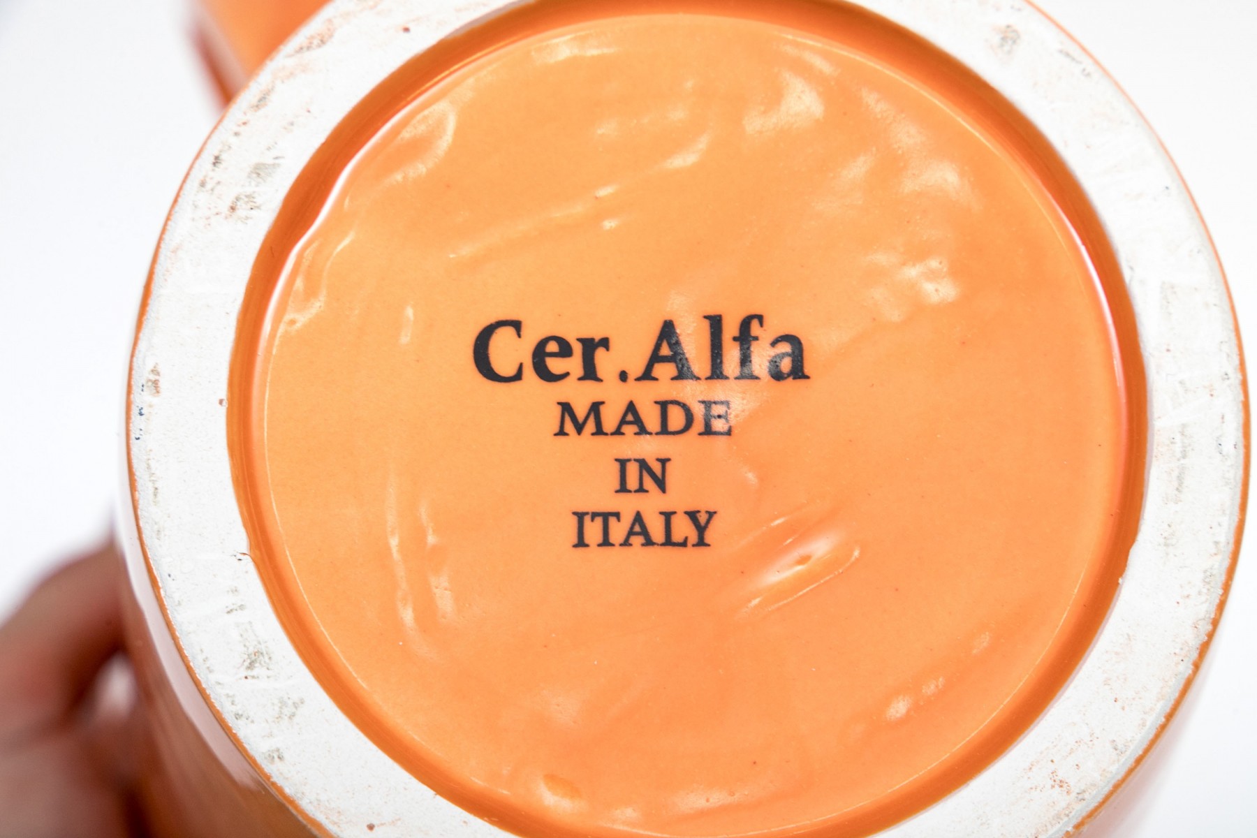 Including; a tall orange pitcher, an oval baker with fruit and vine motifs on the sides, and a square tile with sun motif.