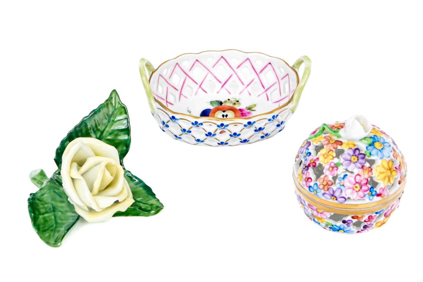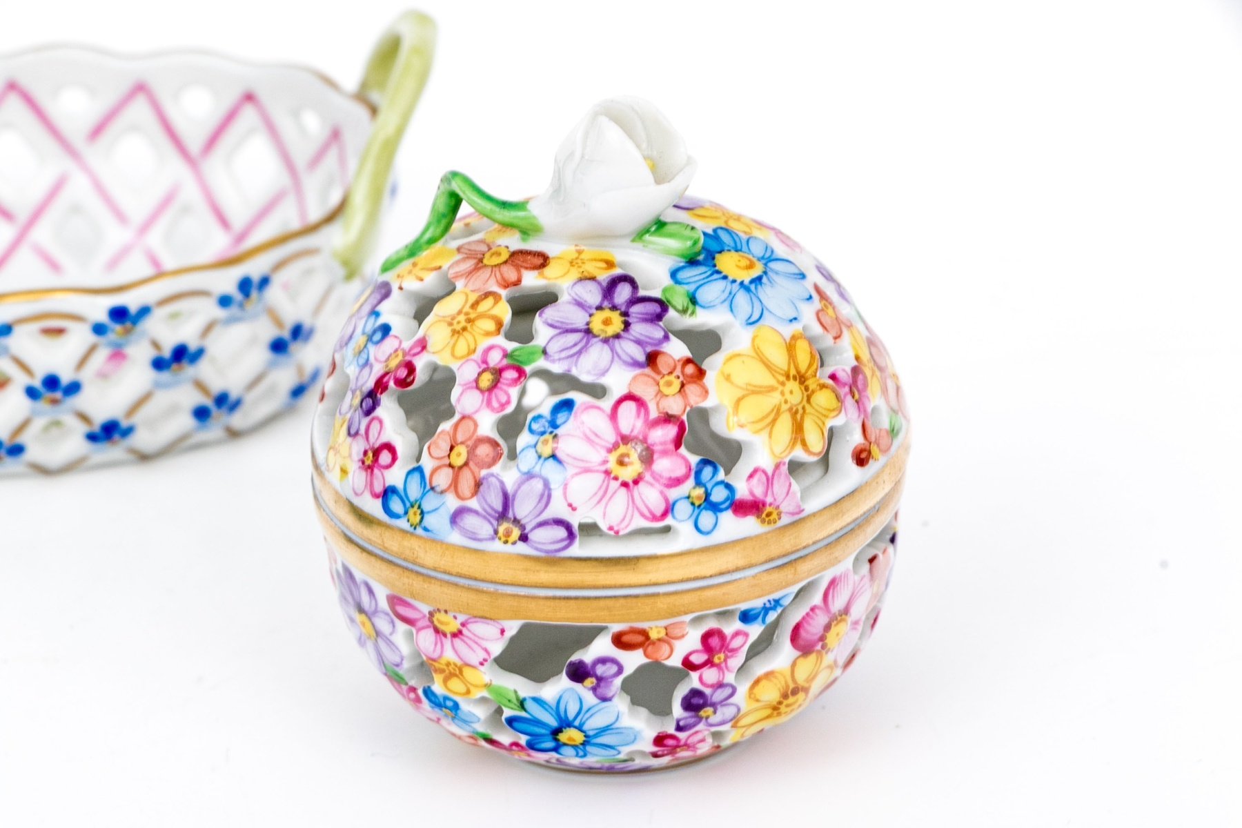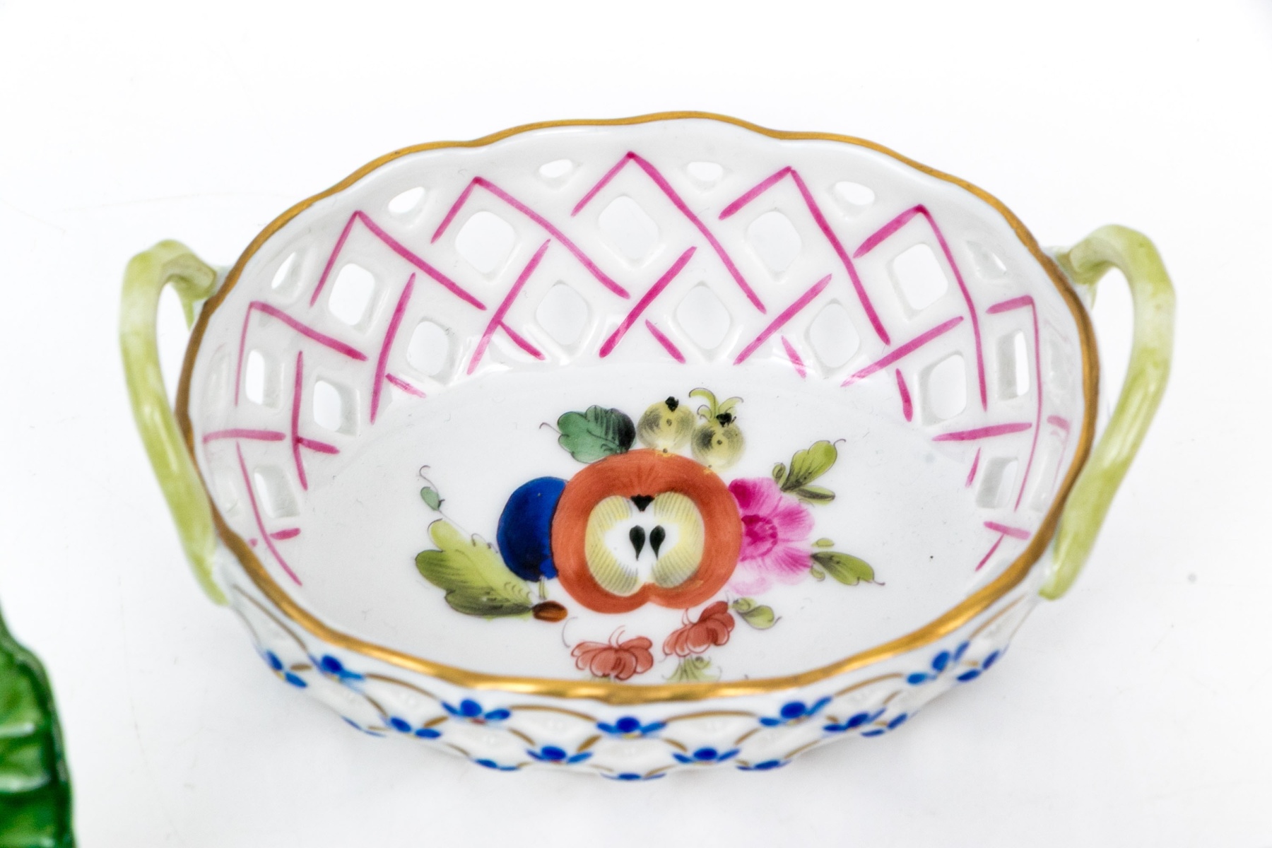 - Reticulated Floral Basket (Model 7451/DFR) – A delicate openwork basket featuring a lattice design hand-painted in pink and blue with tiny applied blue forget-me-nots and green handles. The interior is beautifully adorned with a central floral bouquet, trimmed in 24K gold. 3 1/4" W x 2 1/4" D x 1 3/8" H