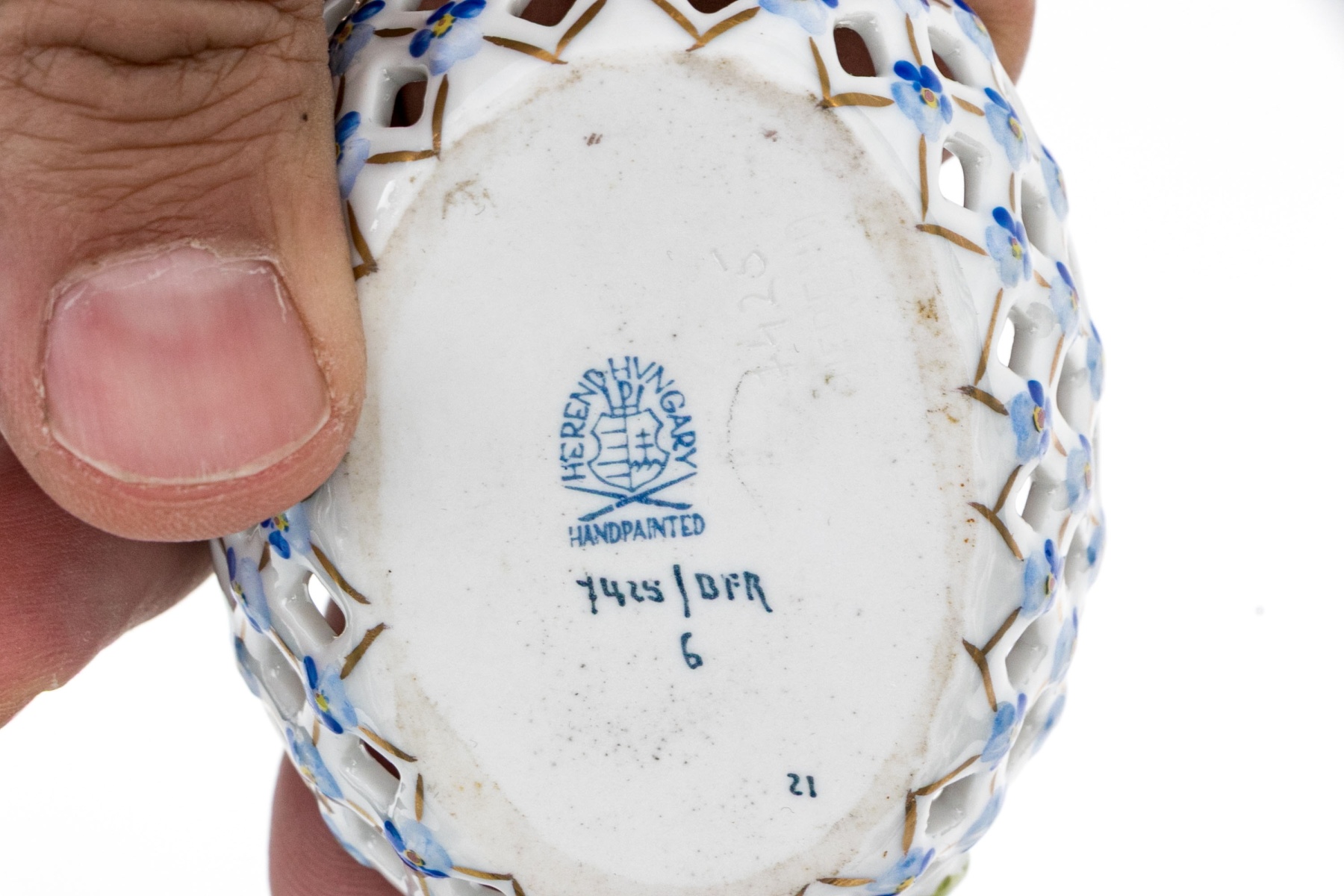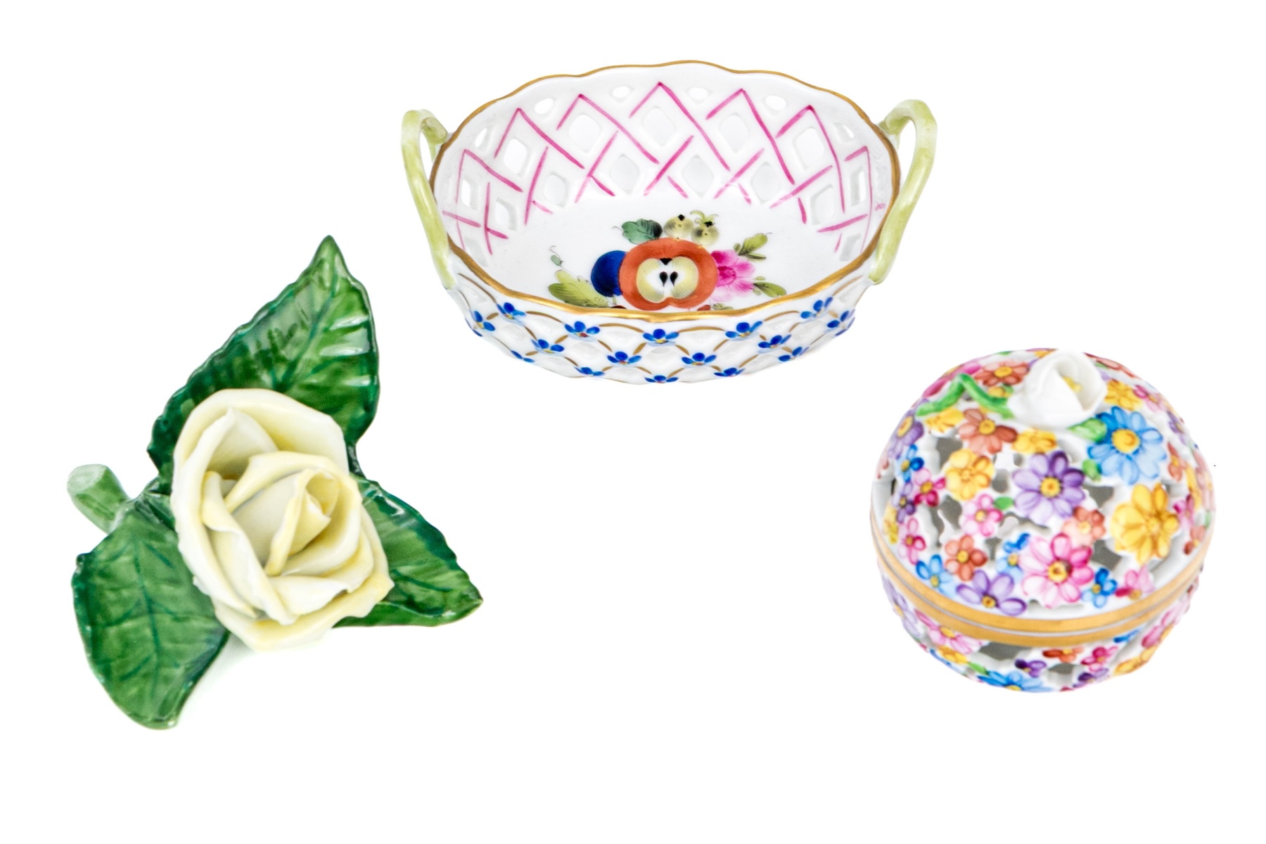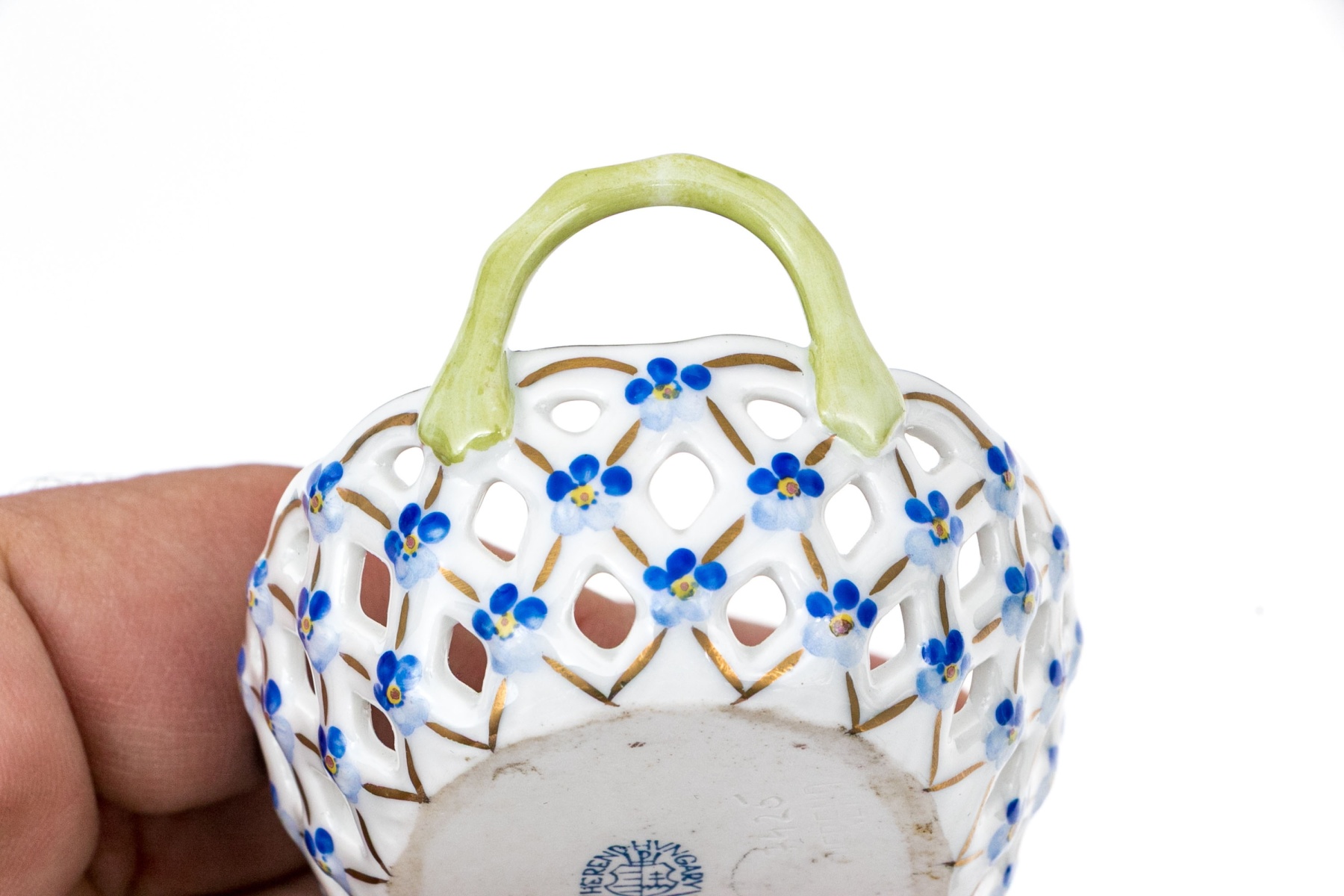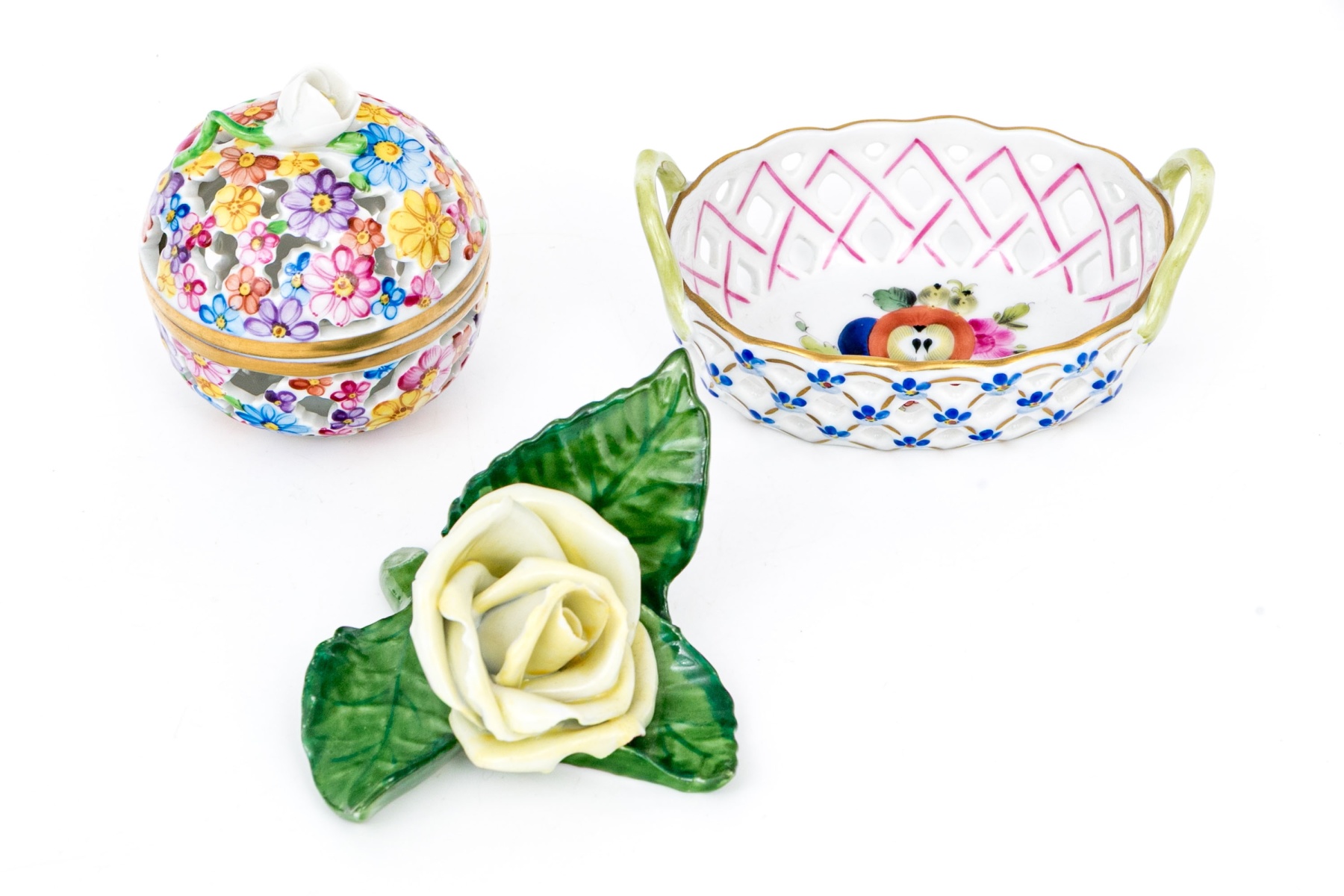 - Reticulated Floral Basket (Model 7451/DFR) – A delicate openwork basket featuring a lattice design hand-painted in pink and blue with tiny applied blue forget-me-nots and green handles. The interior is beautifully adorned with a central floral bouquet, trimmed in 24K gold. 3 1/4" W x 2 1/4" D x 1 3/8" H