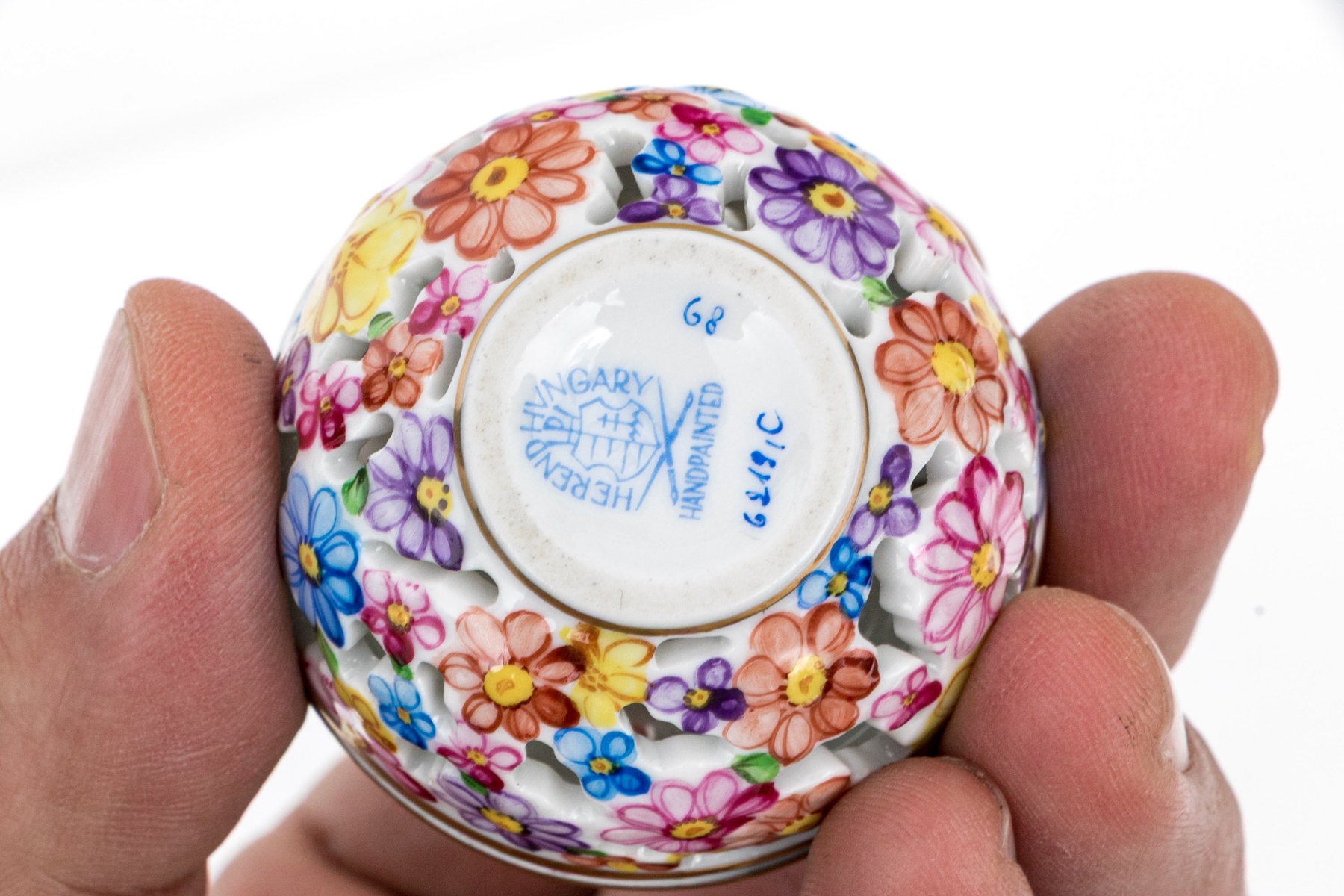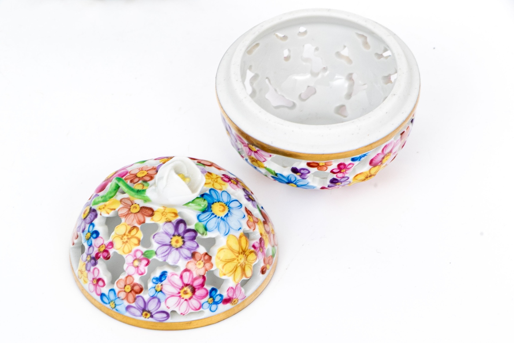 - Floral Dome Box (Model 6211/C) – A pierced floral box decorated in Herend’s bright multicolor “Rothschild Basket” style florals, each blossom individually hand-painted and highlighted with gilt detailing. The domed lid features a raised floral finial, and the base is fully openwork. 2" Dia x 2 1/4" H