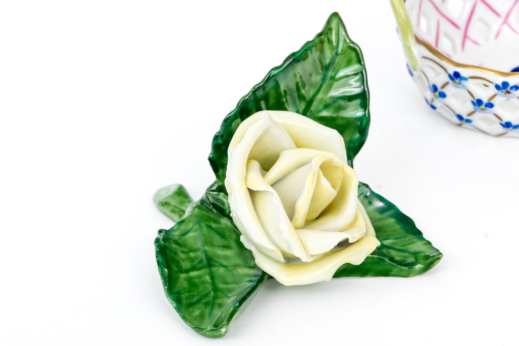 - Yellow Rose with Green Leaf Base (Model 1942) – A realistic porcelain rose blossom with layered petals in soft yellow and green, resting atop hand-modeled and painted leaves. Few minor chips to rose petals.