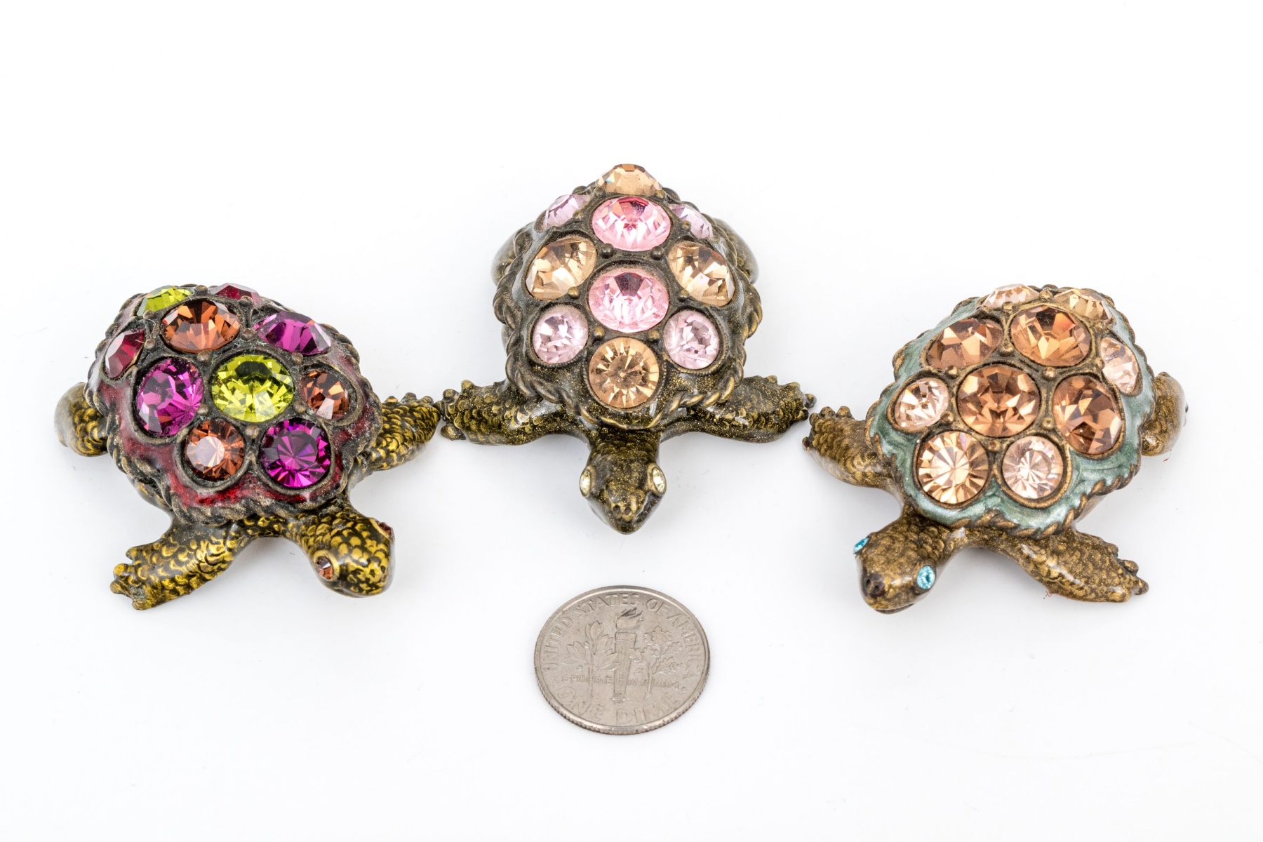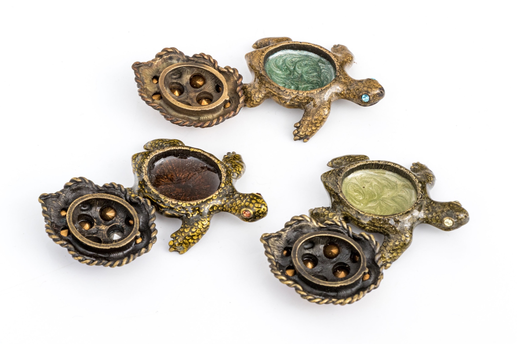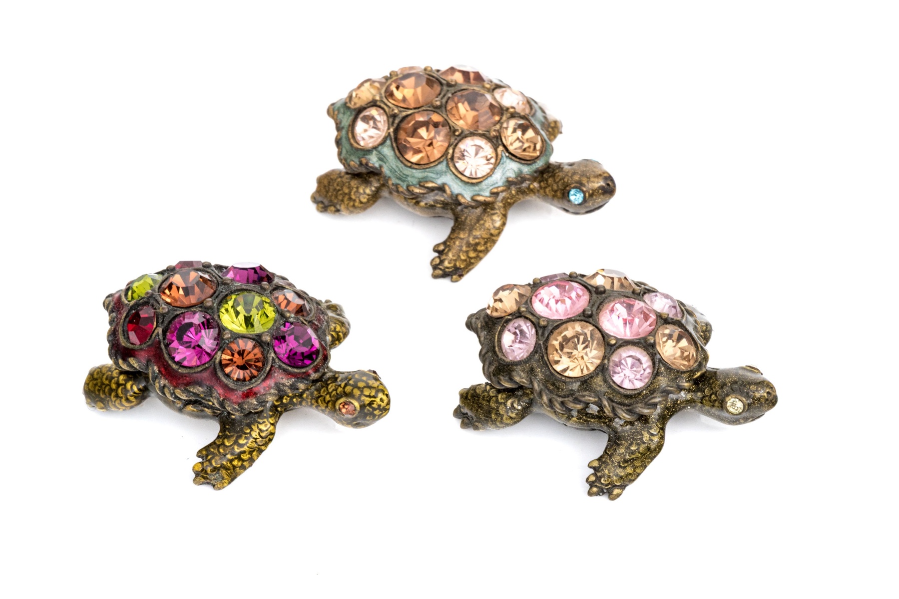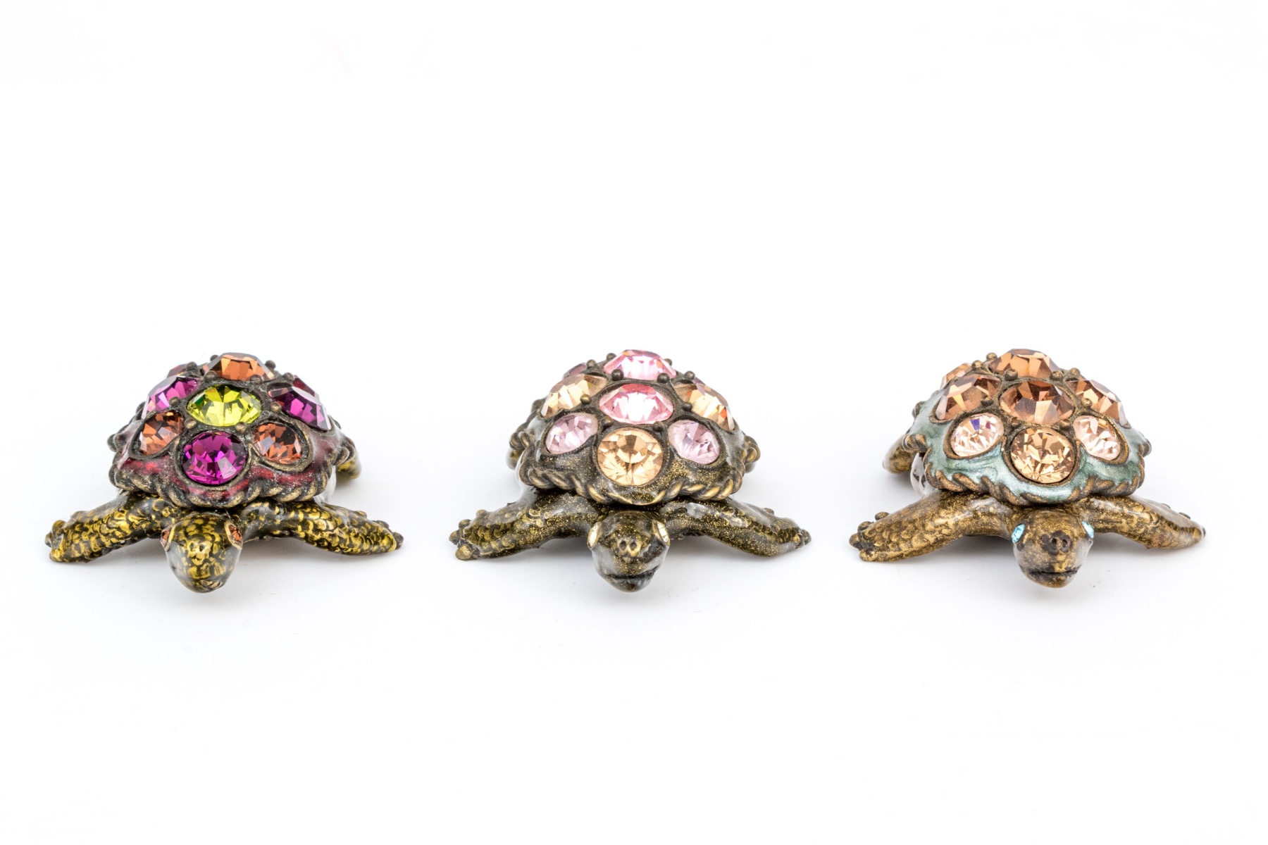 Three sweet tiny turtle form boxes enameled with the backs as lids set with sparkling quality colored stones.
