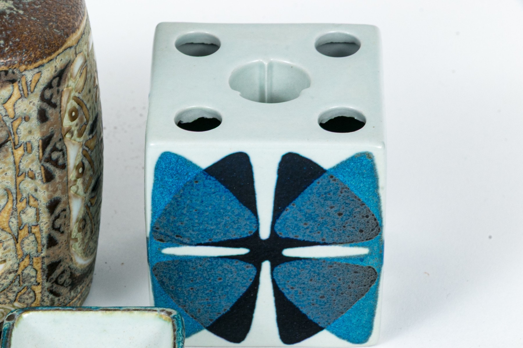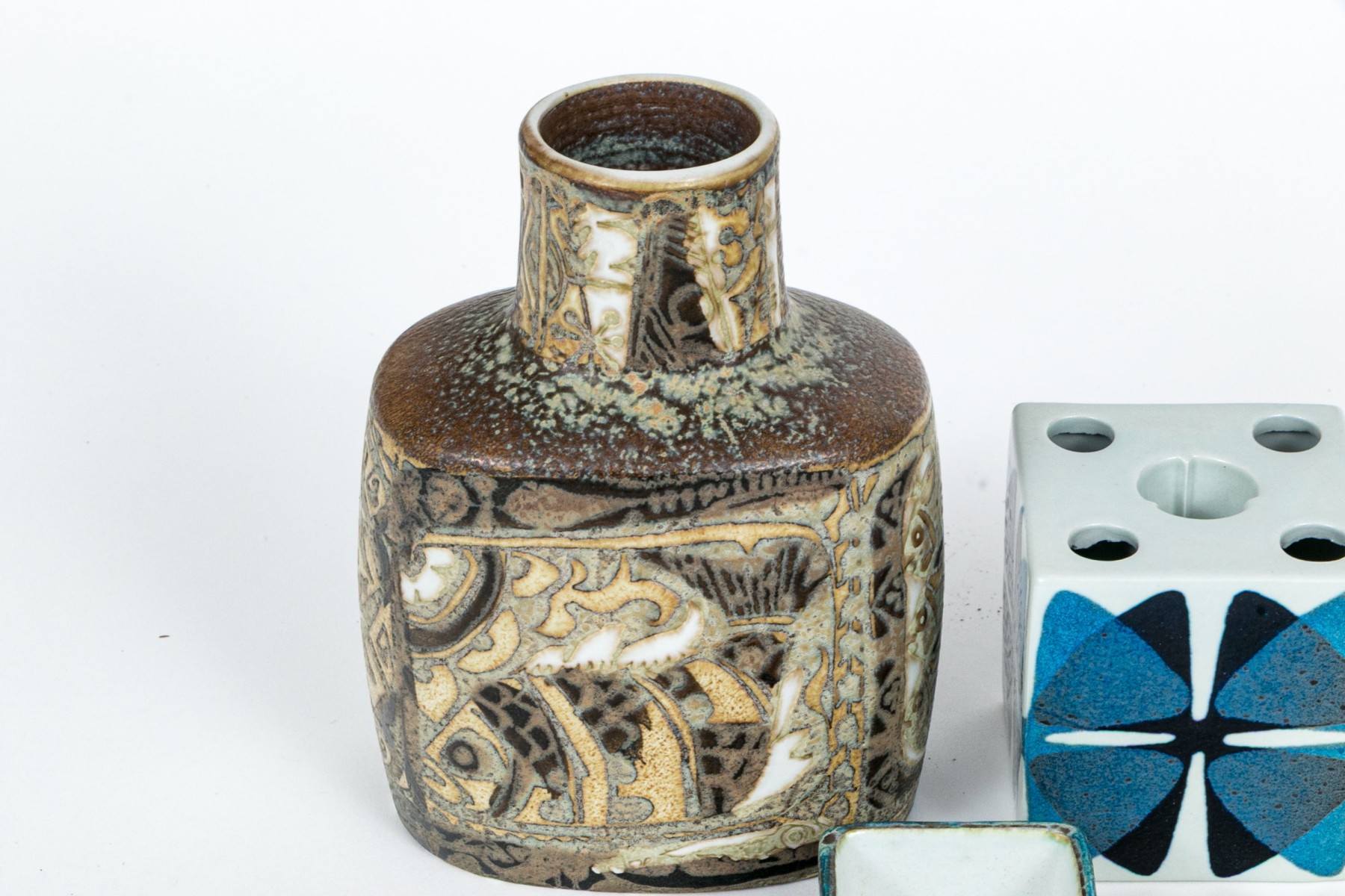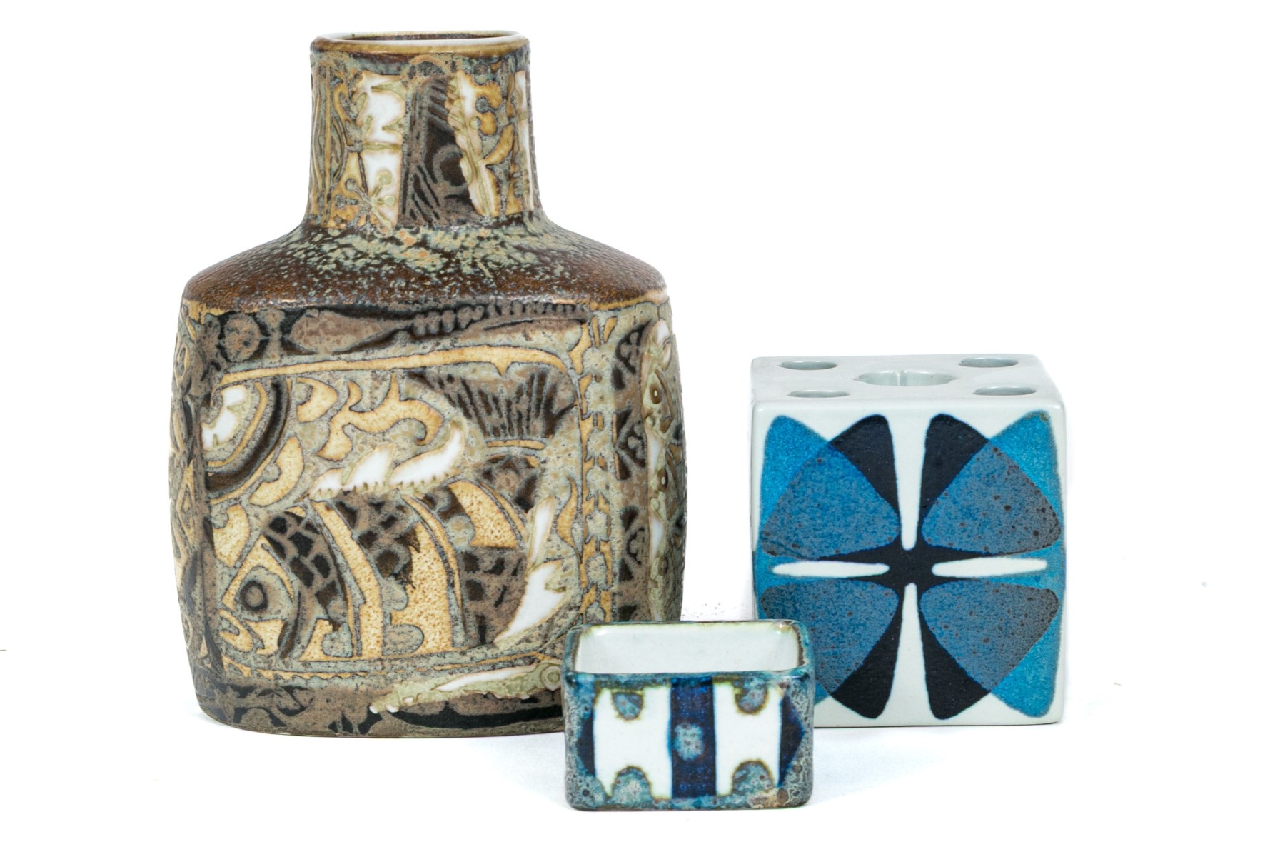 A lovely trio of Royal Copenhagen comprised of a vase, square vase with four apertures for stems and a diminutive cup or bowl. Marked underfoot.