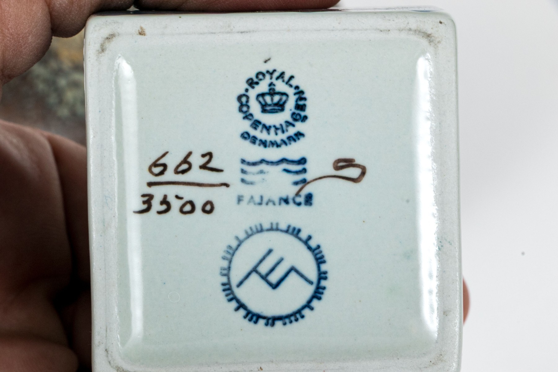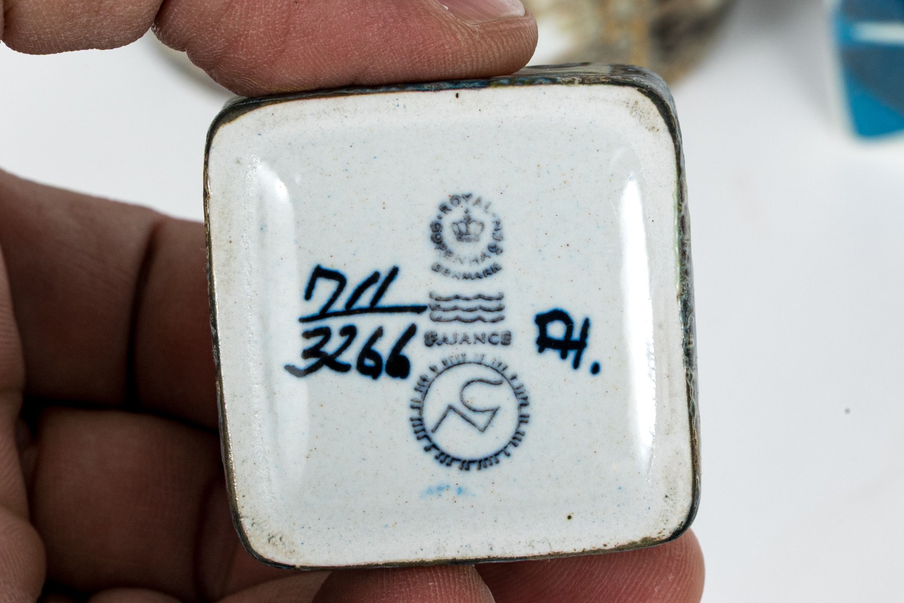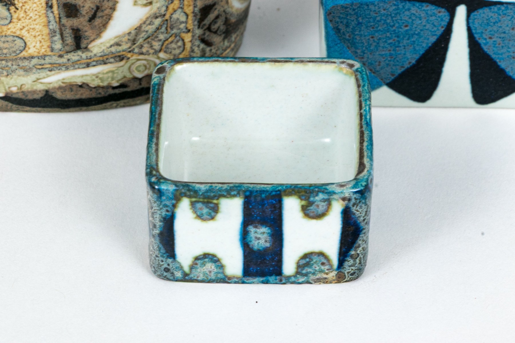 A lovely trio of Royal Copenhagen comprised of a vase, square vase with four apertures for stems and a diminutive cup or bowl. Marked underfoot.