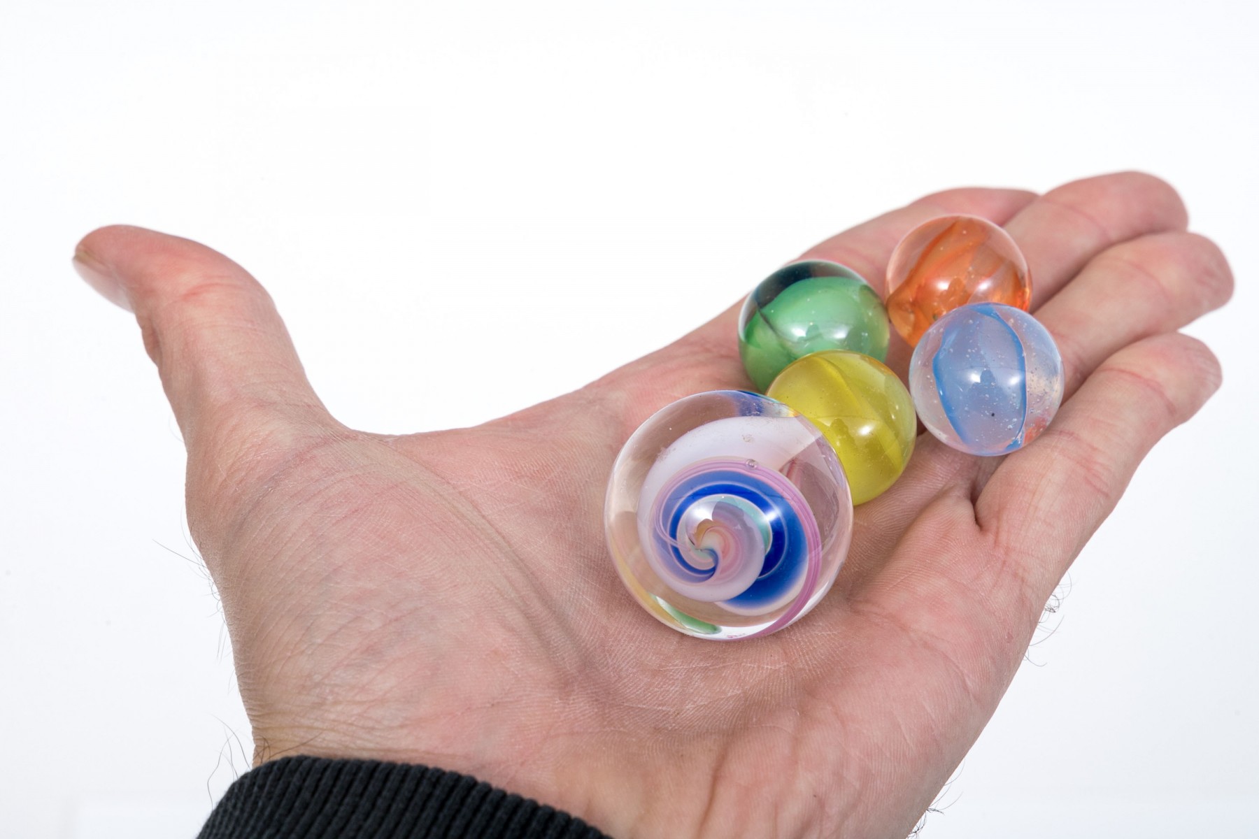 One blue marble, one green marble, one yellow marble, one orange marble, and one swirled rainbow marble.