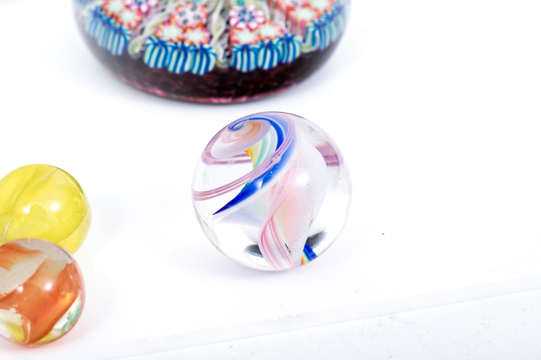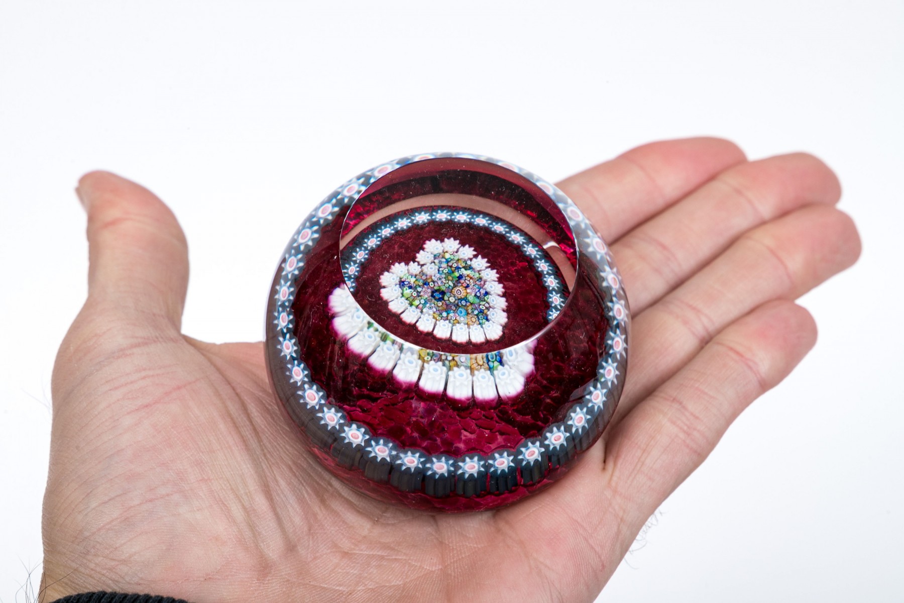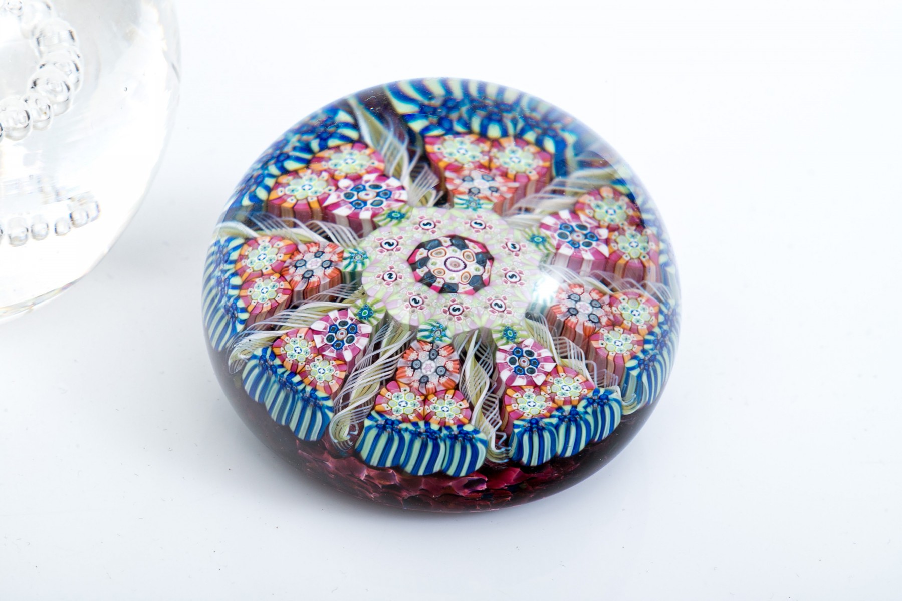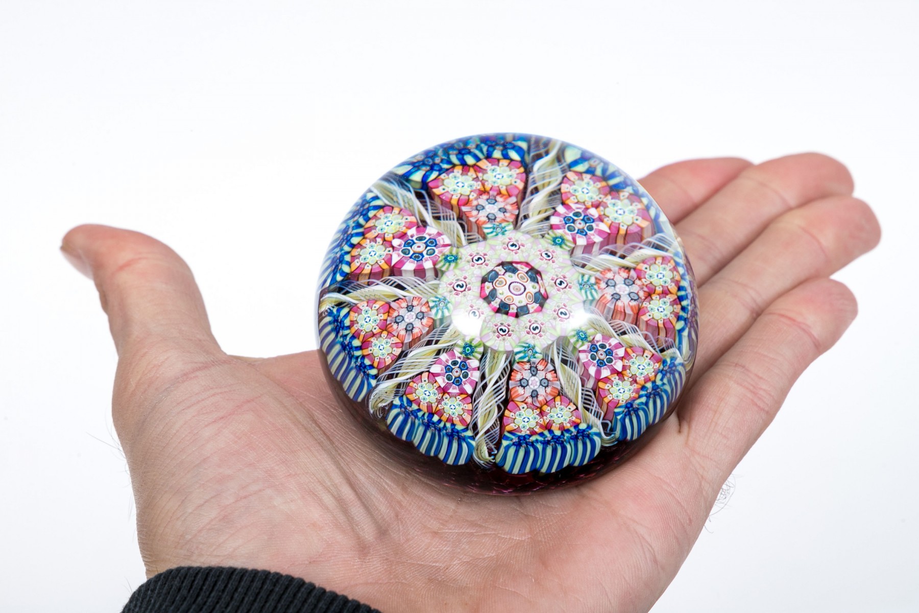 One intricate paperweight in a multicolored hue sun burst pattern with an exceptional three dimensional element
