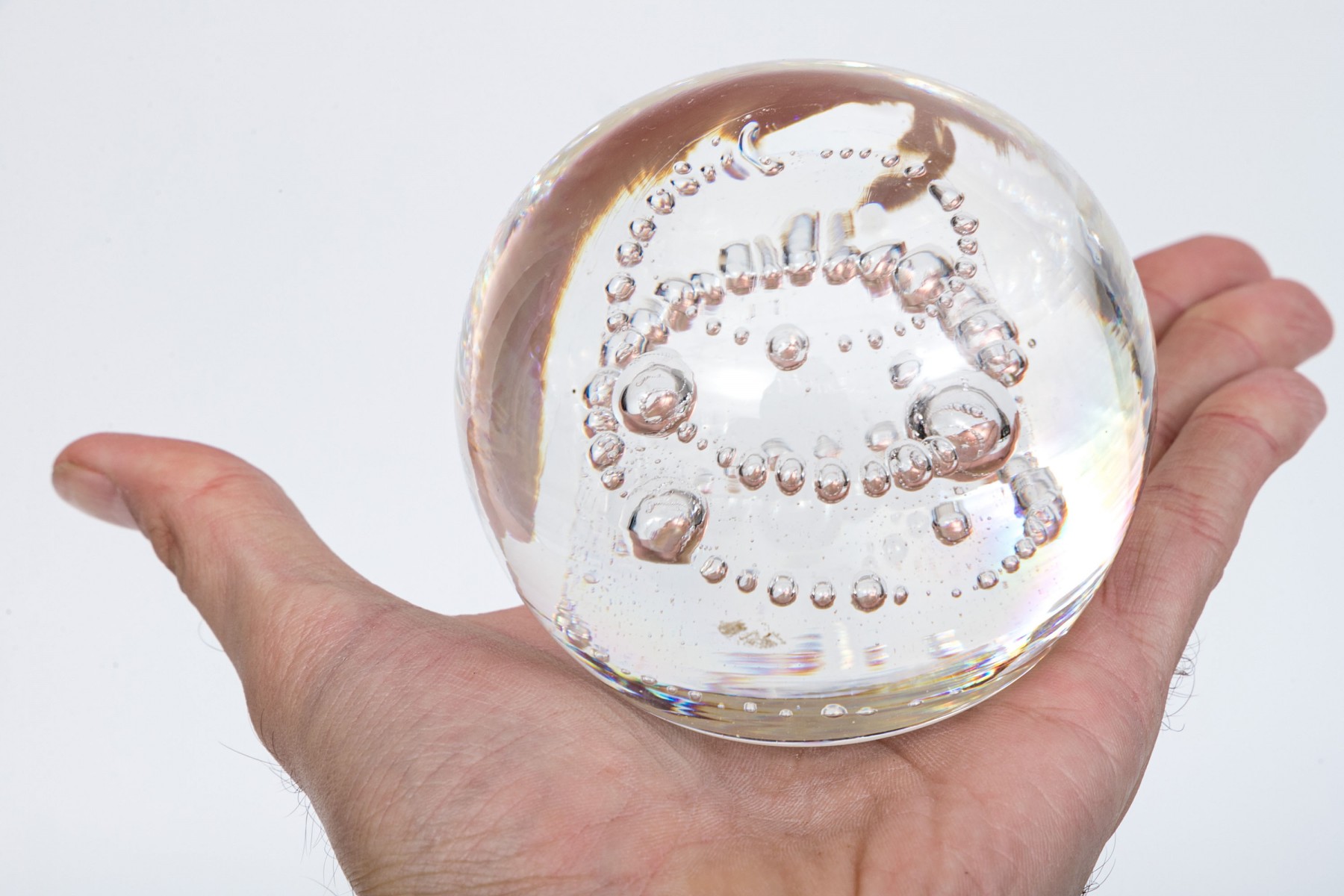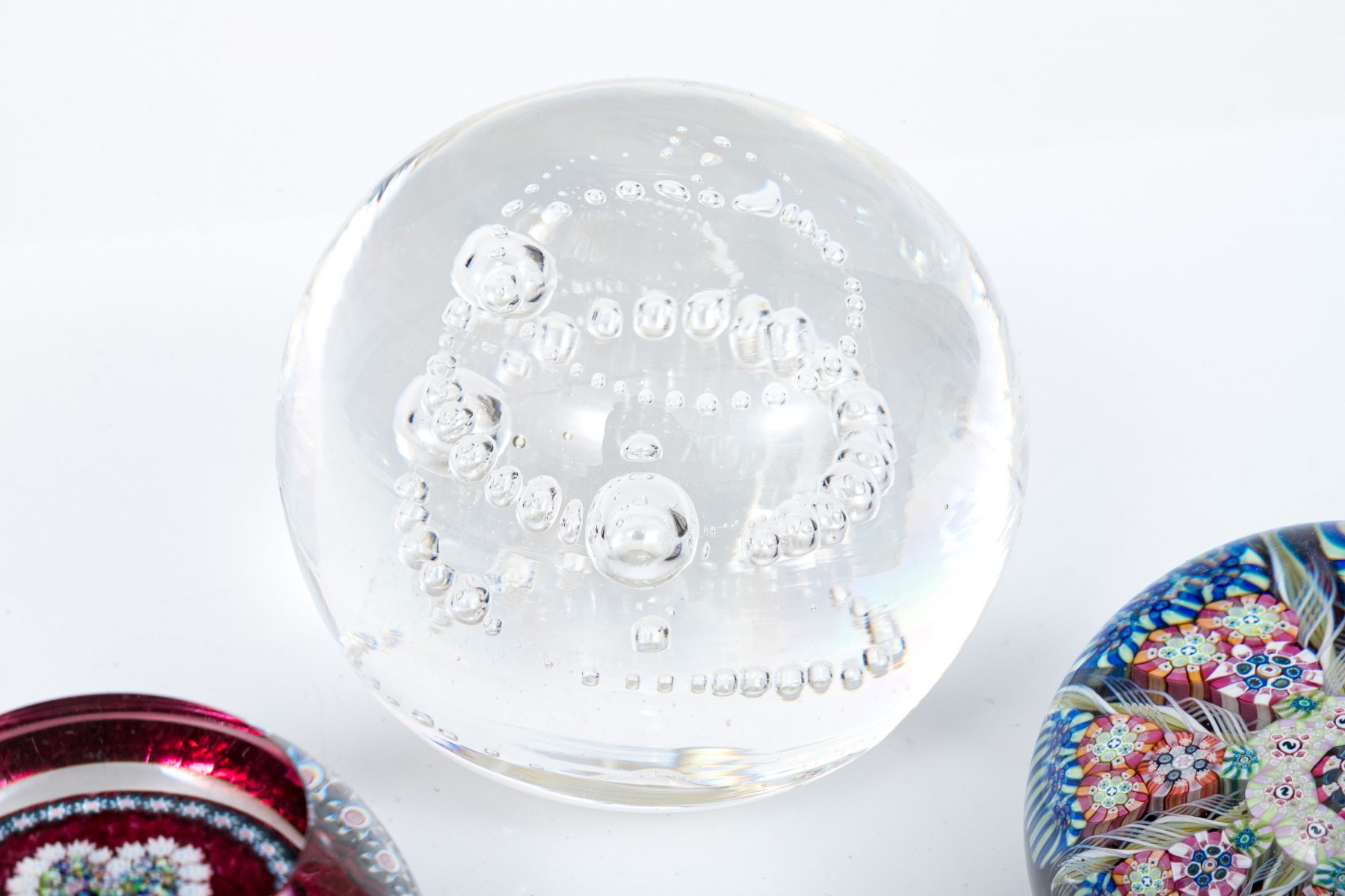 One colorless paperweight with a spiral bubble pattern, 4" DIA x 3 1/4" H