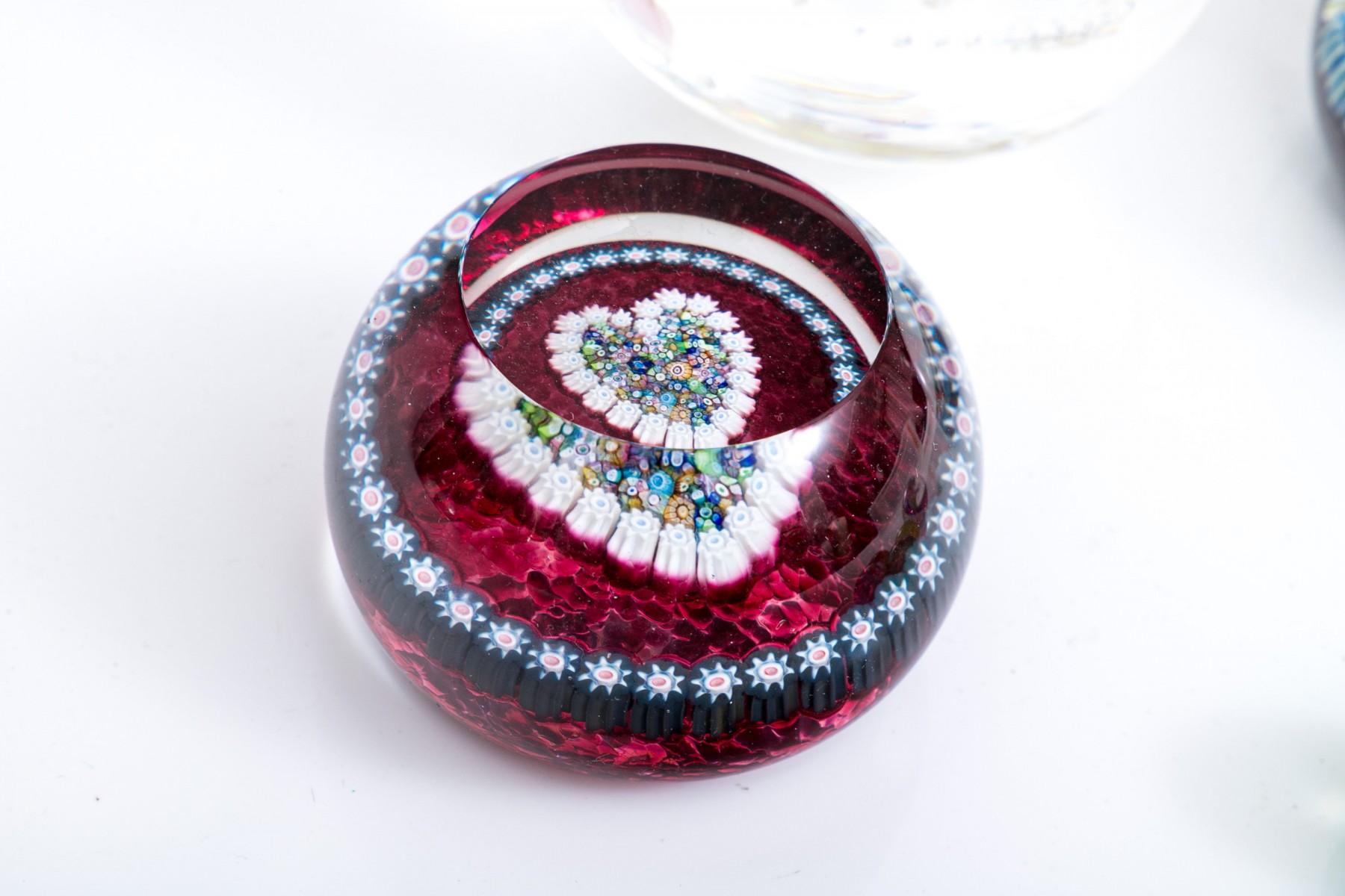 One paperweight in red, blue, white, and multicolored hues having a floral design and a heart in the center