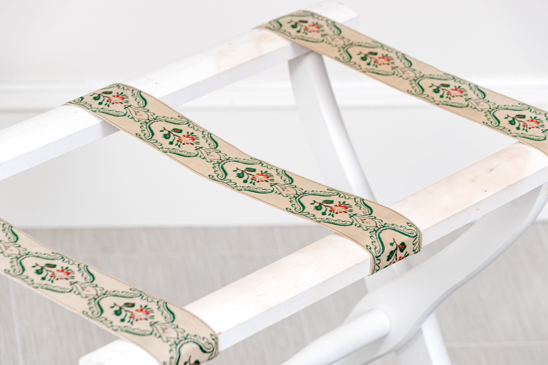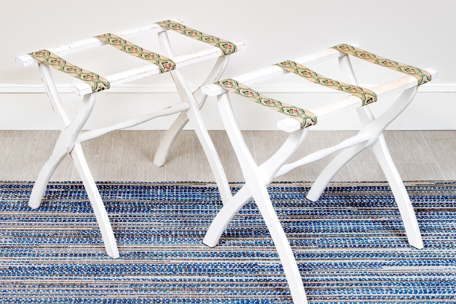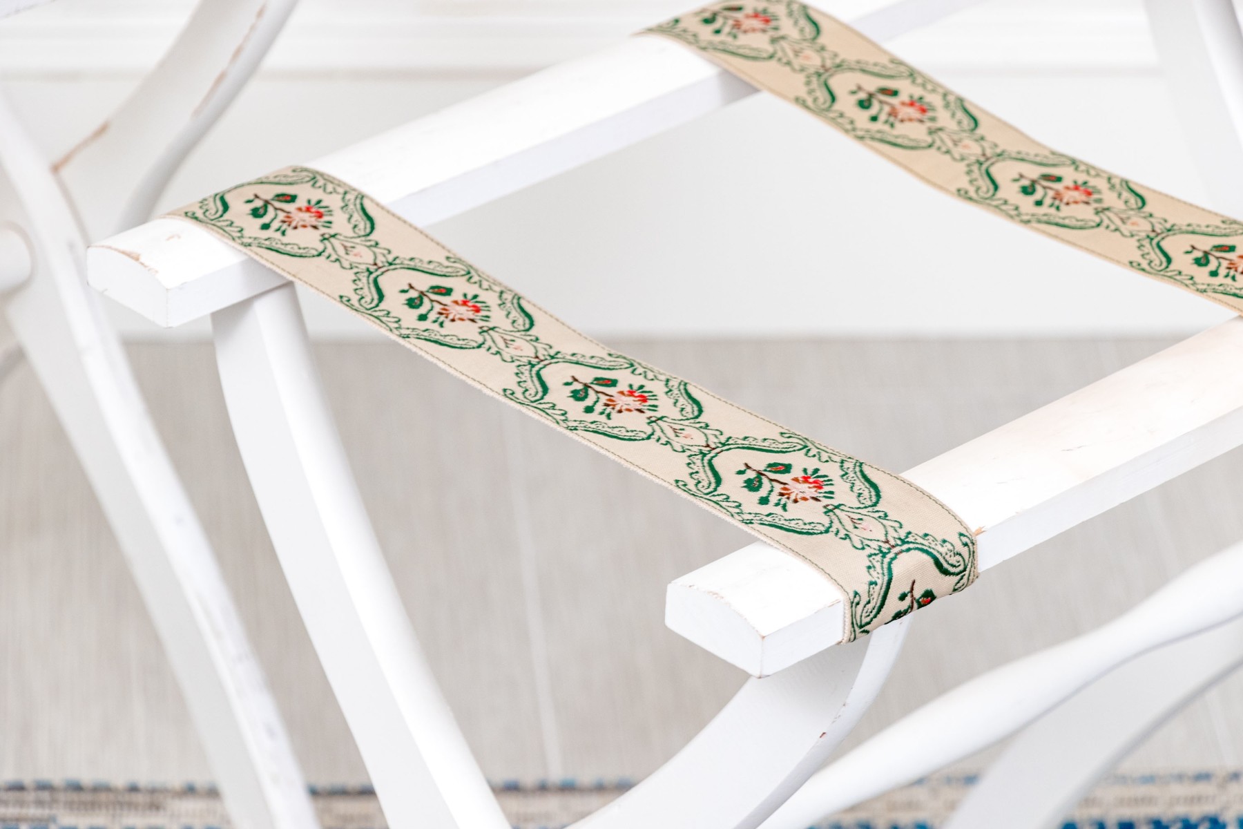 A high quality trio of collapsible luggage racks in traditional form and style, including two in white painted finishes and the third in warm-toned brown. All with three highly decorative straps depicting floral motifs in scrolled medallions.