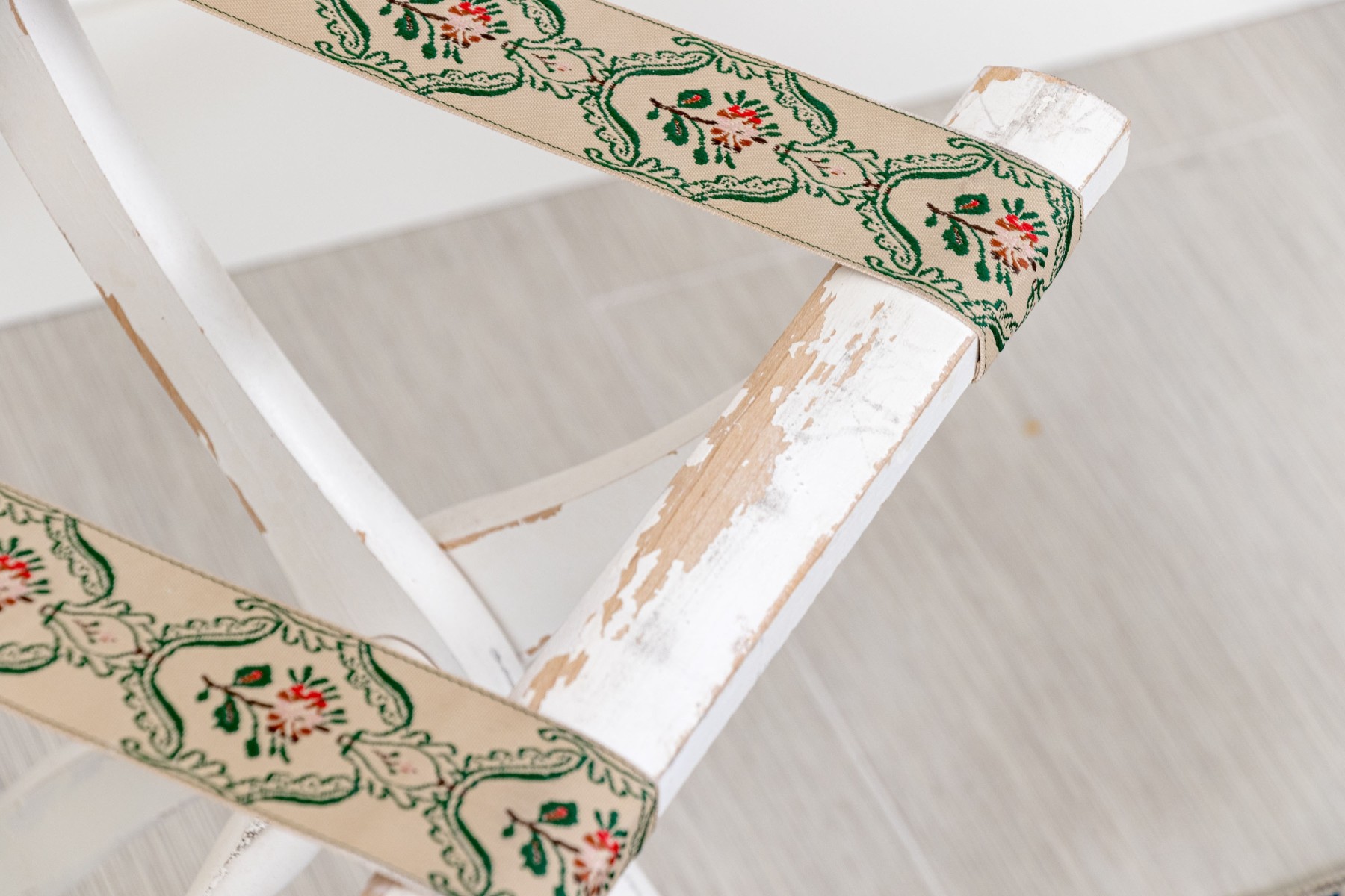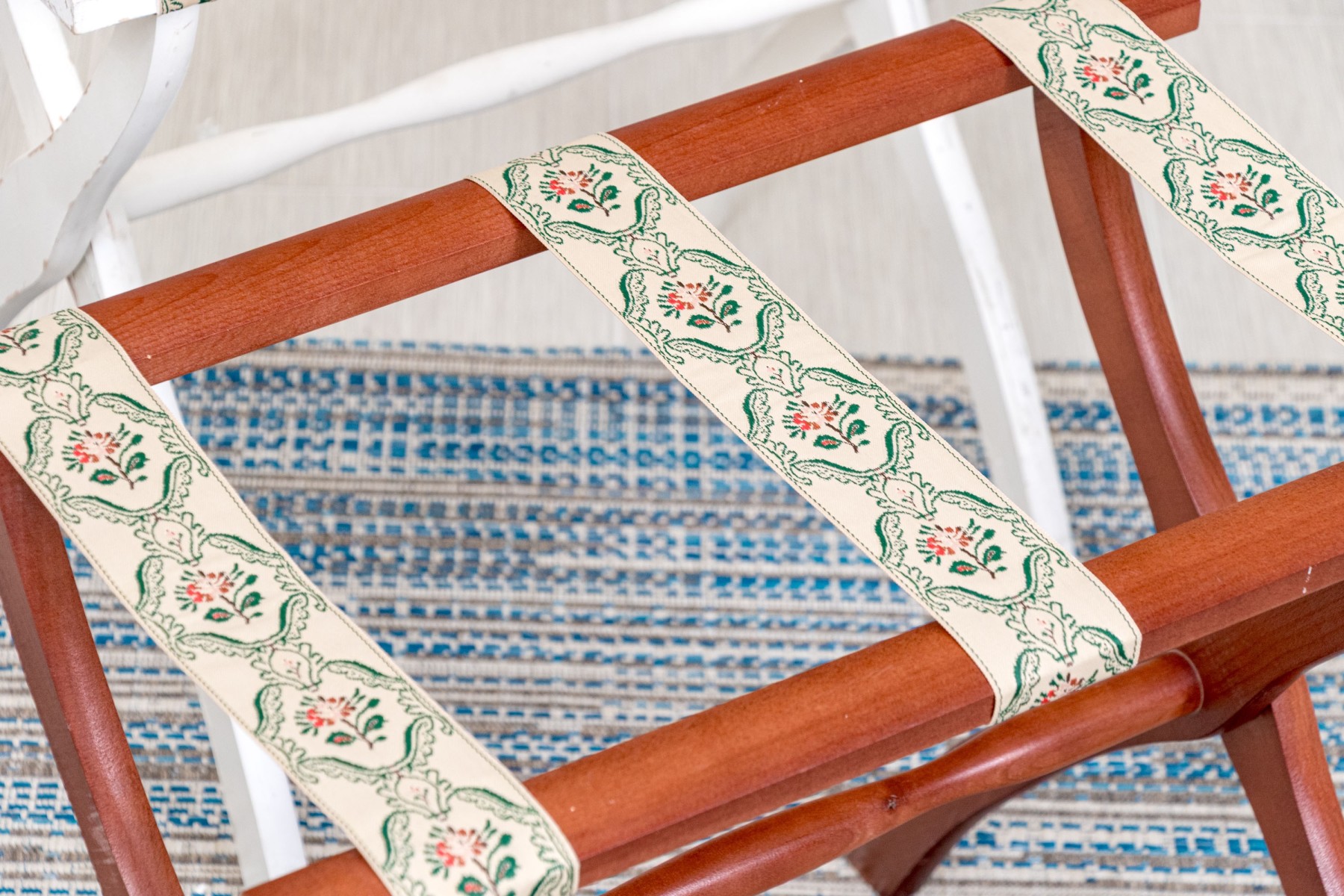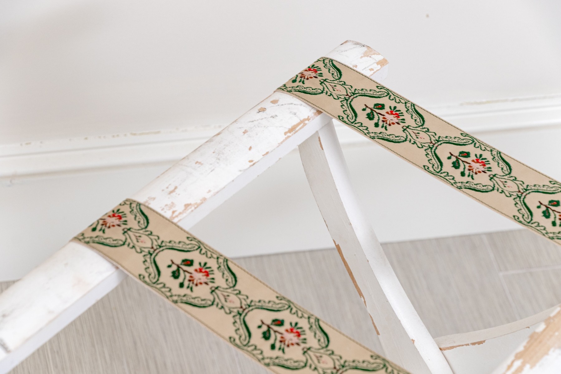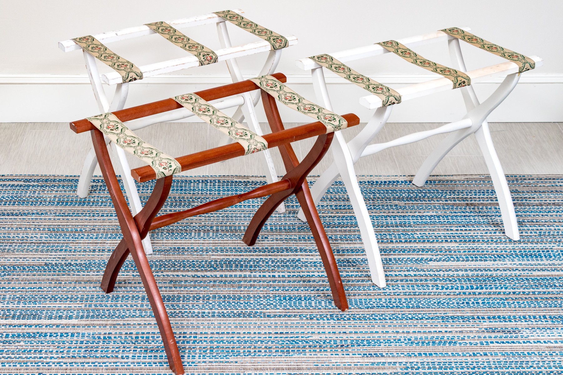 A high quality trio of collapsible luggage racks in traditional form and style, including two in white painted finishes and the third in warm-toned brown. All with three highly decorative straps depicting floral motifs in scrolled medallions.