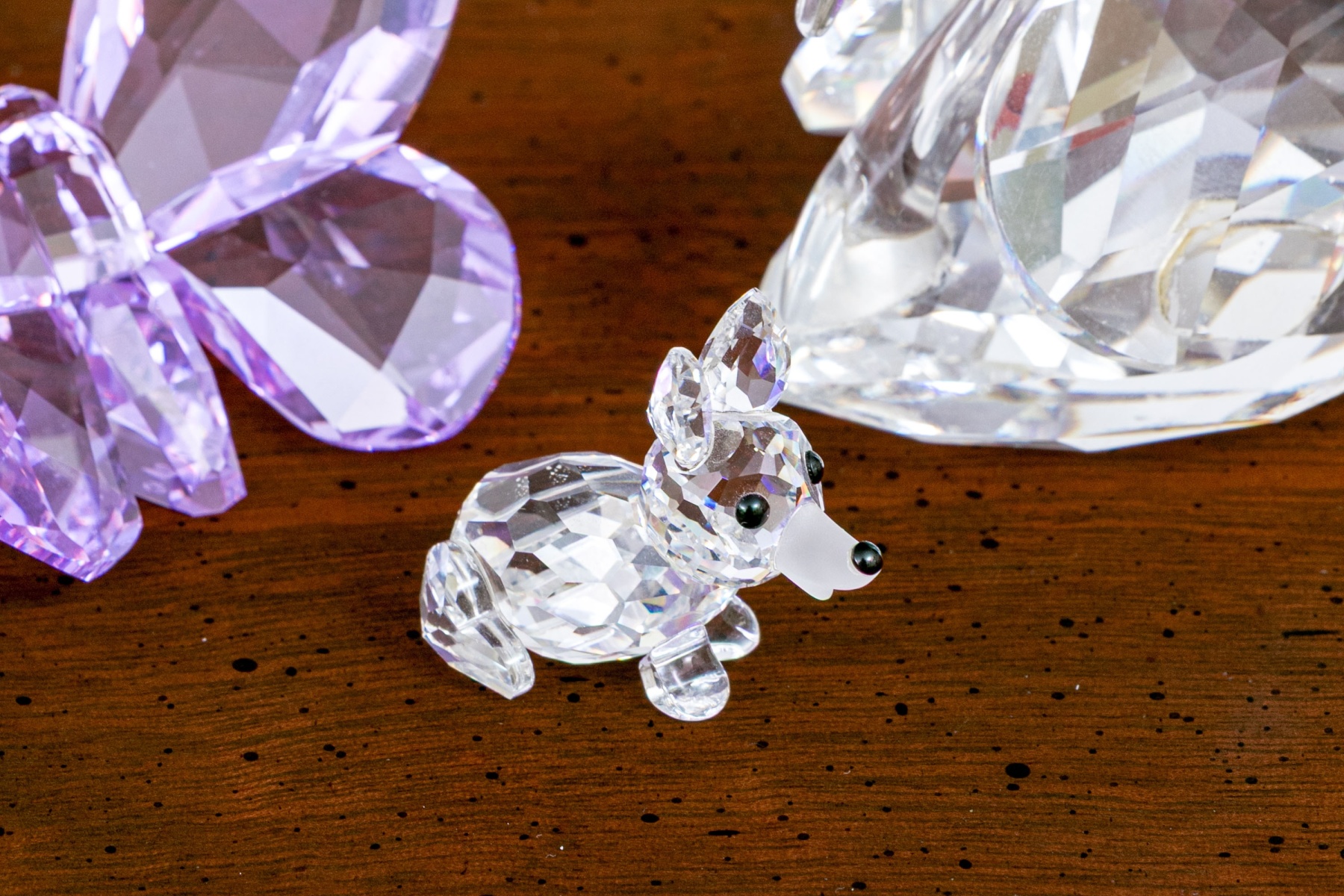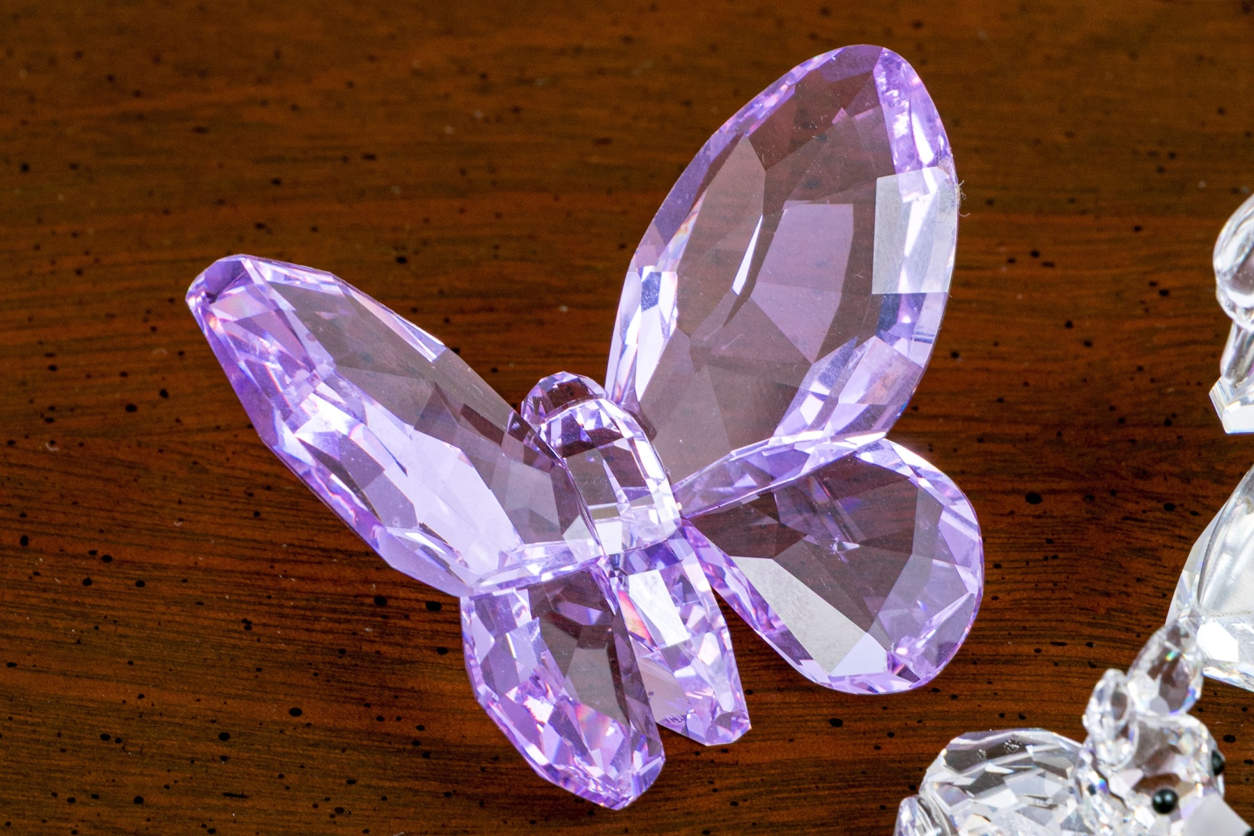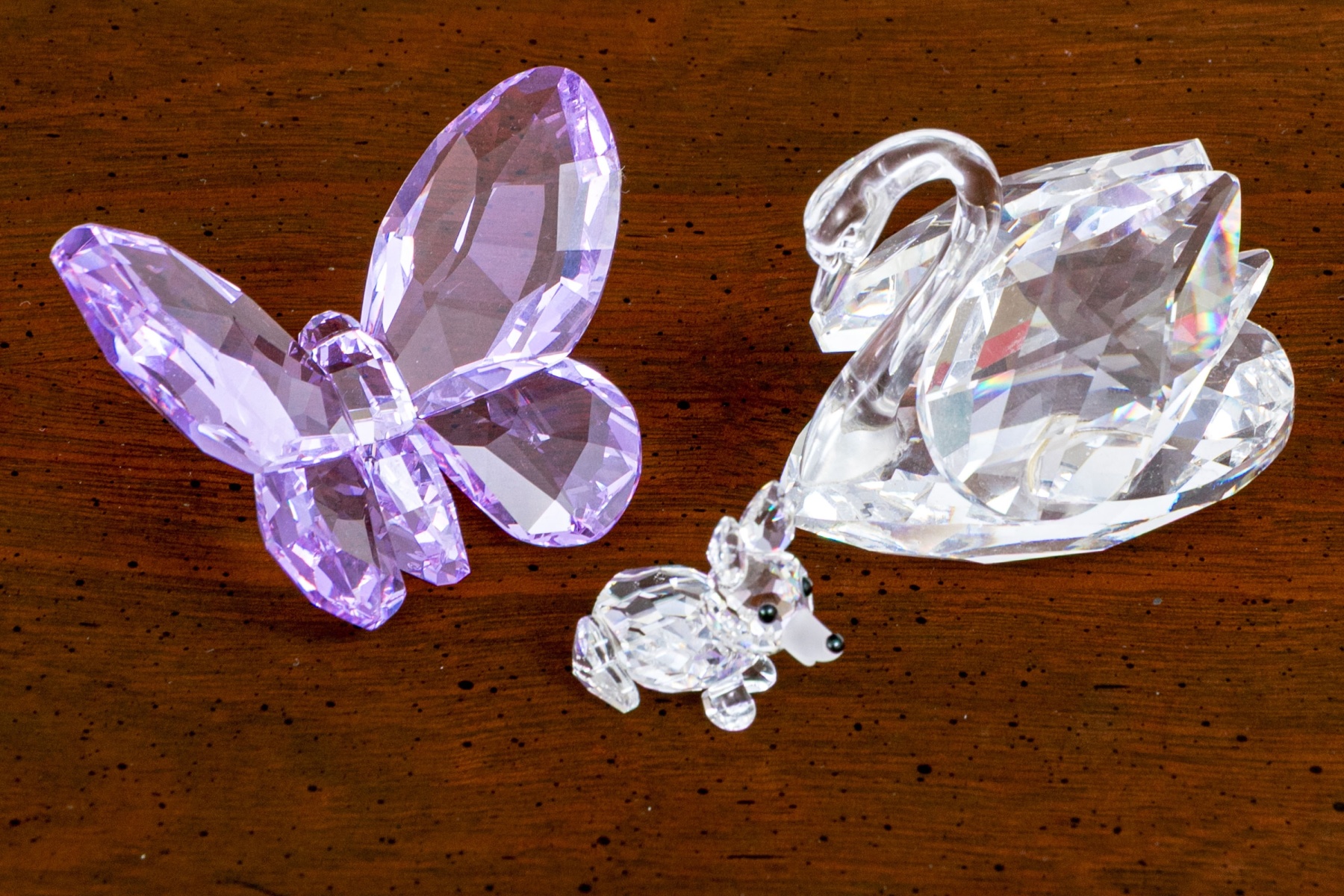 A delightful collection of Swarovski crystal figurines including a purple butterfly, clear swan, and sweet diminutive dog. All beautifully faceted to catch the light in mesmerizing detail.