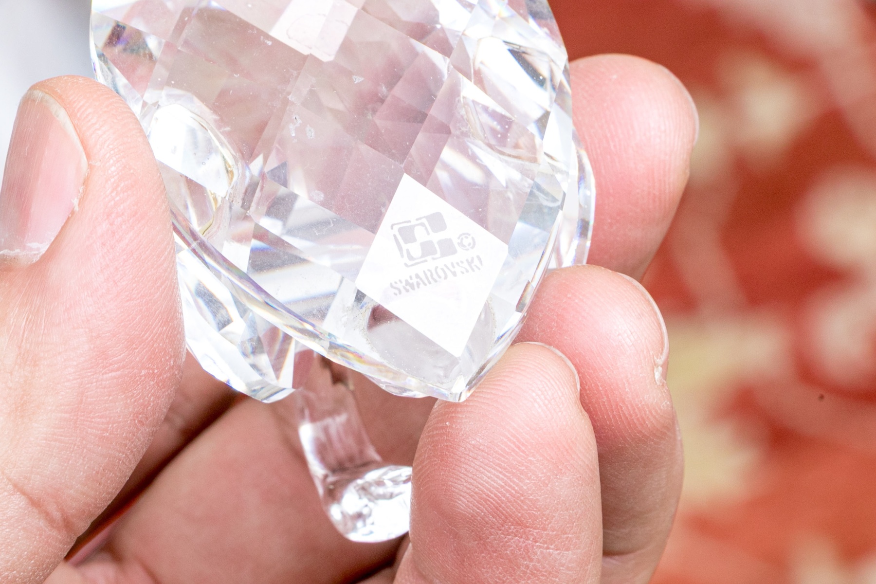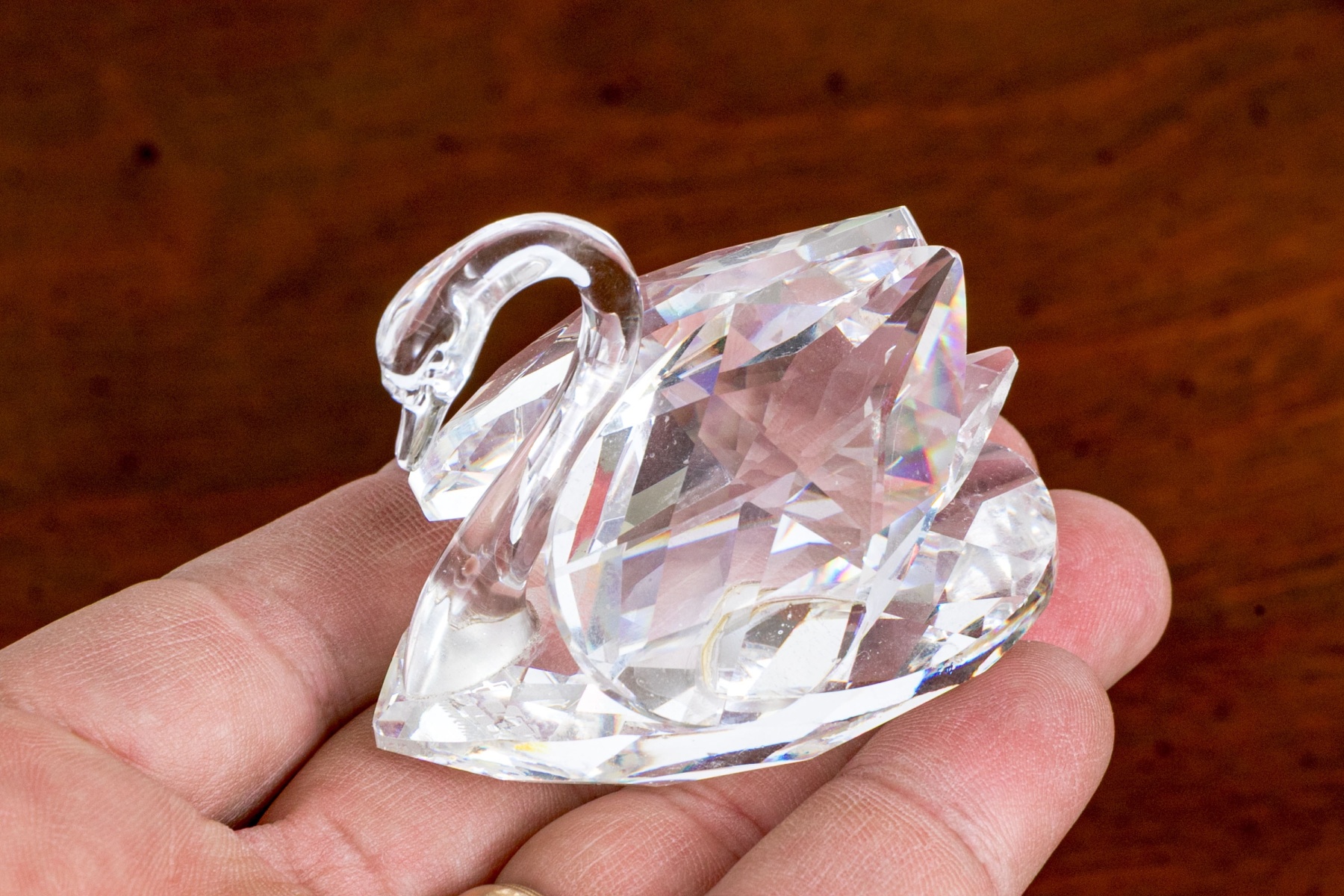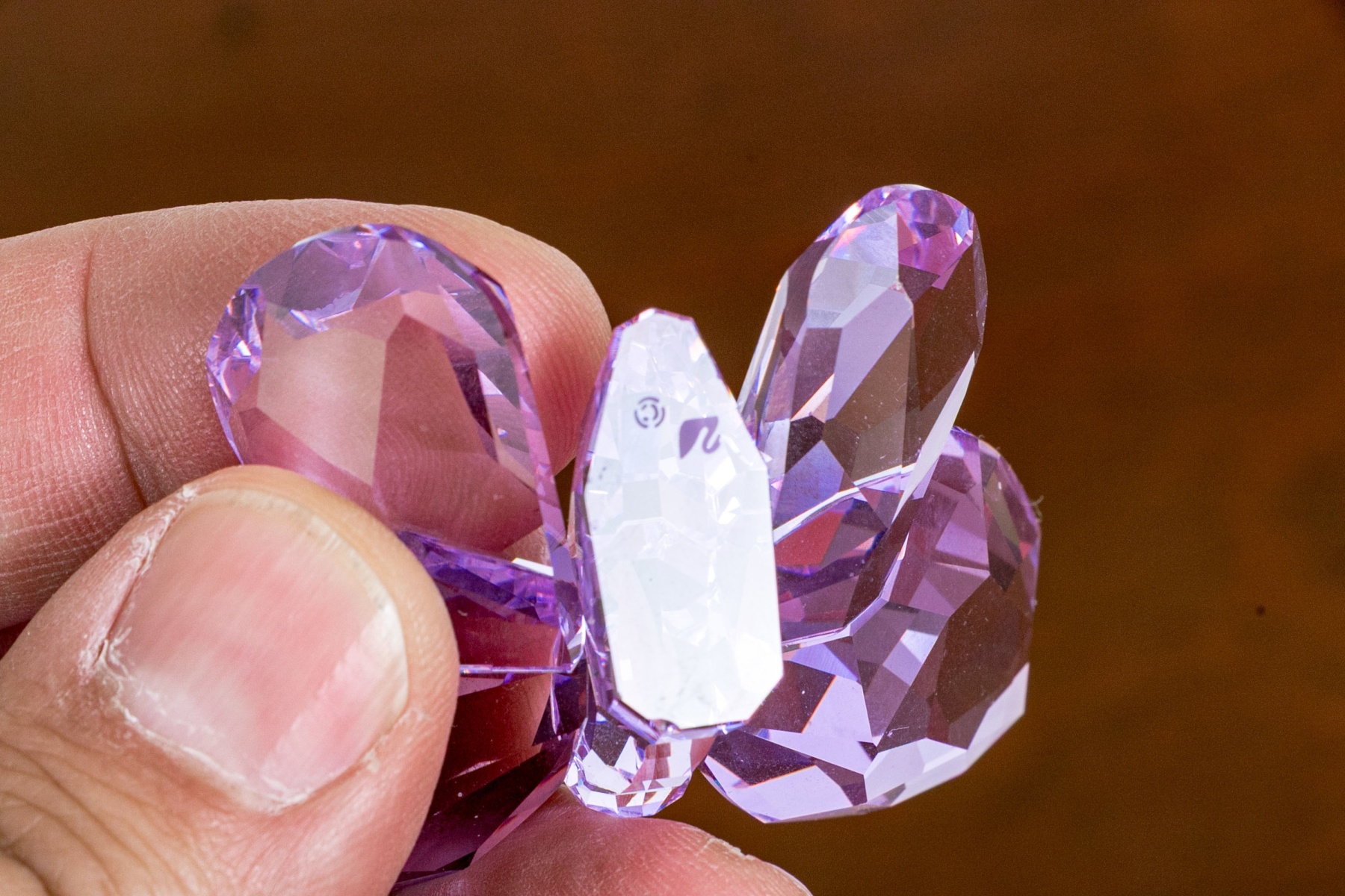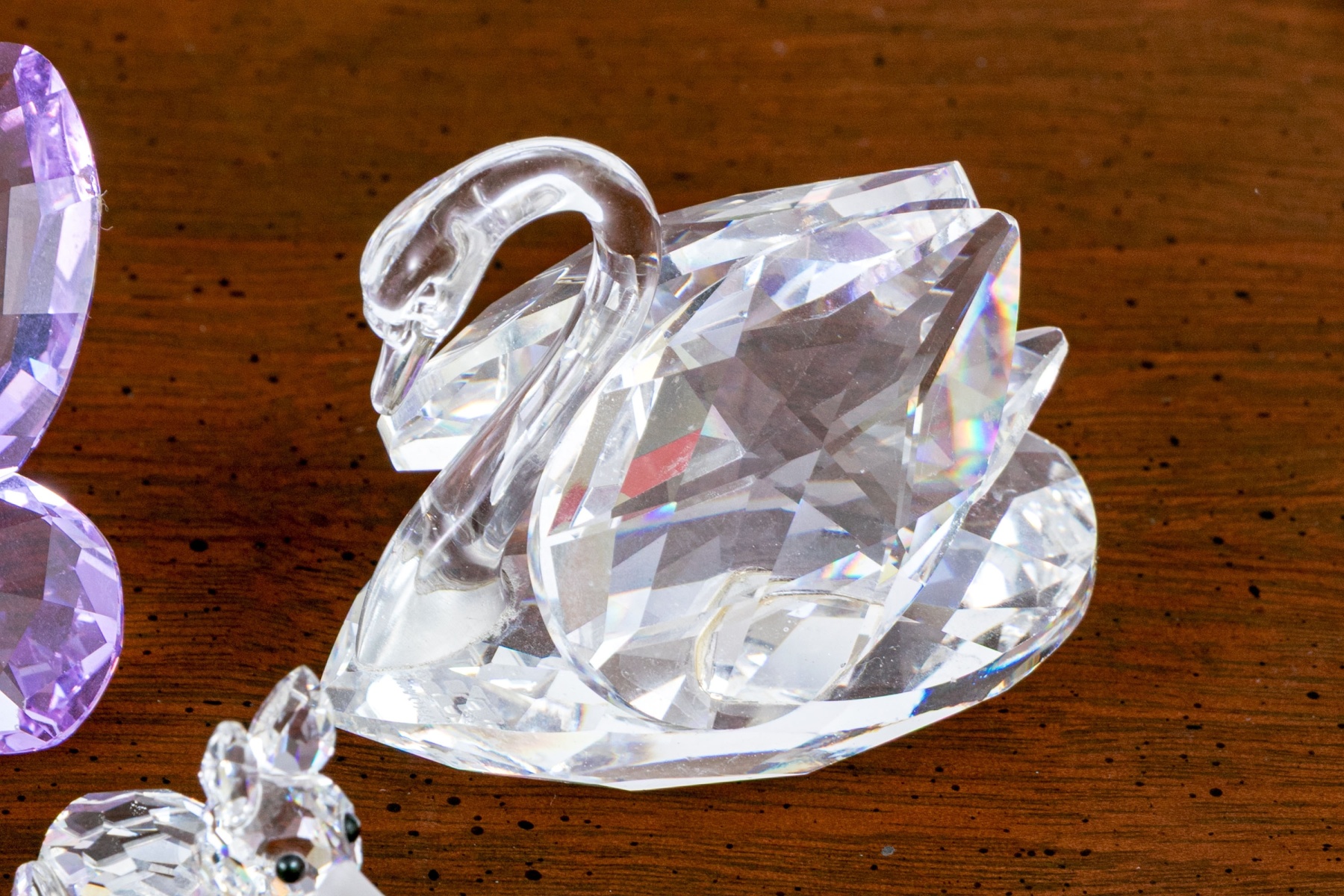 A delightful collection of Swarovski crystal figurines including a purple butterfly, clear swan, and sweet diminutive dog. All beautifully faceted to catch the light in mesmerizing detail.