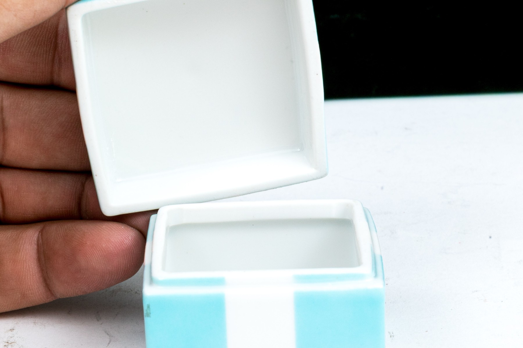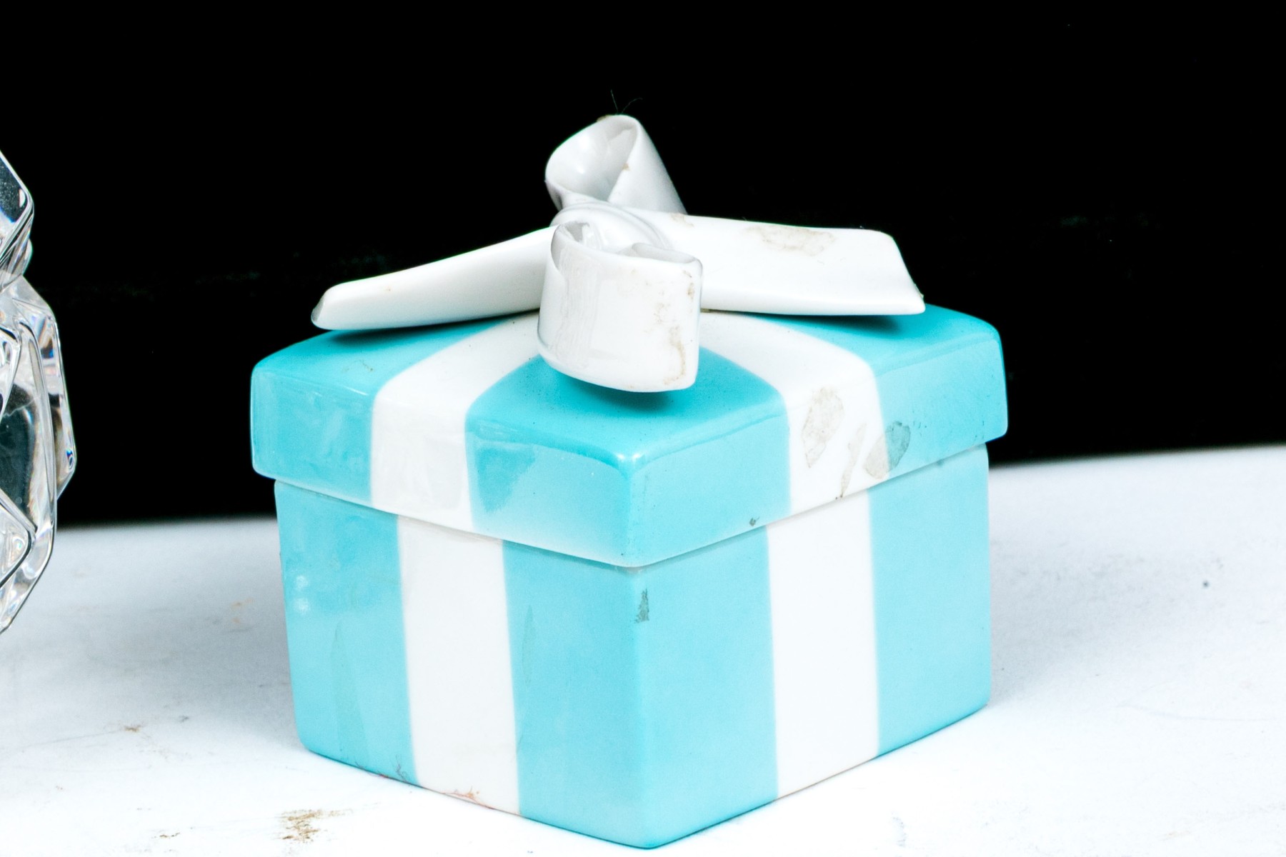 The iconic Tiffany porcelain blue box with white ribbon, 2 1/4" x 2 1/4" x 2 1/4"