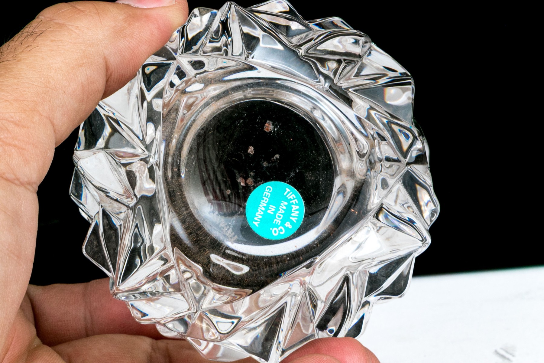 Tiffany German crystal votive holder, with sticker & acid etched on verso, 3 1/4" W x 2 7/8" H