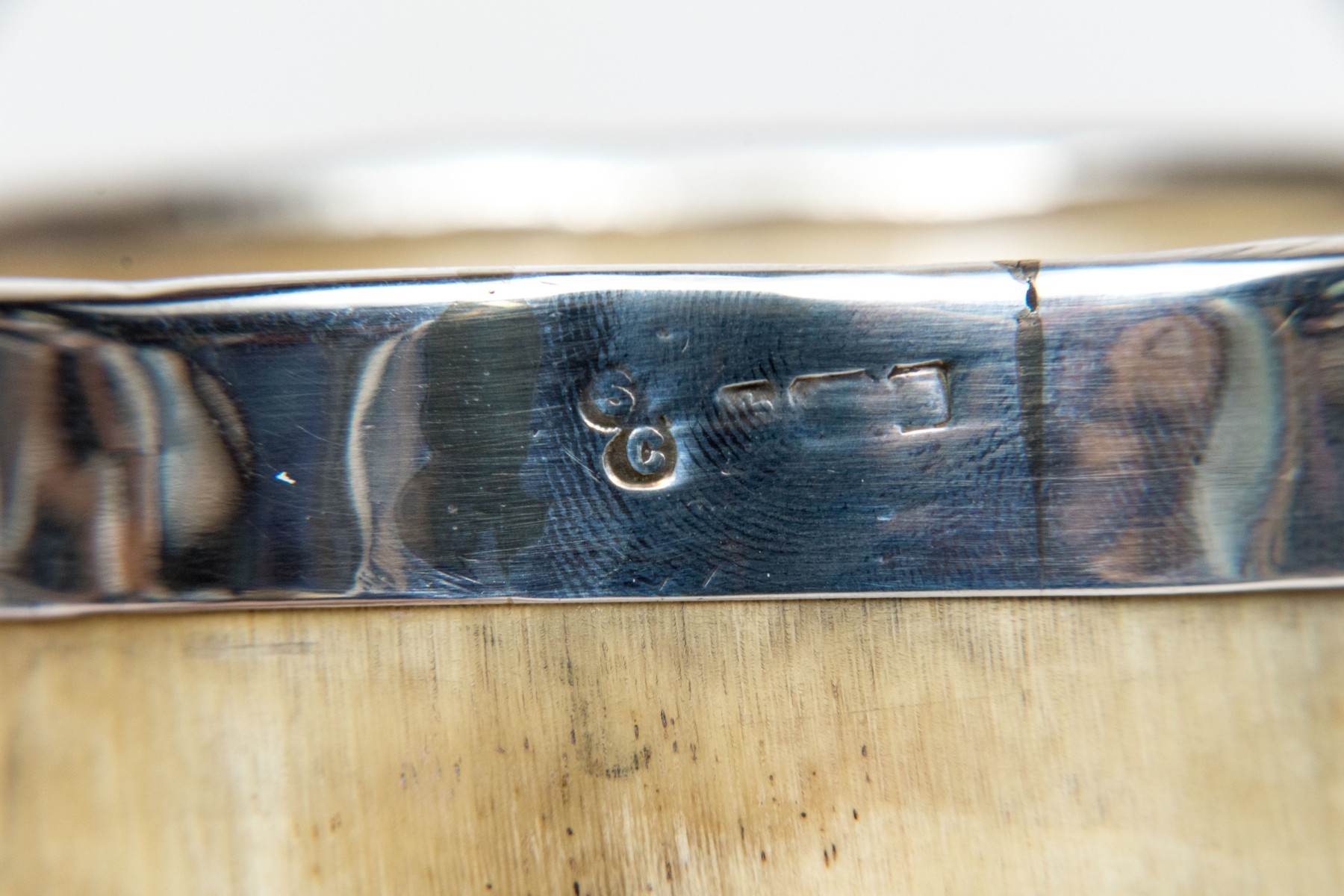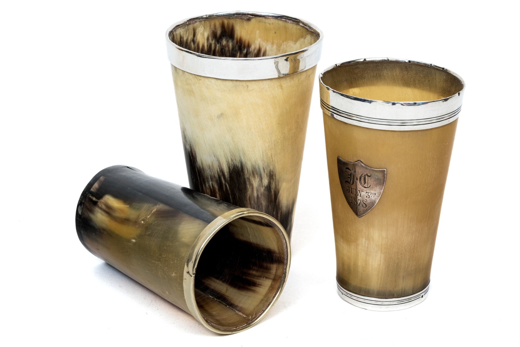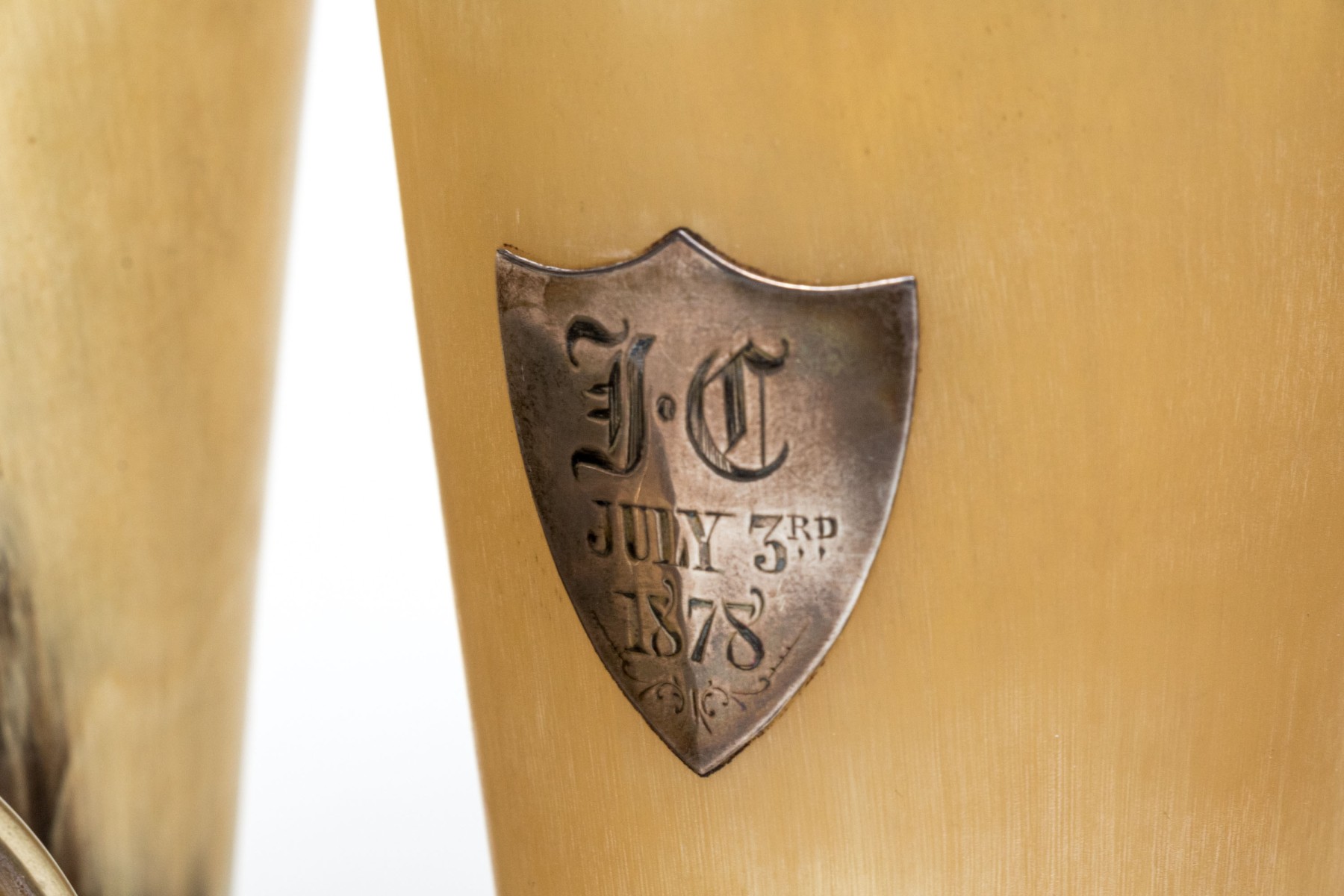 - An English sterling silver reeded rim and base mounts and a golden shield motif dated 1878.